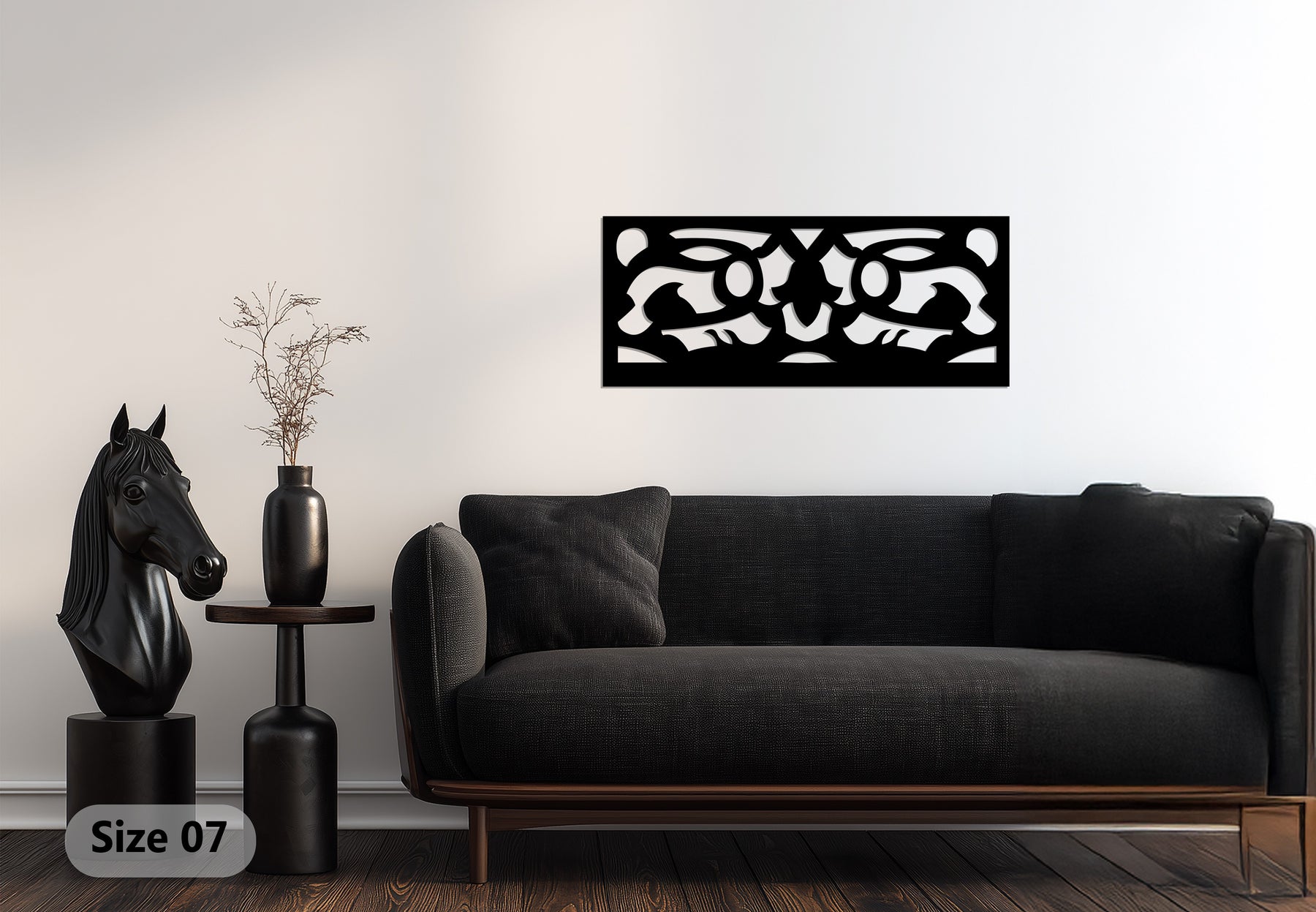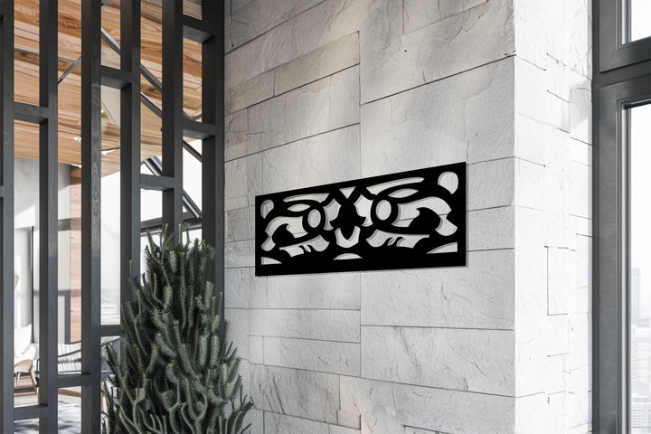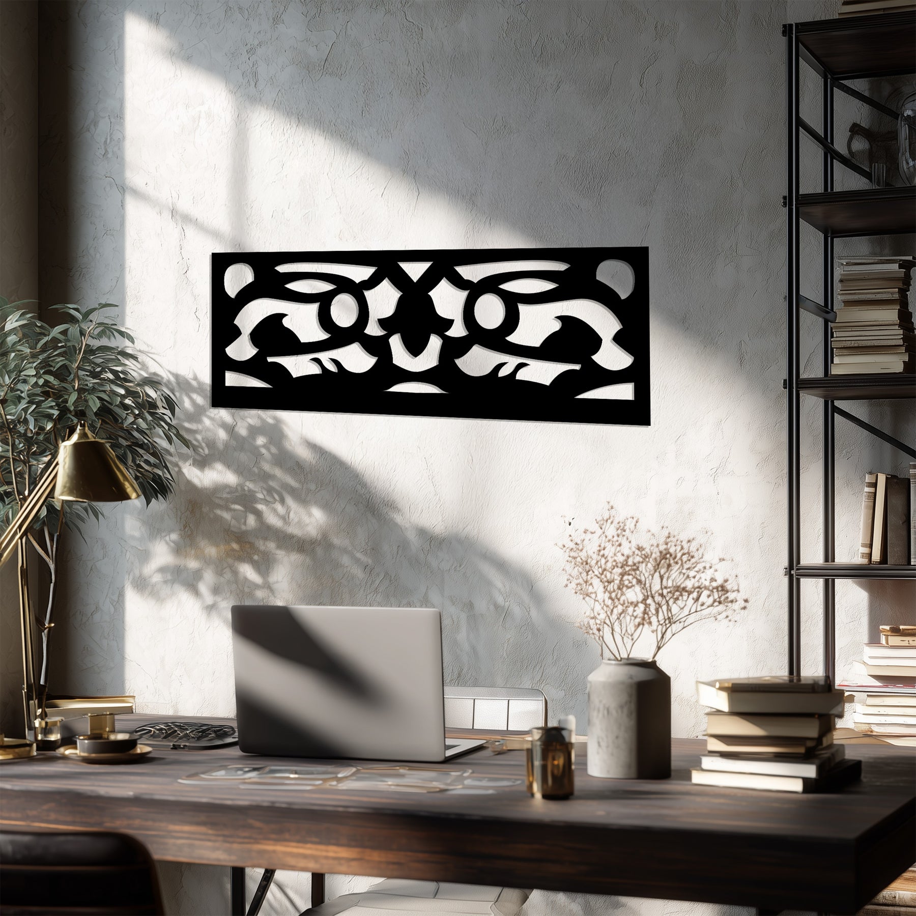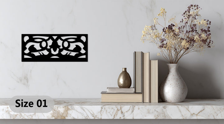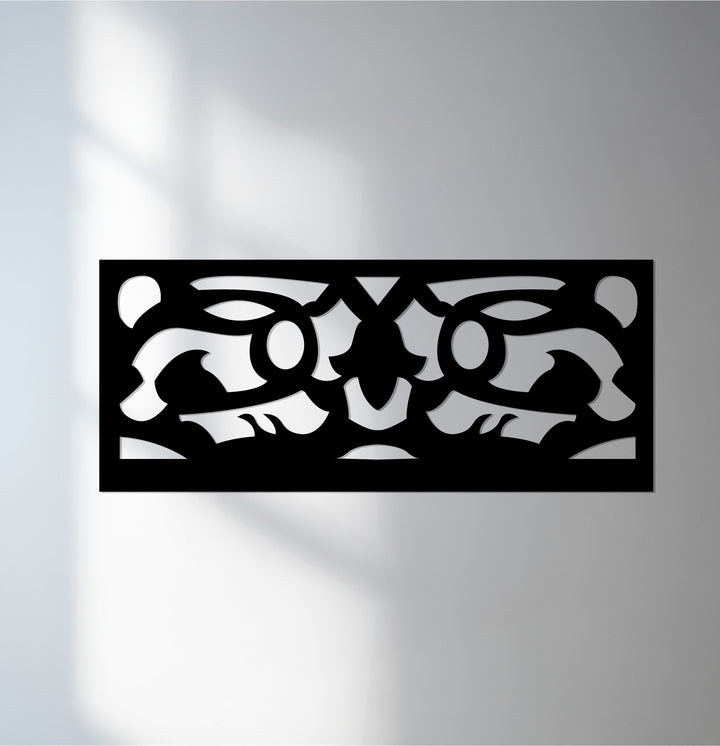 مصنوعة ببراعة بتقنية القطع بالليزر من معدن متين ومطلية باللون الأسود غير اللامع الأنيق، تُعد هذه القطعة إضافة مثالية لغرف المعيشة والمكاتب والممرات أو التصاميم الداخلية البسيطة. يضفي تصميمها الهندسي البسيط لمسة من التباين والرقي، محولاً جدارك إلى تحفة فنية معمارية.