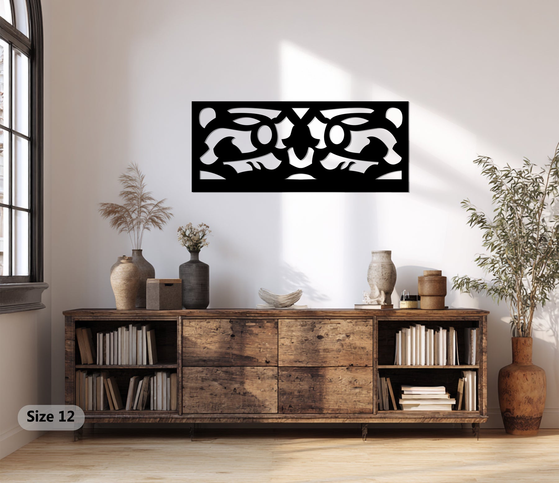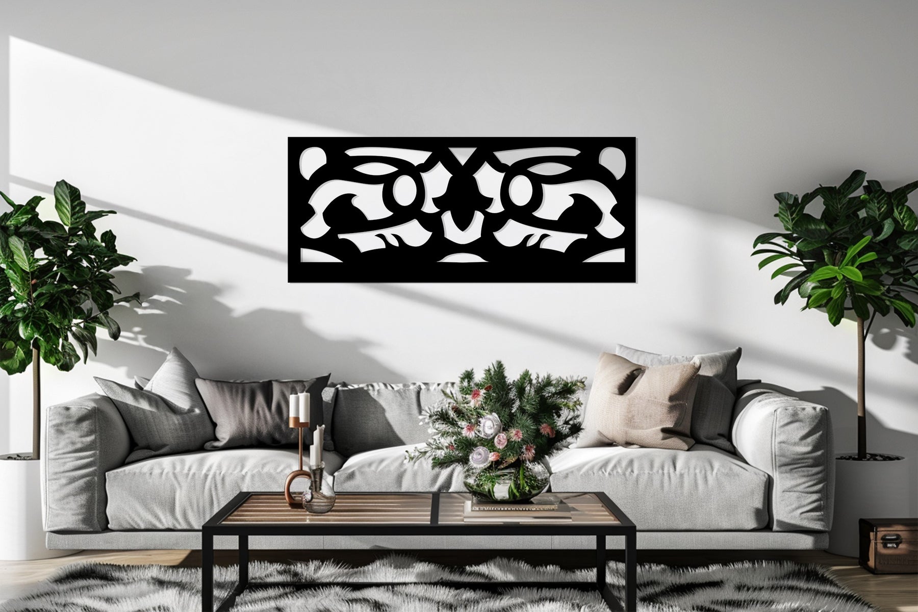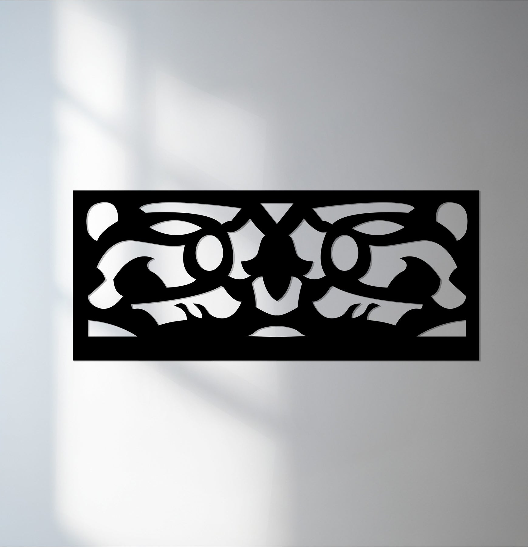 مصنوعة ببراعة بتقنية القطع بالليزر من معدن متين ومطلية باللون الأسود غير اللامع الأنيق، تُعد هذه القطعة إضافة مثالية لغرف المعيشة والمكاتب والممرات أو التصاميم الداخلية البسيطة. يضفي تصميمها الهندسي البسيط لمسة من التباين والرقي، محولاً جدارك إلى تحفة فنية معمارية.
