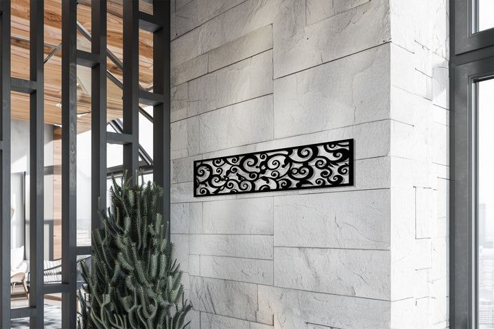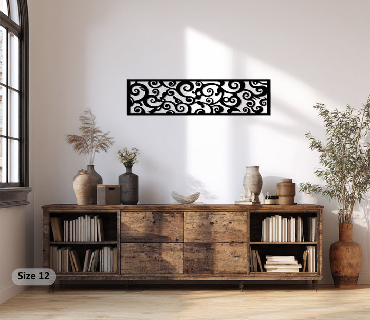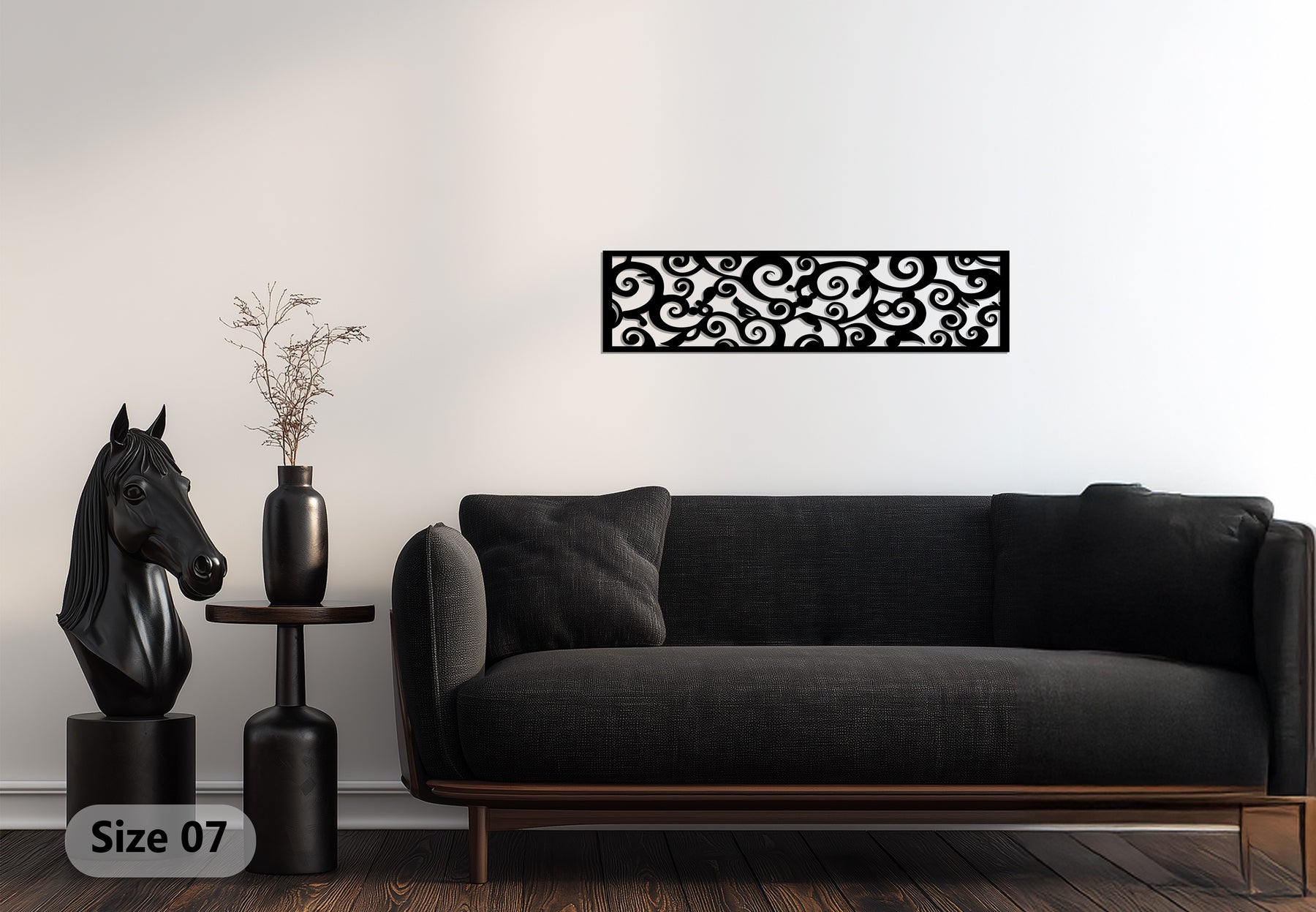 حوّل جدرانك بجمال خالد من دوامة حرفية – زخارف حلزونية فن جداري معدني لوحةيتميز هذا التصميم الأفقي الرائع بأنماط حلزونية معقدة مستوحاة من الأعمال الحديدية الكلاسيكية، حيث يمزج بين التقاليد الفنية والحرفية الحديثة.