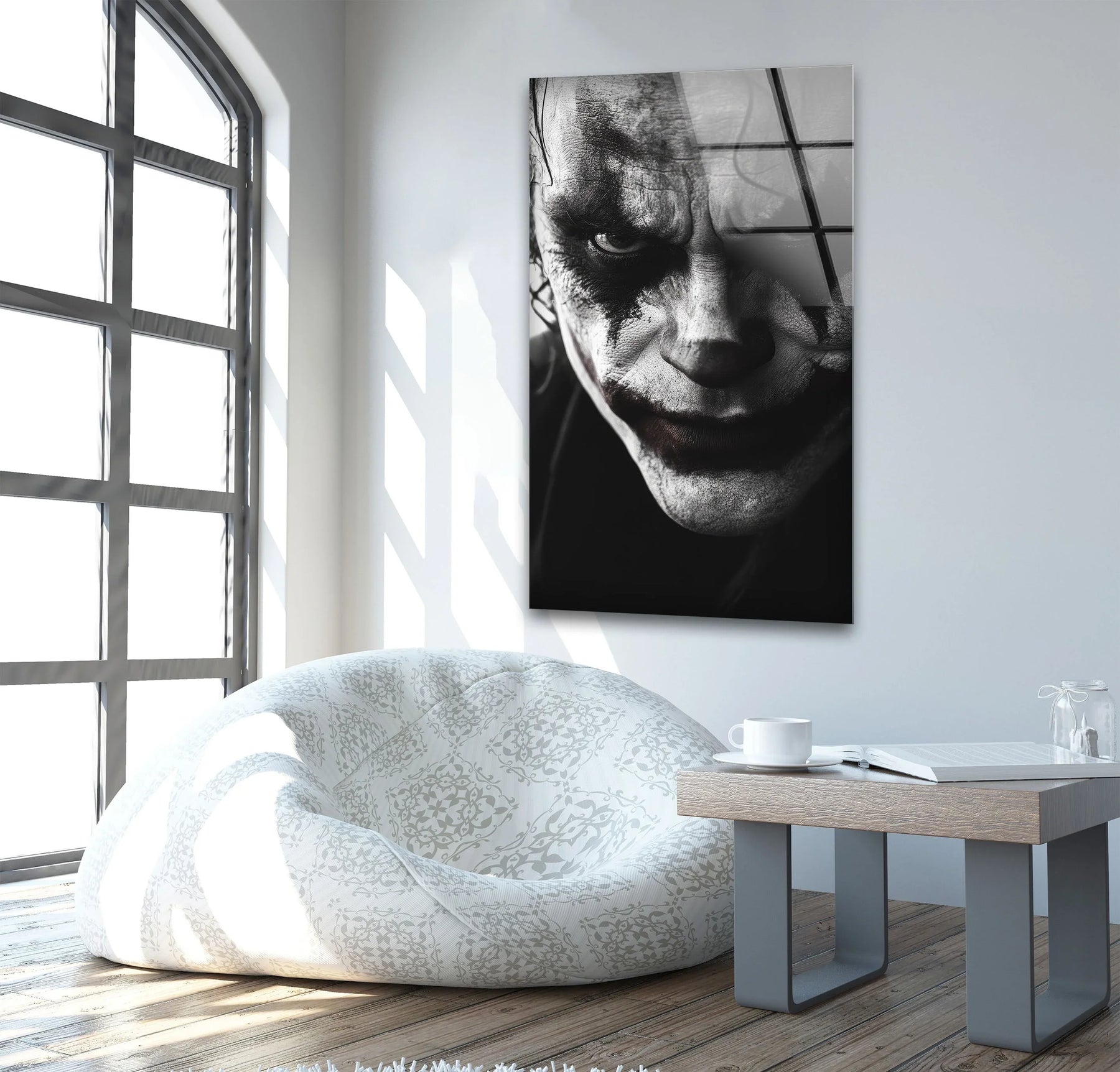 This striking glass wall art captures a haunting close-up of a dark clown figure with a piercing gaze and dramatic facial contrast. The intense expression, smeared makeup, and shadowed details create a powerful and unsettling composition that instantly draws attention.