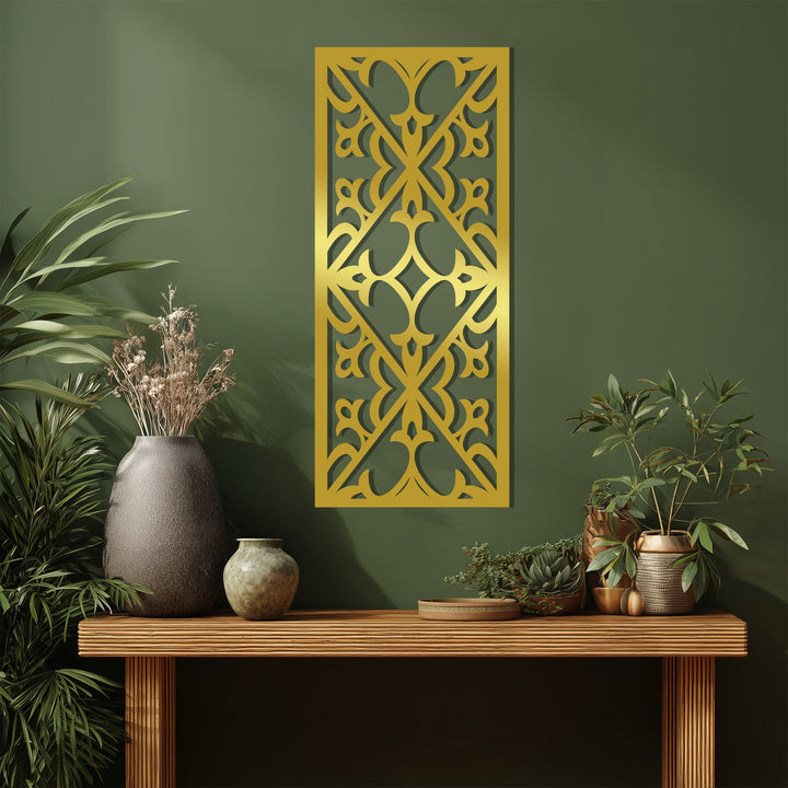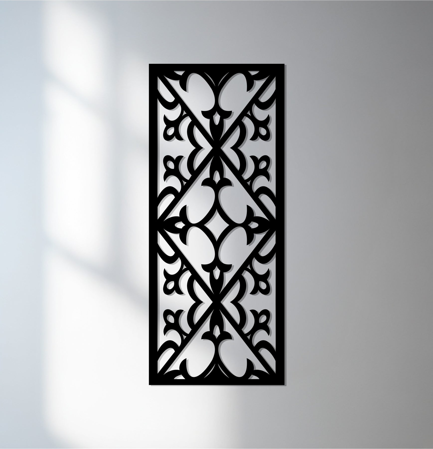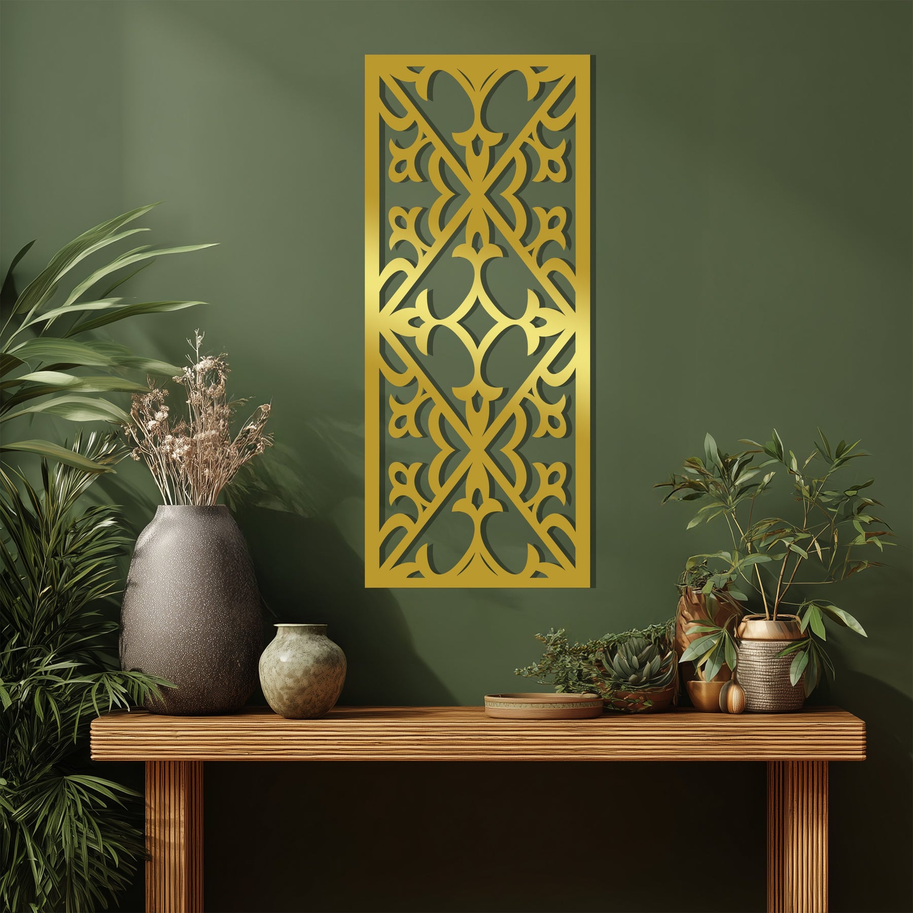 أضف لمسة من الأناقة الراقية والجمال المعماري إلى منزلك مع التناظر الإلهي – الهندسة الزخرفية فن جداري معدنيتتميز هذه التحفة الفنية العمودية بترتيب معقد من المنحنيات المتدفقة والزخارف المتناظرة، مما يرمز إلى الانسجام والرقي الخالد.