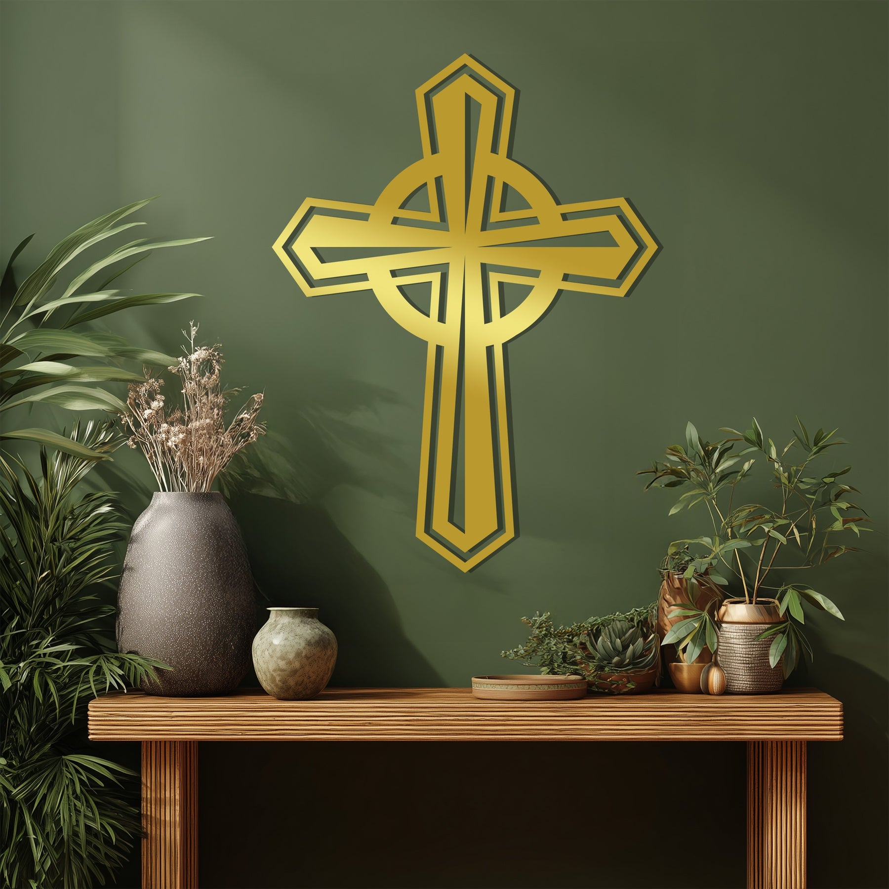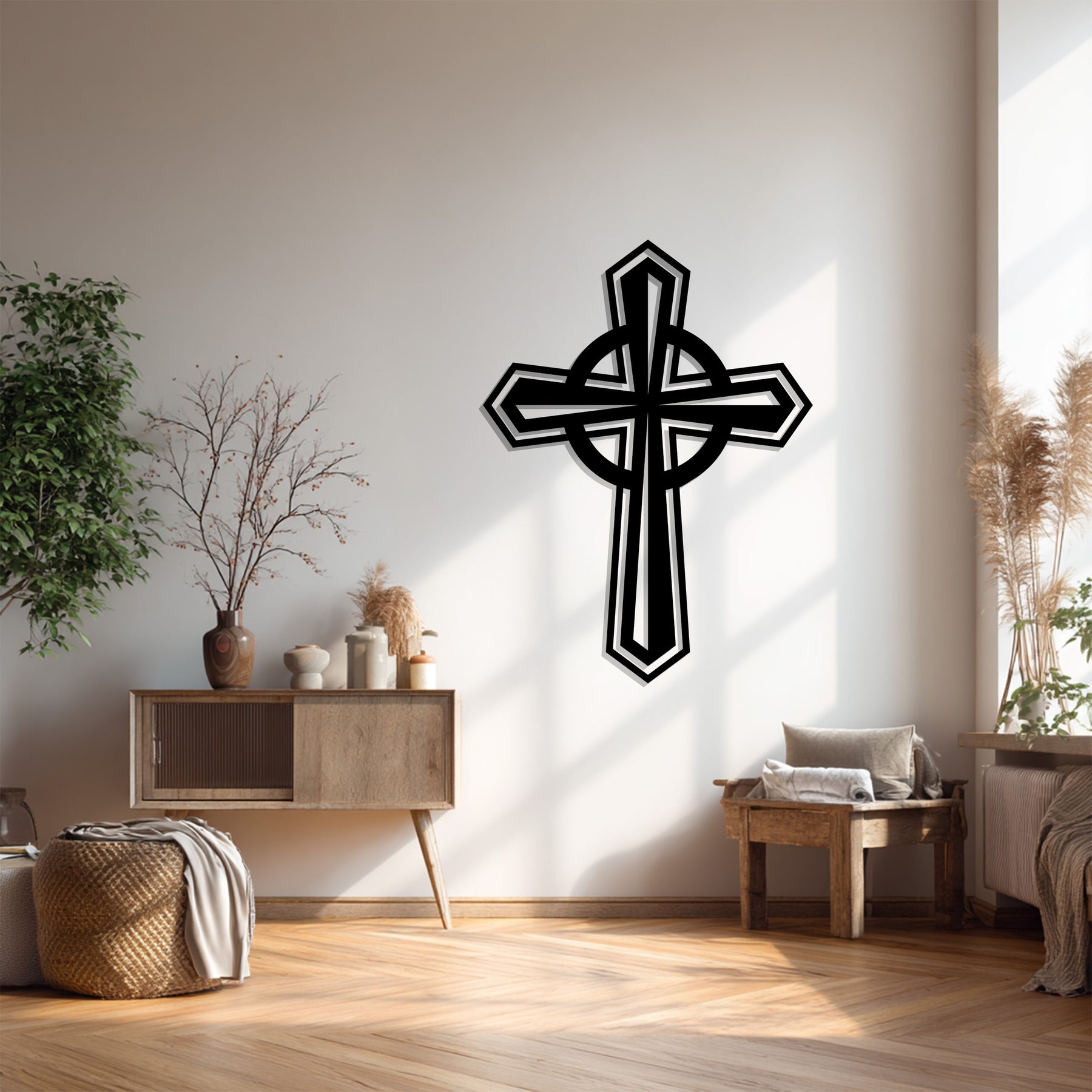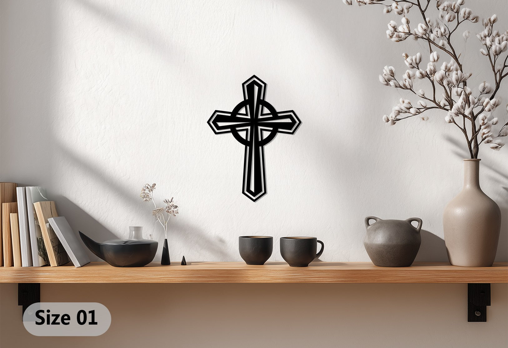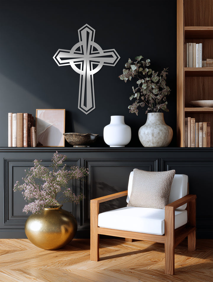 احتفل بتناغم الإيمان والفن مع الوحدة الأبدية فن جداري معدنيتتميز هذه القطعة الفضية الرائعة بتصميم صليب مستوحى من الفن السلتي، متشابك مع أشكال هندسية دائرية، يرمز إلى الخلود والتوازن والوحدة الإلهية. تضفي الخطوط الجريئة المصقولة عمقًا روحيًا ورقيًا عصريًا على أي ديكور داخلي.