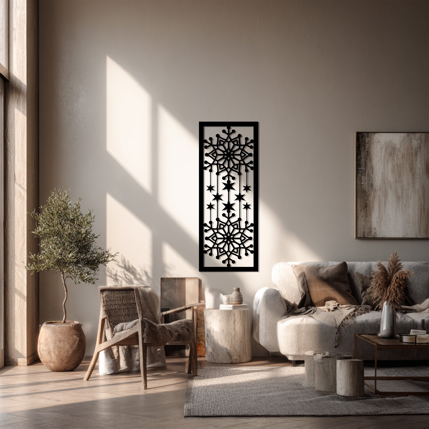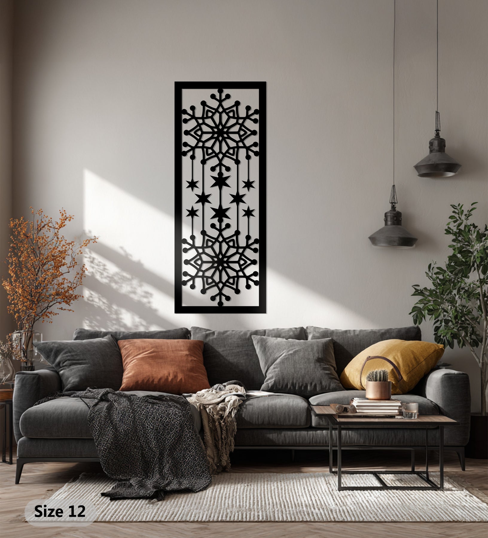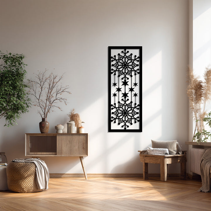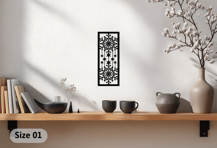أضف لمسة من الأناقة الباردة إلى منزلك مع ندفة ثلج متساقطة فن جداري معدنيتُبرز هذه القطعة الفنية الجميلة رقاقات ثلج متناظرة متصلة بنجوم متساقطة، ترمز إلى انسجام الشتاء وسحر السماء. شكلها العمودي يجعلها إضافة رائعة للجدران الضيقة، أو المداخل، أو فوق المواقد خلال موسم الأعياد.