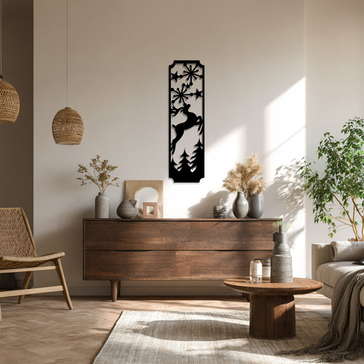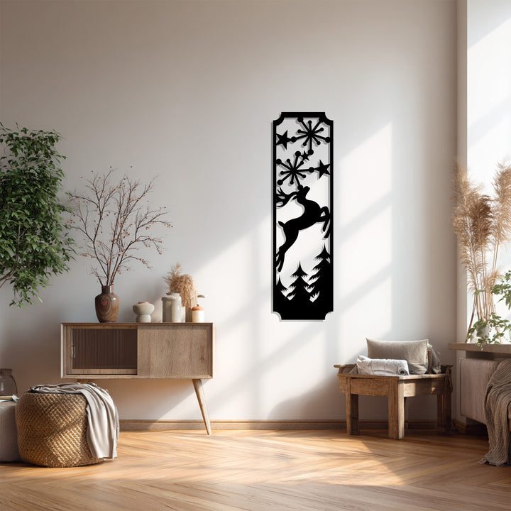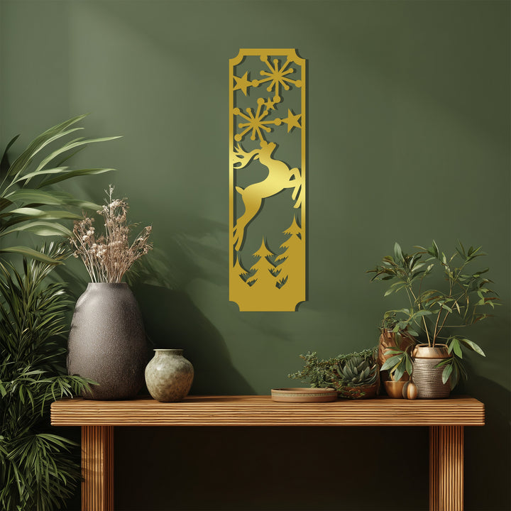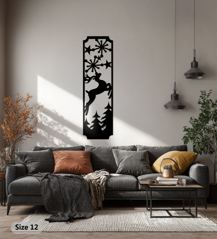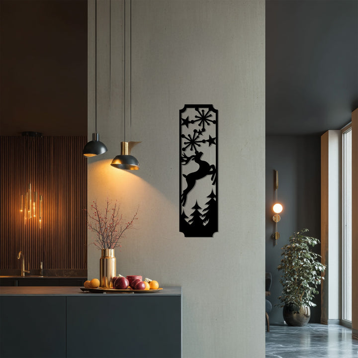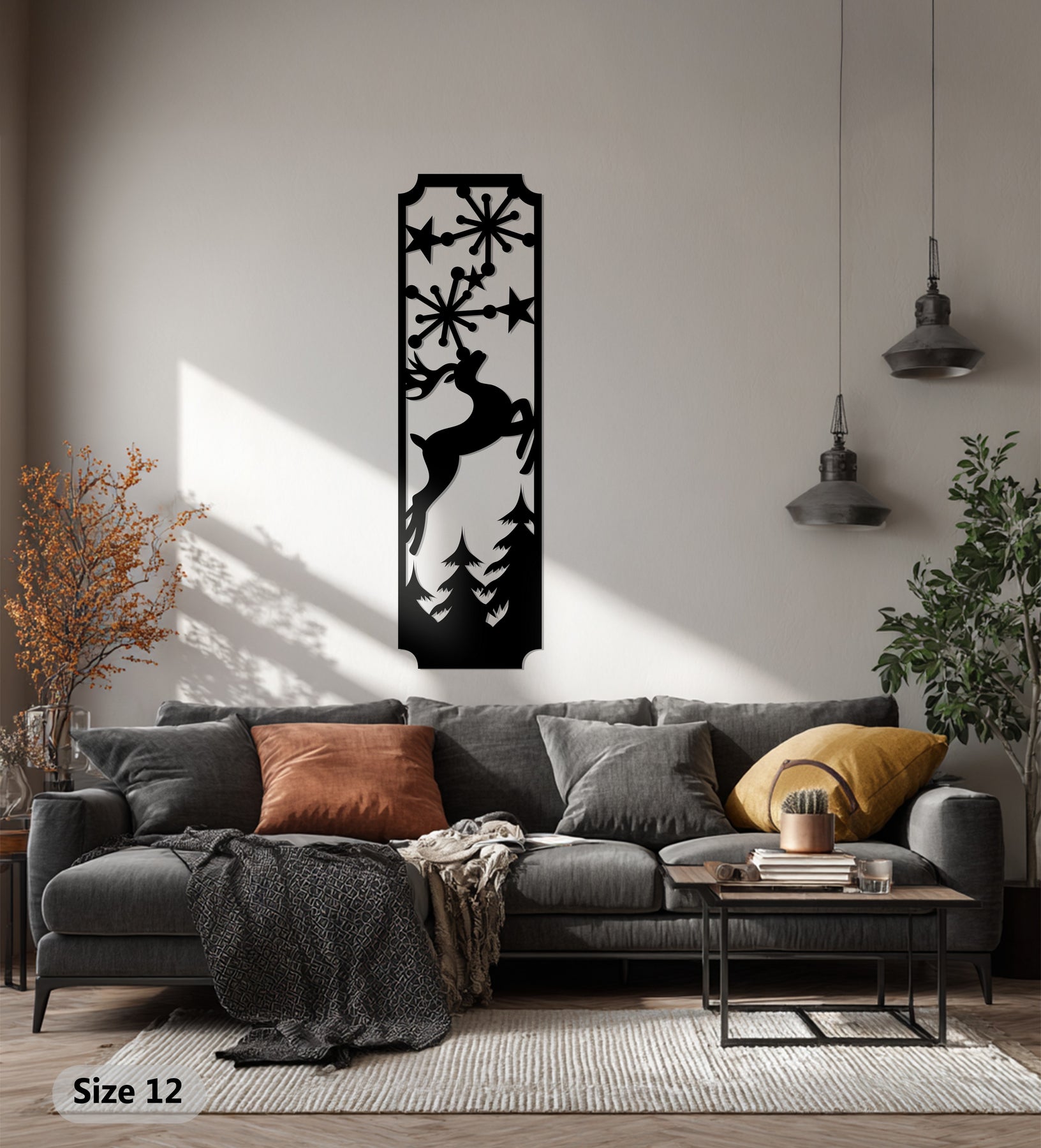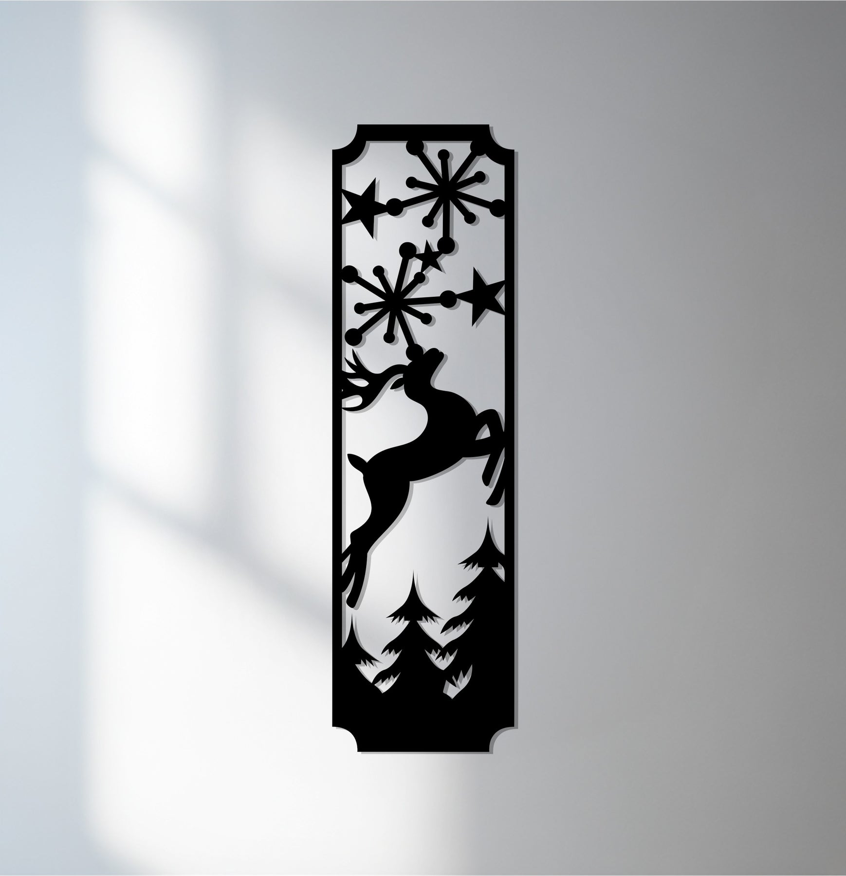 أضف لمسة من سحر الأعياد إلى منزلك مع الرنة الرشيقة فن جداري معدنييتميز هذا التصميم الرائع بصورة غزال رنة يقفز محاطًا برقاقات ثلجية أنيقة وأشجار دائمة الخضرة، ليجسد بهجة وسكينة فصل الشتاء. شكله المستطيل الطويل يجعله مثاليًا للمساحات الضيقة على الجدران، أو الممرات، أو بجانب شجرة عيد الميلاد.