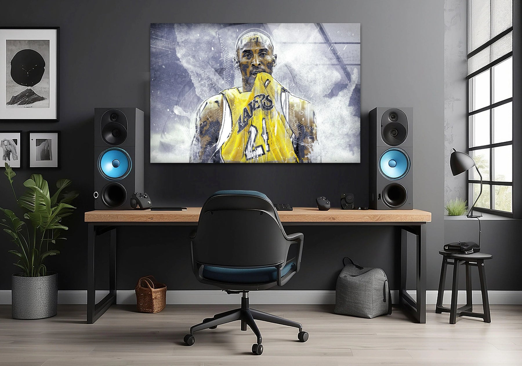 Kobe Bryant Artistic hoops glass print with a legendary athlete in yellow jersey against textured splatter effects.