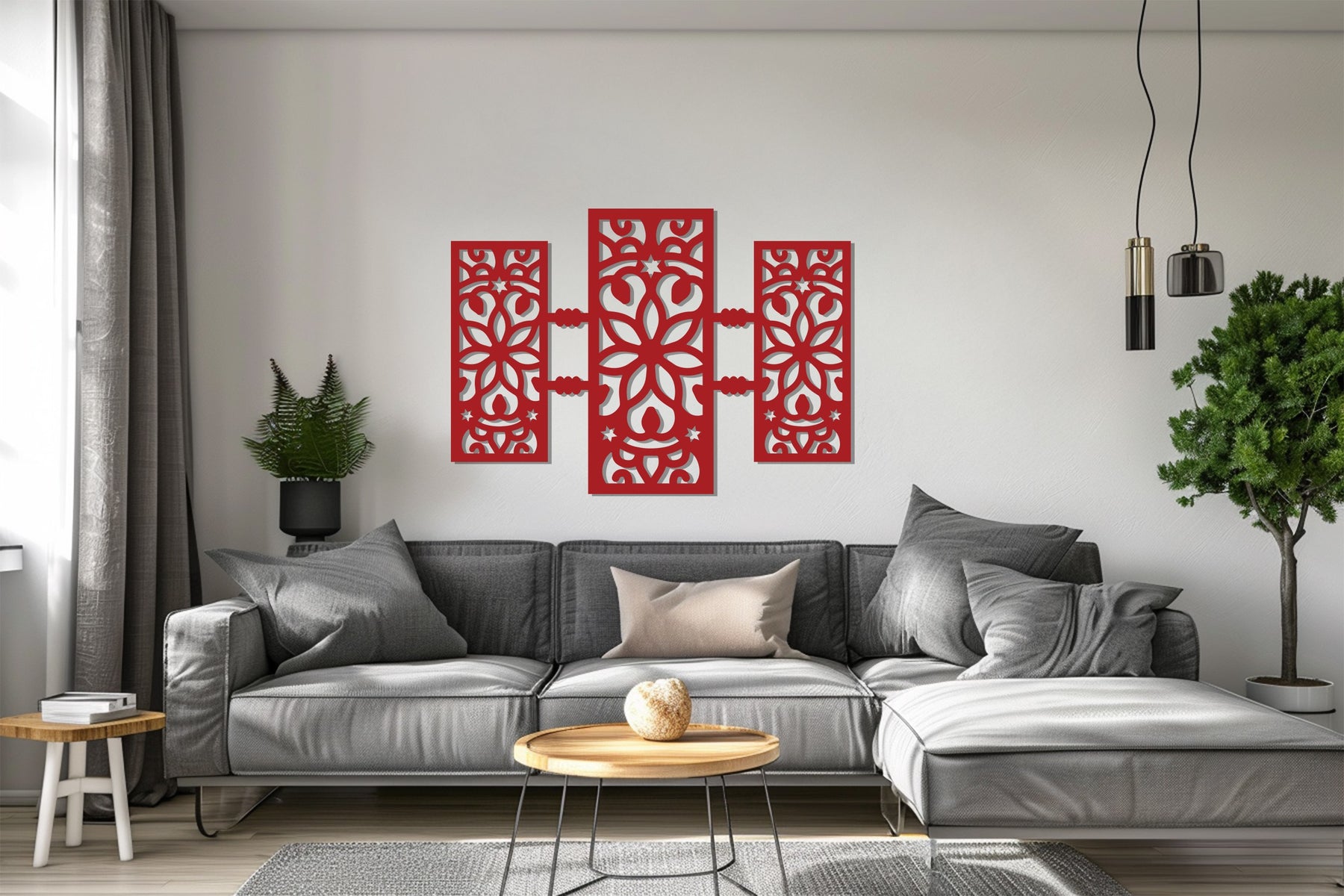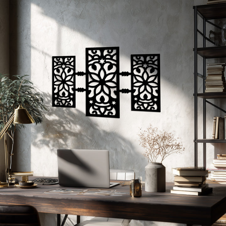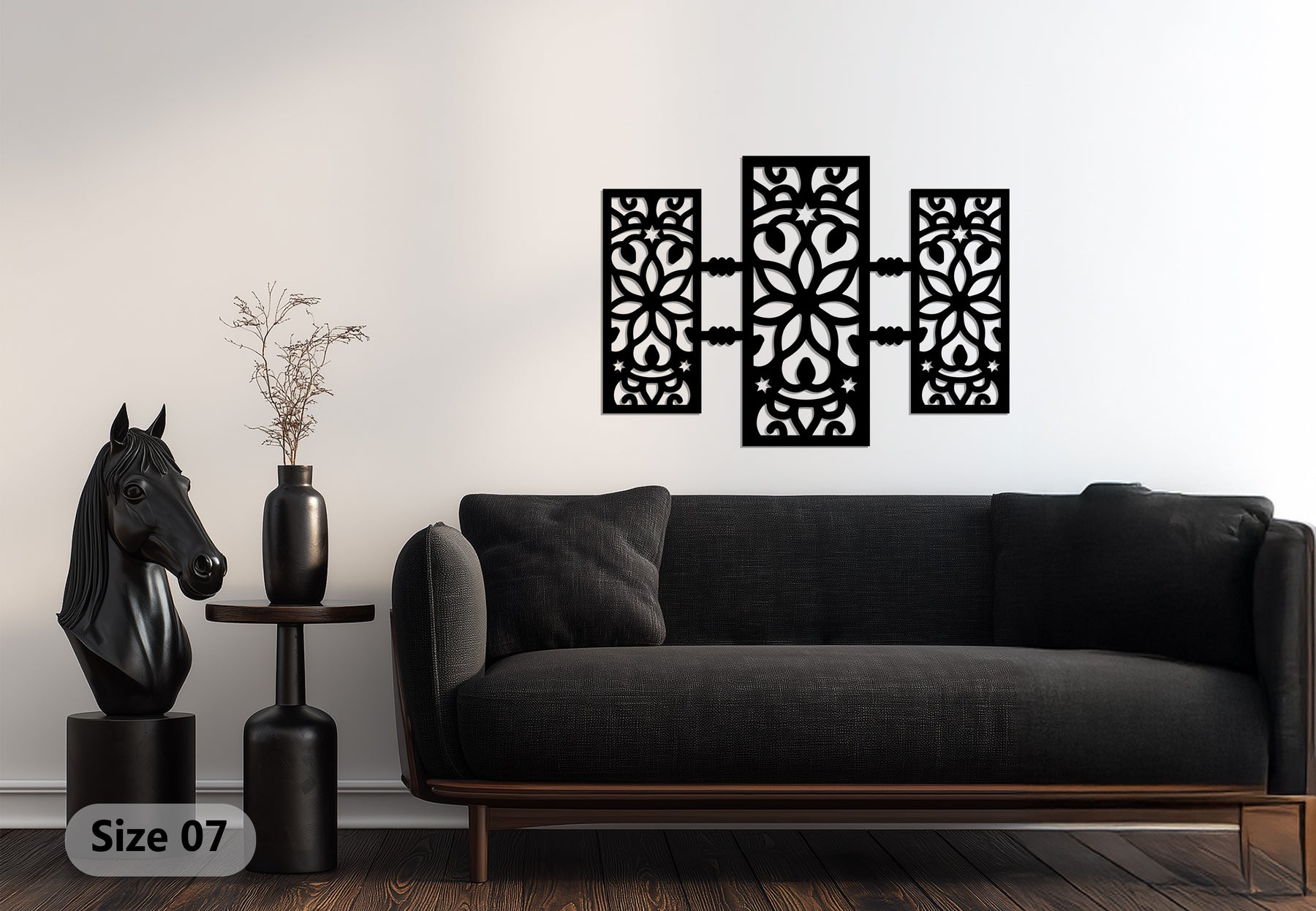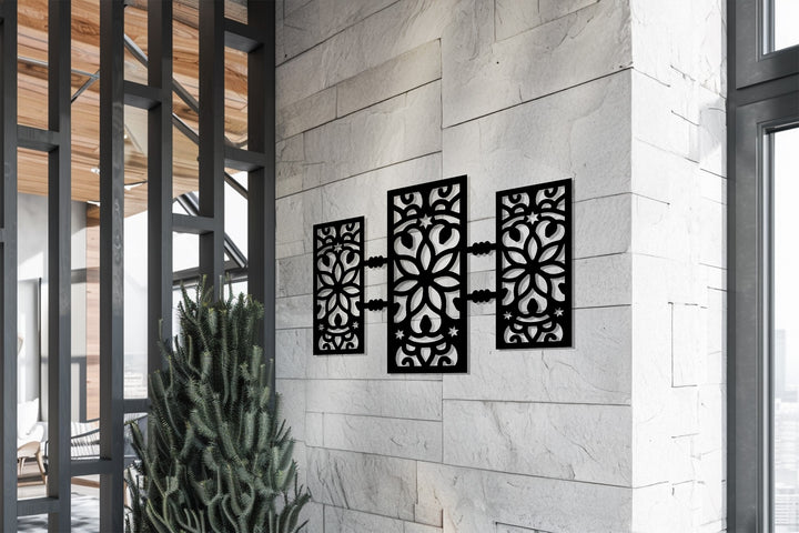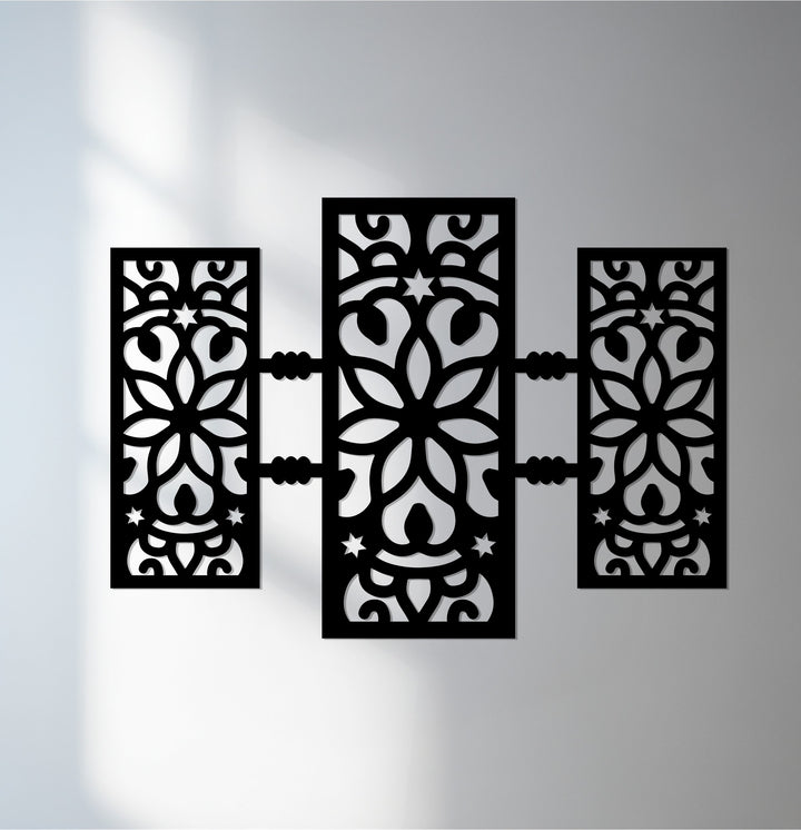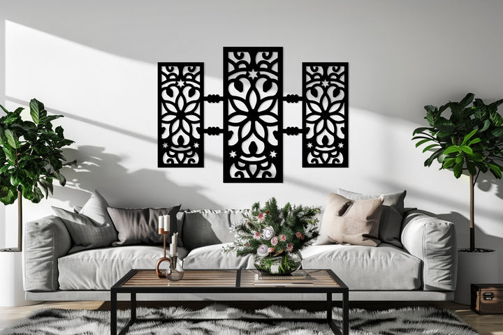 ارتقِ بمساحتك مع بتلة مضيئة – تصميم هندسي زهري حديث فن جداري معدنيتصميم ثلاثي الألواح متوازن بشكل جميل يجمع بين التناظر والفن. يتميز كل لوح بنقوش زهرية دقيقة مقطوعة بالليزر ومزينة بزخارف نجمية، مما يخلق تلاعبًا أنيقًا بالضوء والظل يعزز أجواء أي غرفة.