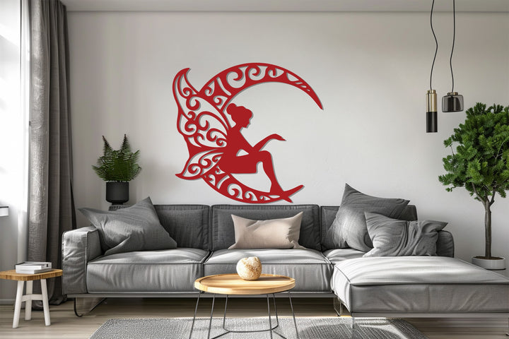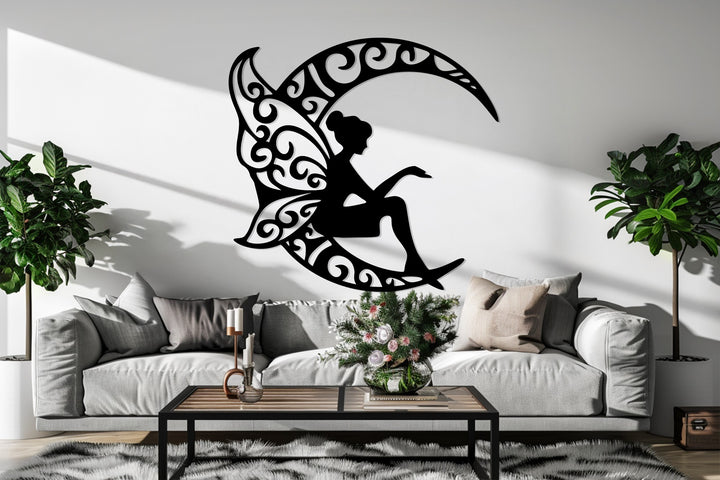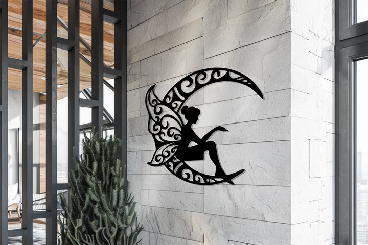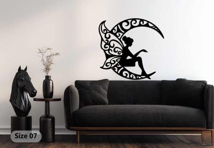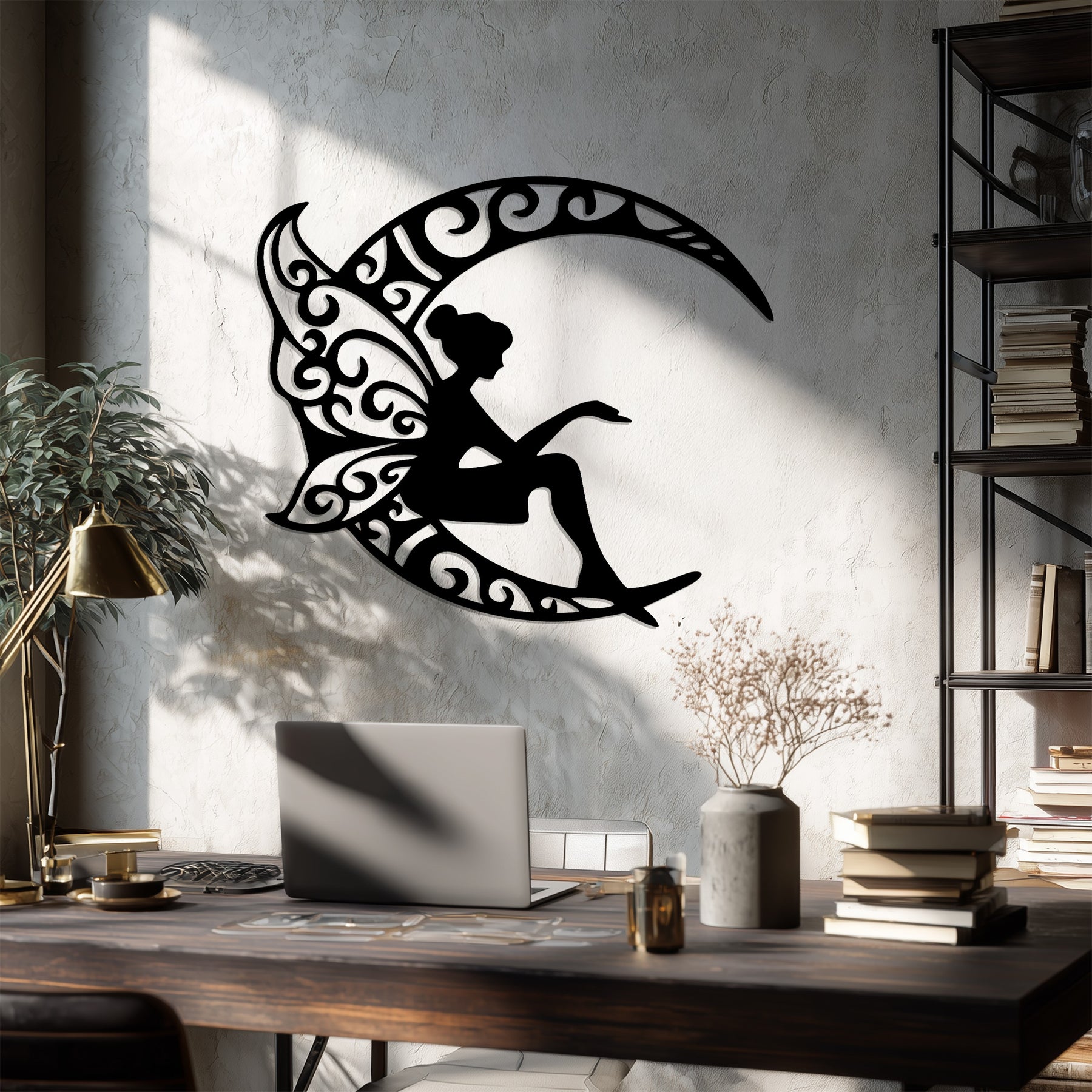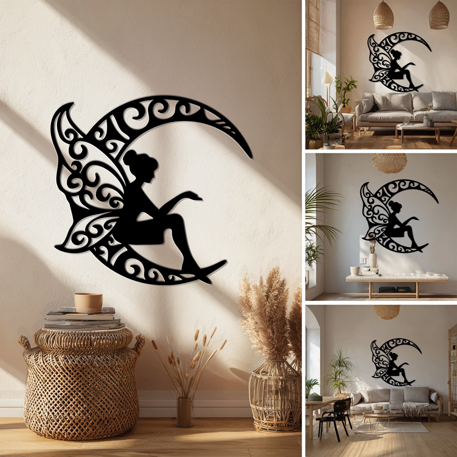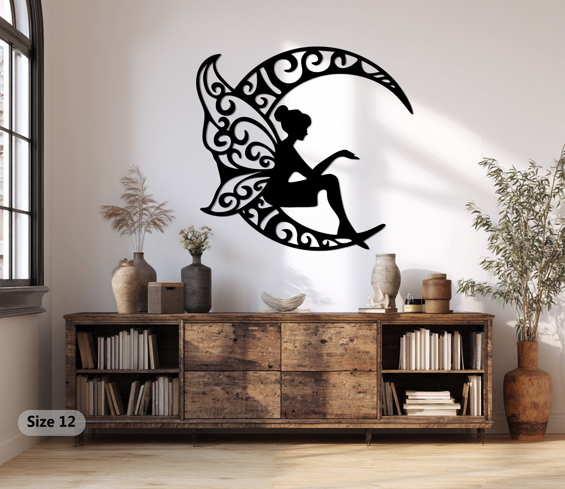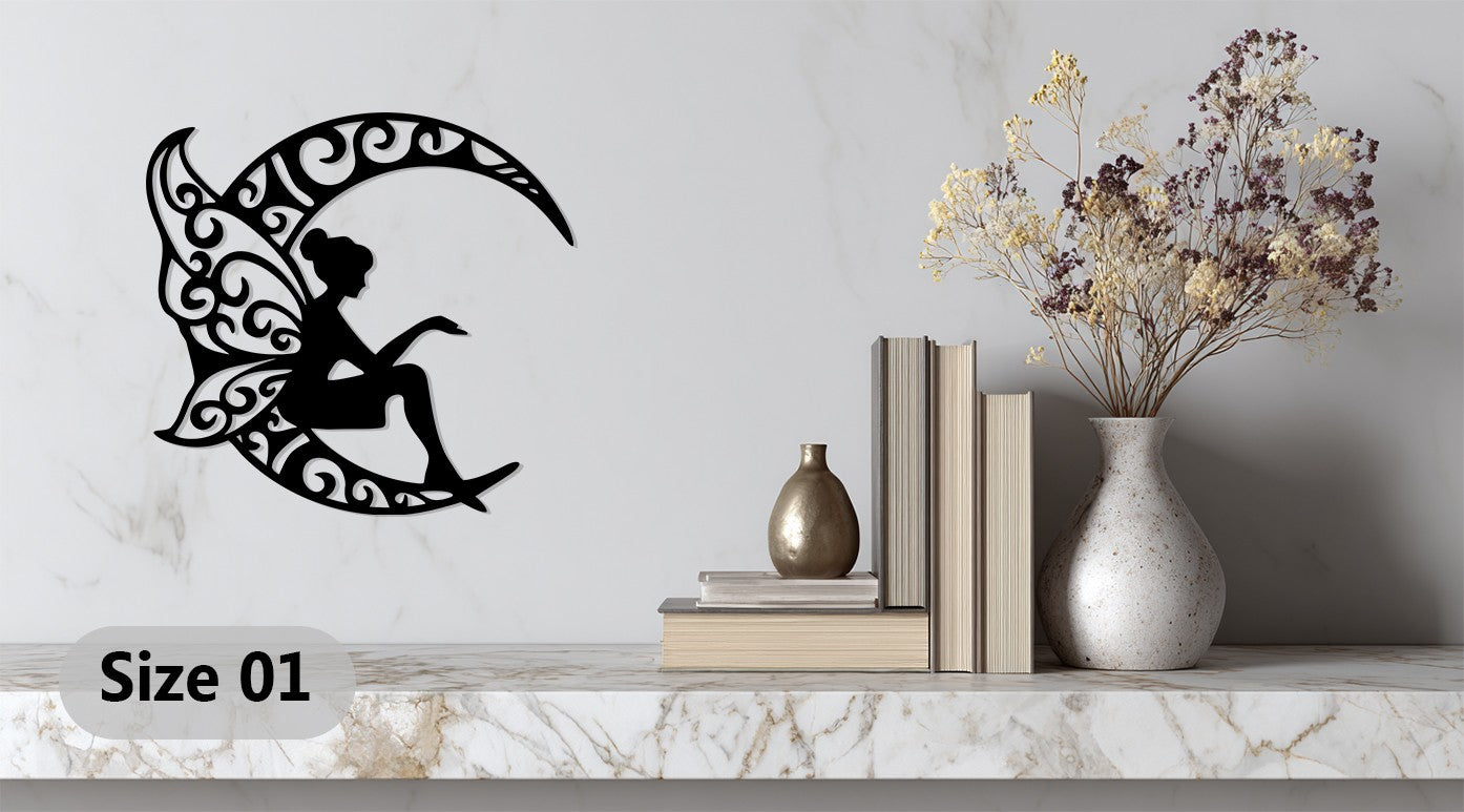 أضف لمسة من السحر والأناقة إلى مساحتك مع جنية ضوء القمر – للزينة فن جداري معدنييصور هذا الظل الساحر جنية رشيقة جالسة على هلال القمر، وأجنحتها الرقيقة مزينة بزخارف متقنة تجمع بين الخيال والرقي.