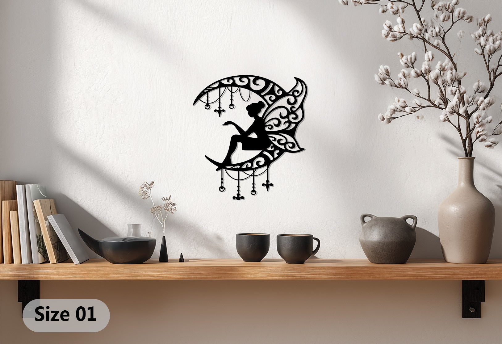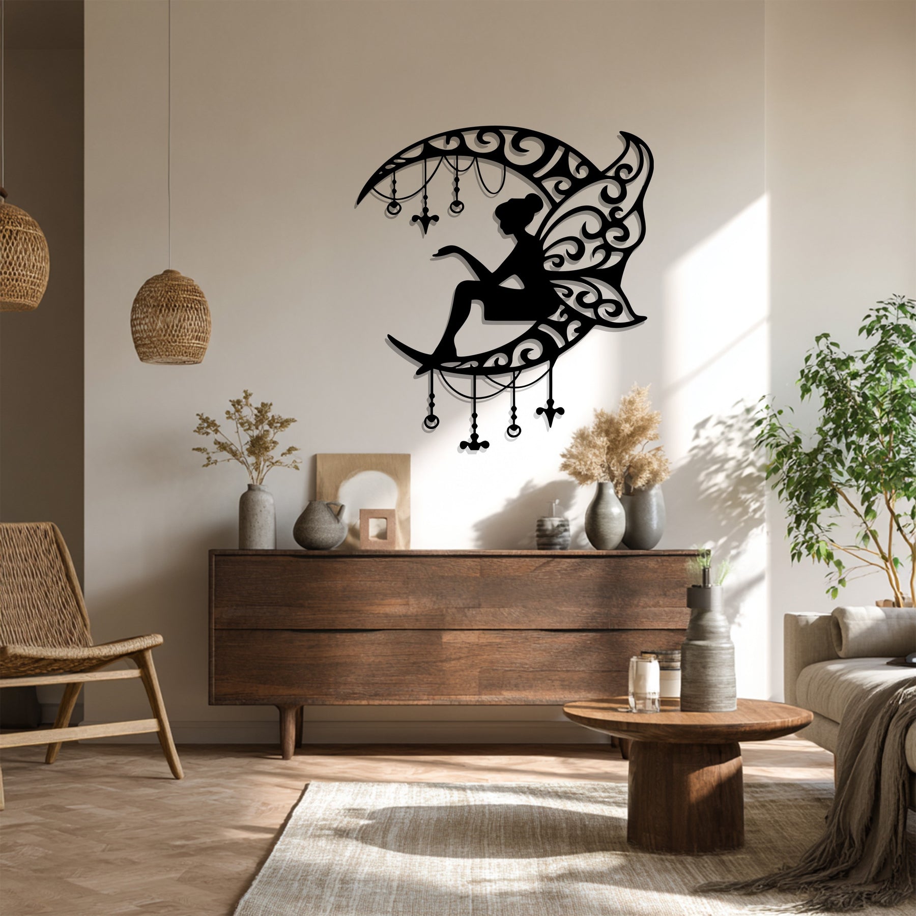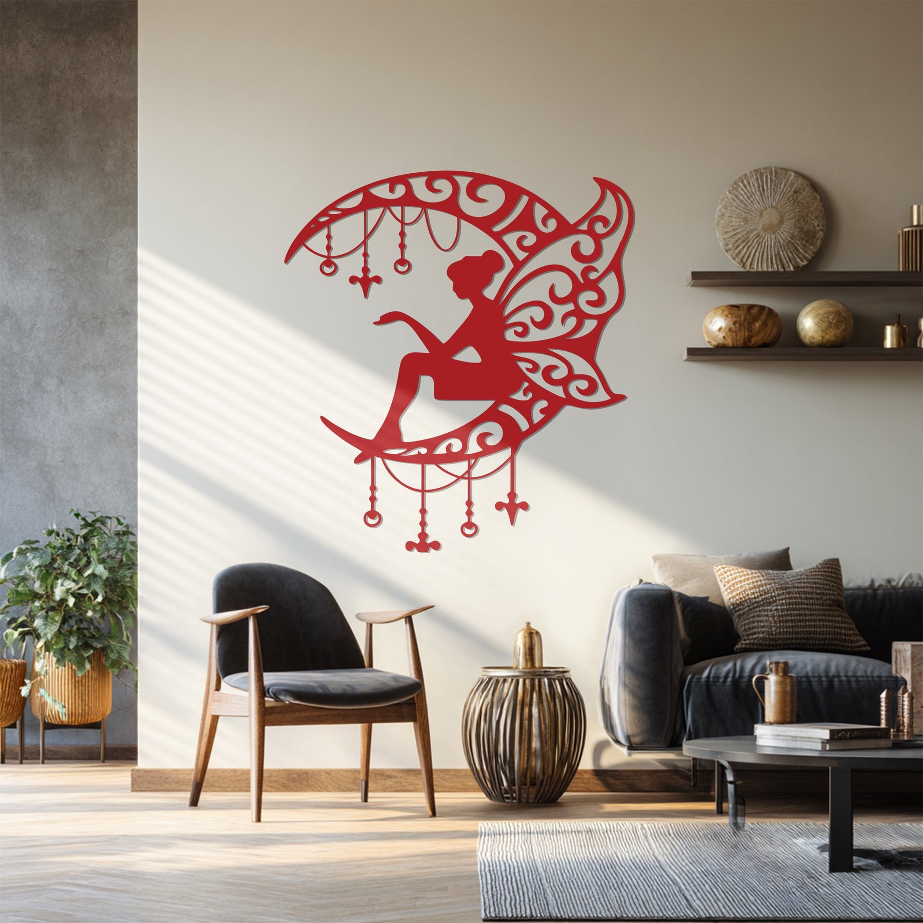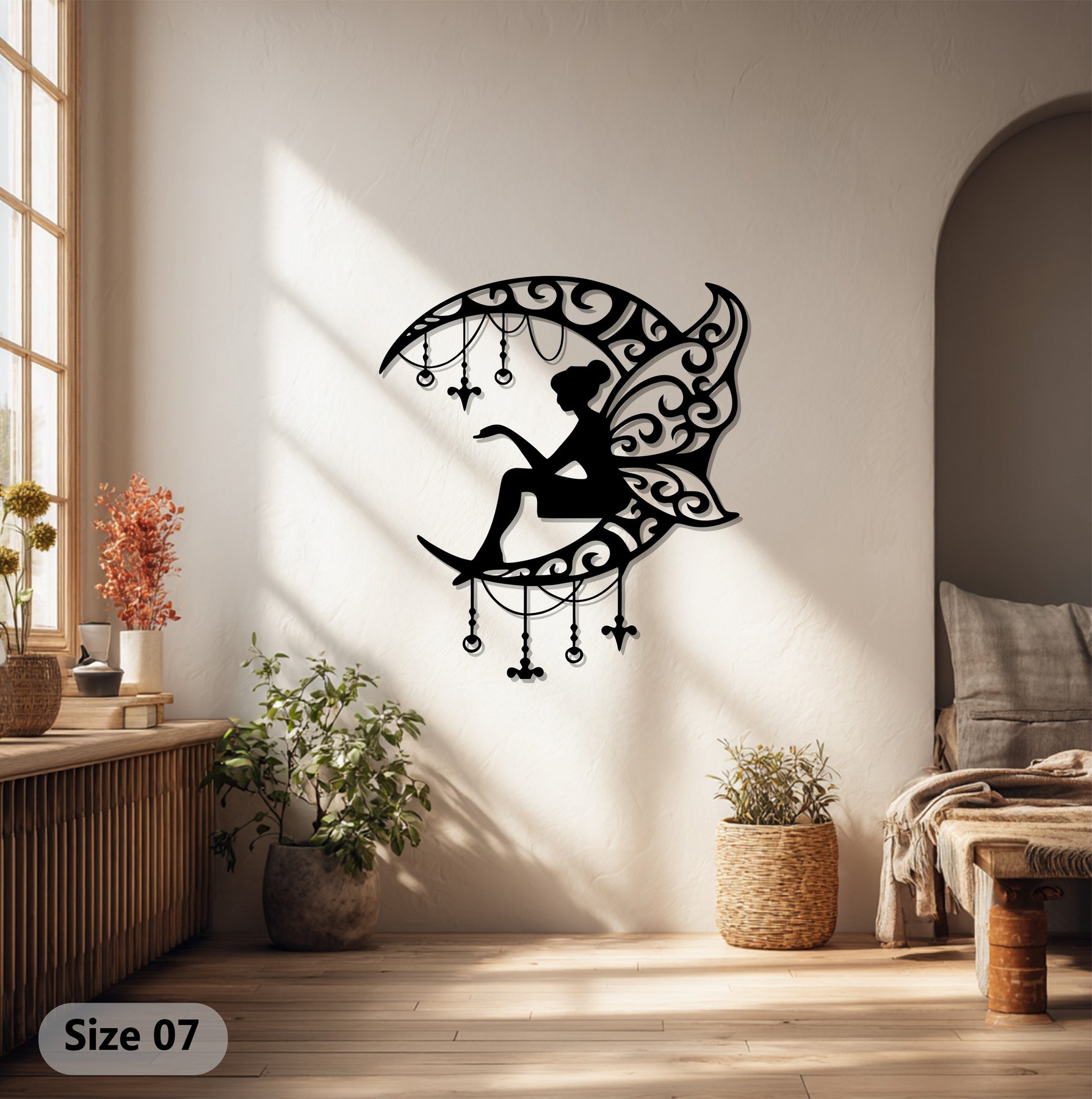حوّل جدرانك إلى عالم من السحر مع جنية ضوء القمر فن جداري معدنيتتميز هذه اللوحة الفنية بجنية أنيقة تجلس على هلال مزين بزخارف متدلية متقنة، مما يضفي لمسة من الخيال والرقي على ديكور منزلك. تخلق الأنماط المتداخلة والأجنحة الرقيقة توازناً رائعاً بين الغموض والجاذبية، مما يجعلها مثالية لغرف النوم، أو غرف الأطفال، أو المساحات الإبداعية.