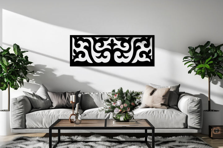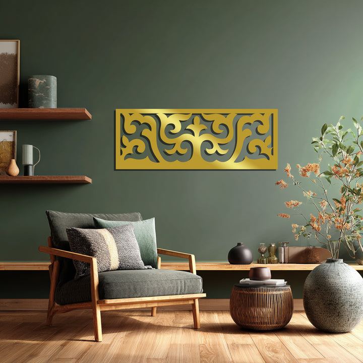 أضف لمسة من الفن الخالد إلى منزلك مع الجوهر الملكي – لفافة زخرفية فن جداري معدني لوحةتتميز هذه القطعة الأفقية الراقية بزخارف متدفقة جميلة وأشكال متناظرة تستحضر الأناقة الكلاسيكية والتوازن المعاصر.