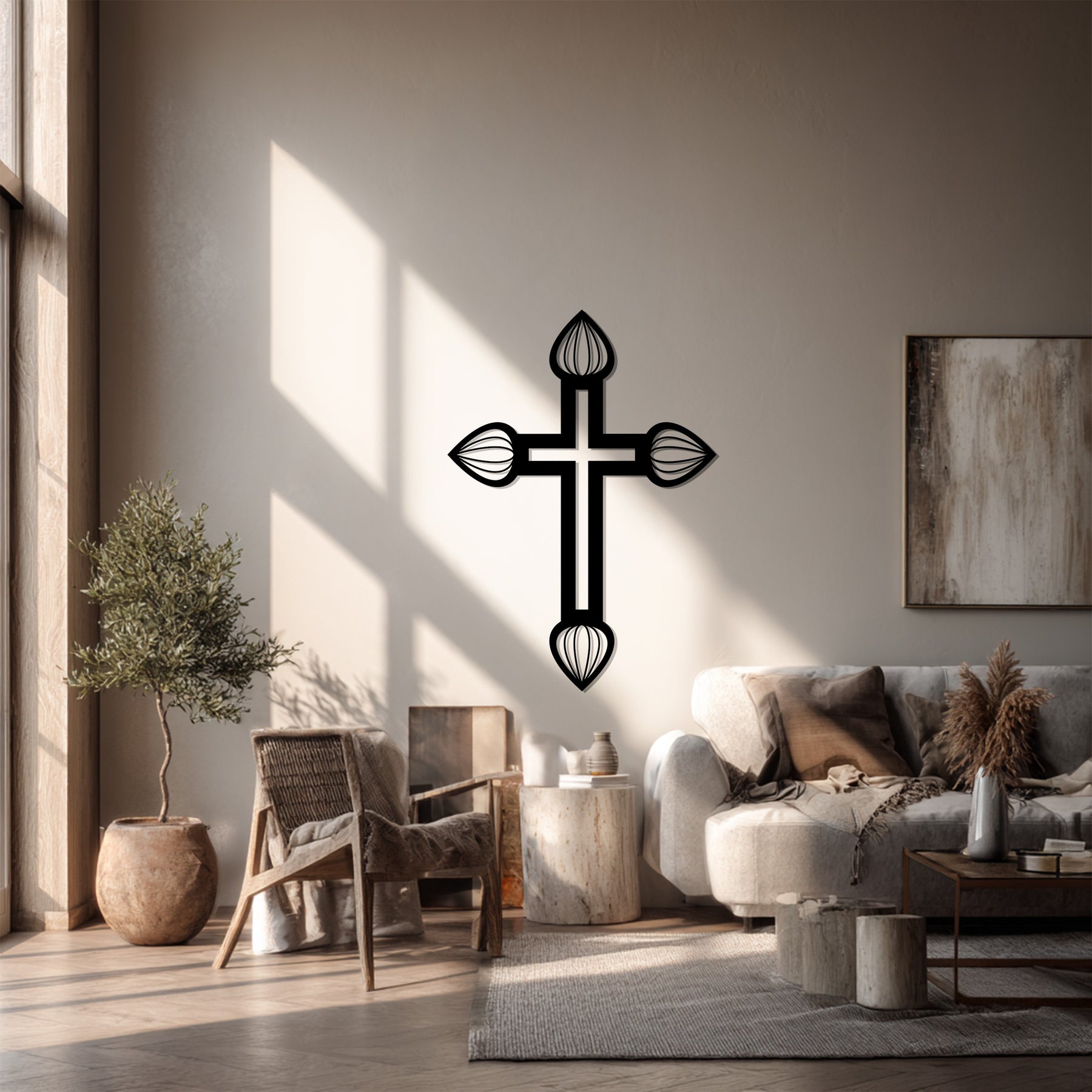 اجمع بين الأناقة والإخلاص مع الزهرة المقدسة فن جداري معدنييتميز هذا الصليب الفضي الرائع بأربعة أشكال تشبه البتلات، ترمز إلى النقاء والتجدد والخلق الإلهي. يضفي توازنه المتناسق ولمعانه المعدني المتألق لمسة جمالية أنيقة على المنازل المسيحية، أو غرف التأمل، أو الديكورات الداخلية العصرية الهادئة.