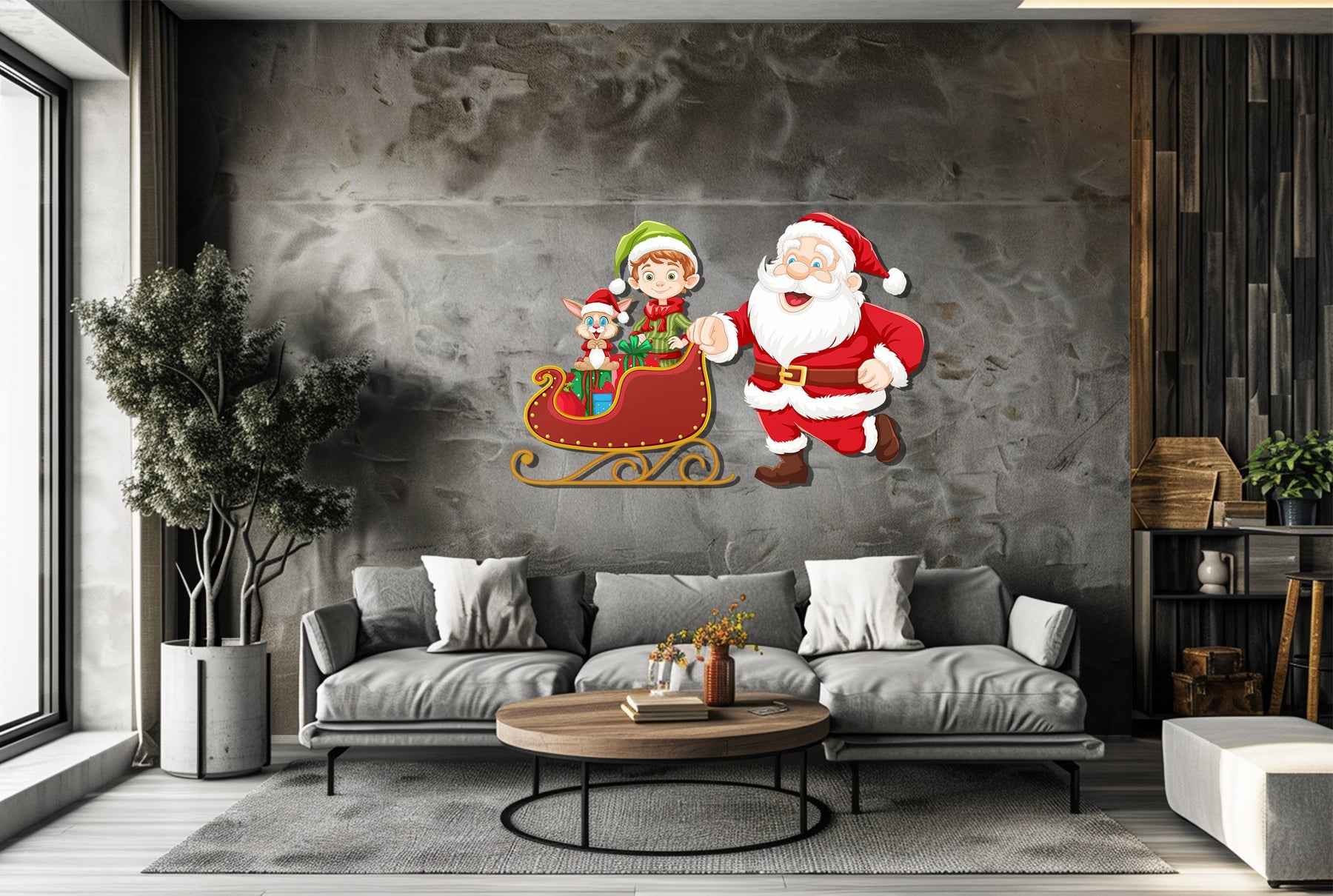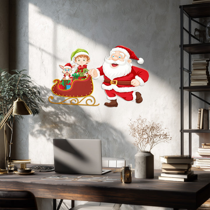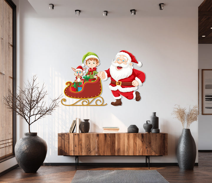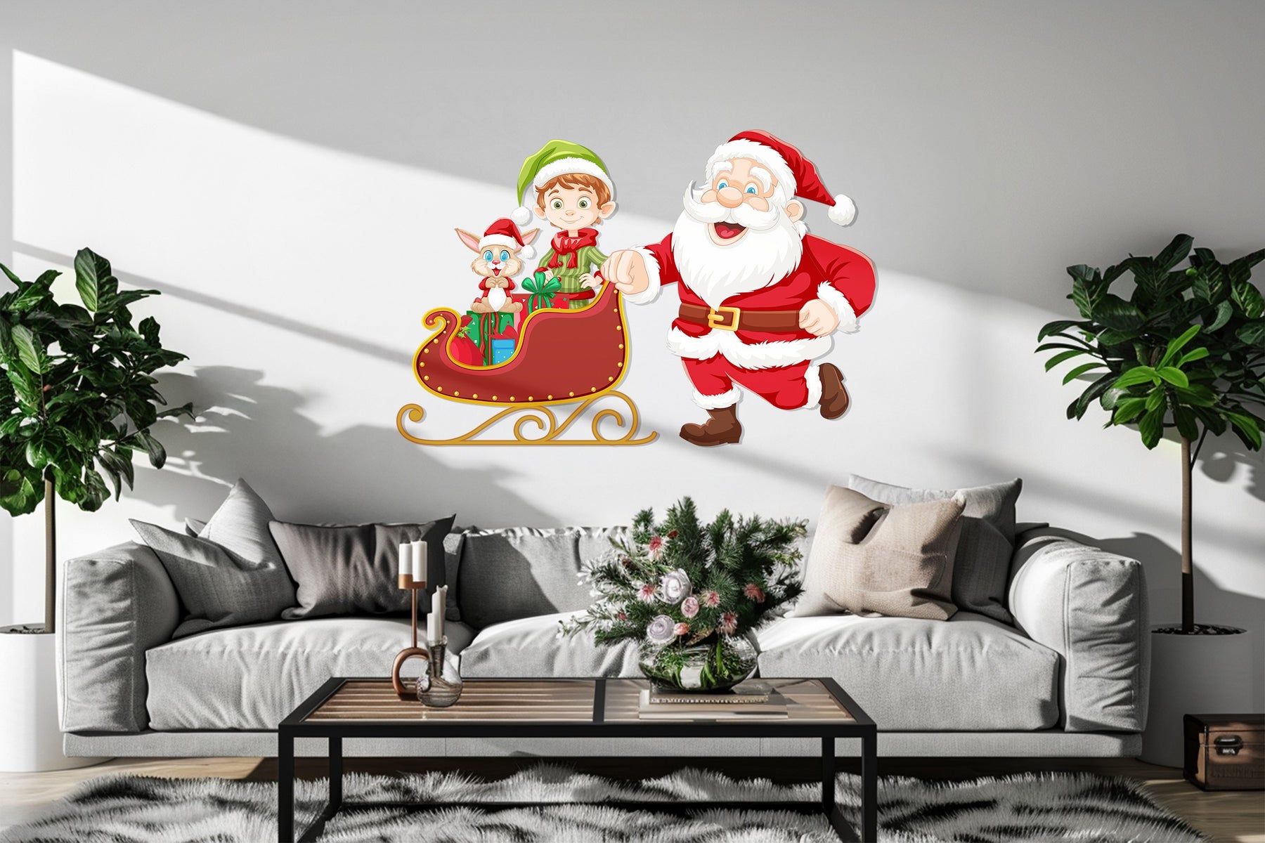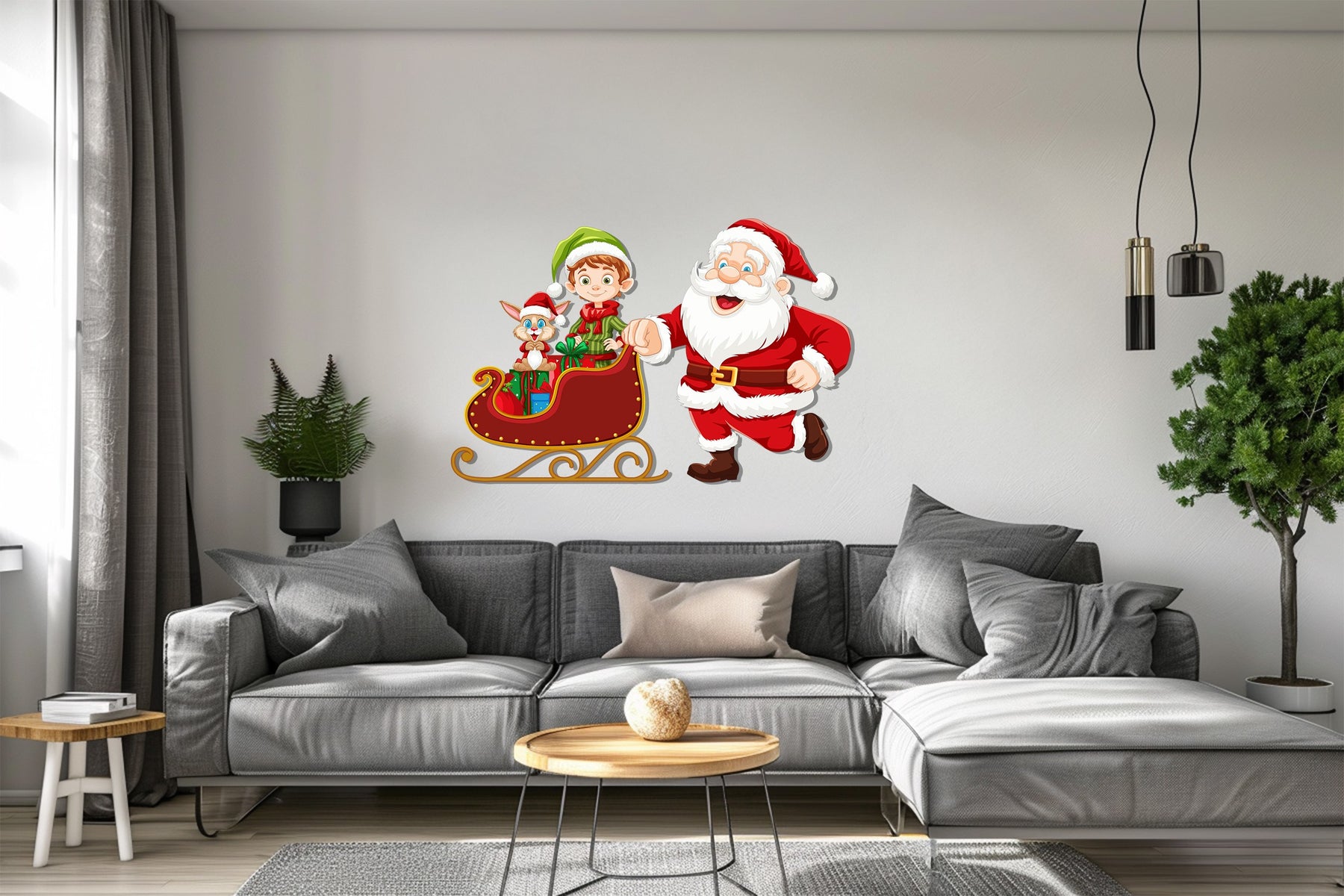 سانتا وجولة الزلاجة مع الجان - لوحة جدارية لعيد الميلاد