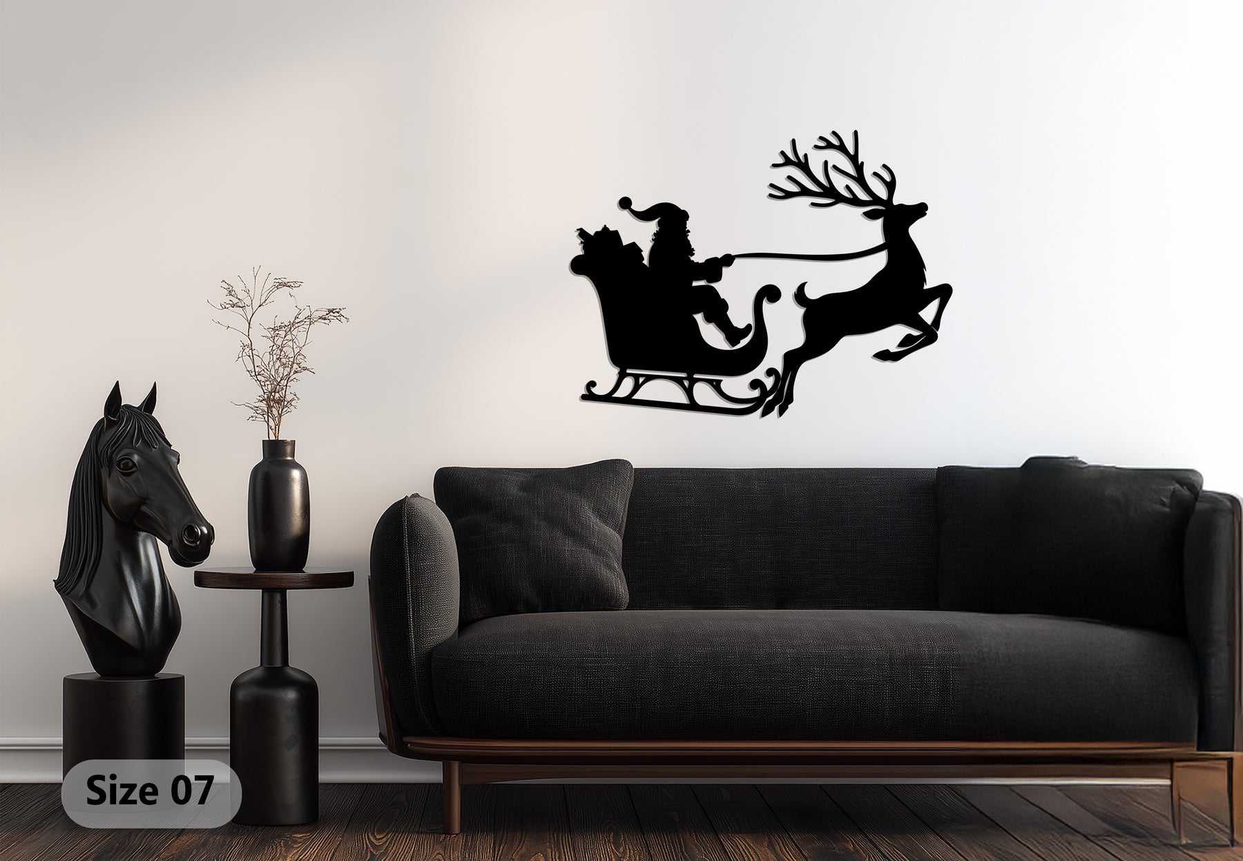 احتفل بسحر عيد الميلاد مع رحلة سانتا على الزلاجة - غزلان عيد الميلاد فن جداري معدني. يصور هذا الظل الأسود الأنيق سانتا في مزلاجته التي يقودها غزال مهيب، وهو يندفع في الهواء حاملاً الهدايا - رمز خالد للفرح والكرم والروعة الاحتفالية.