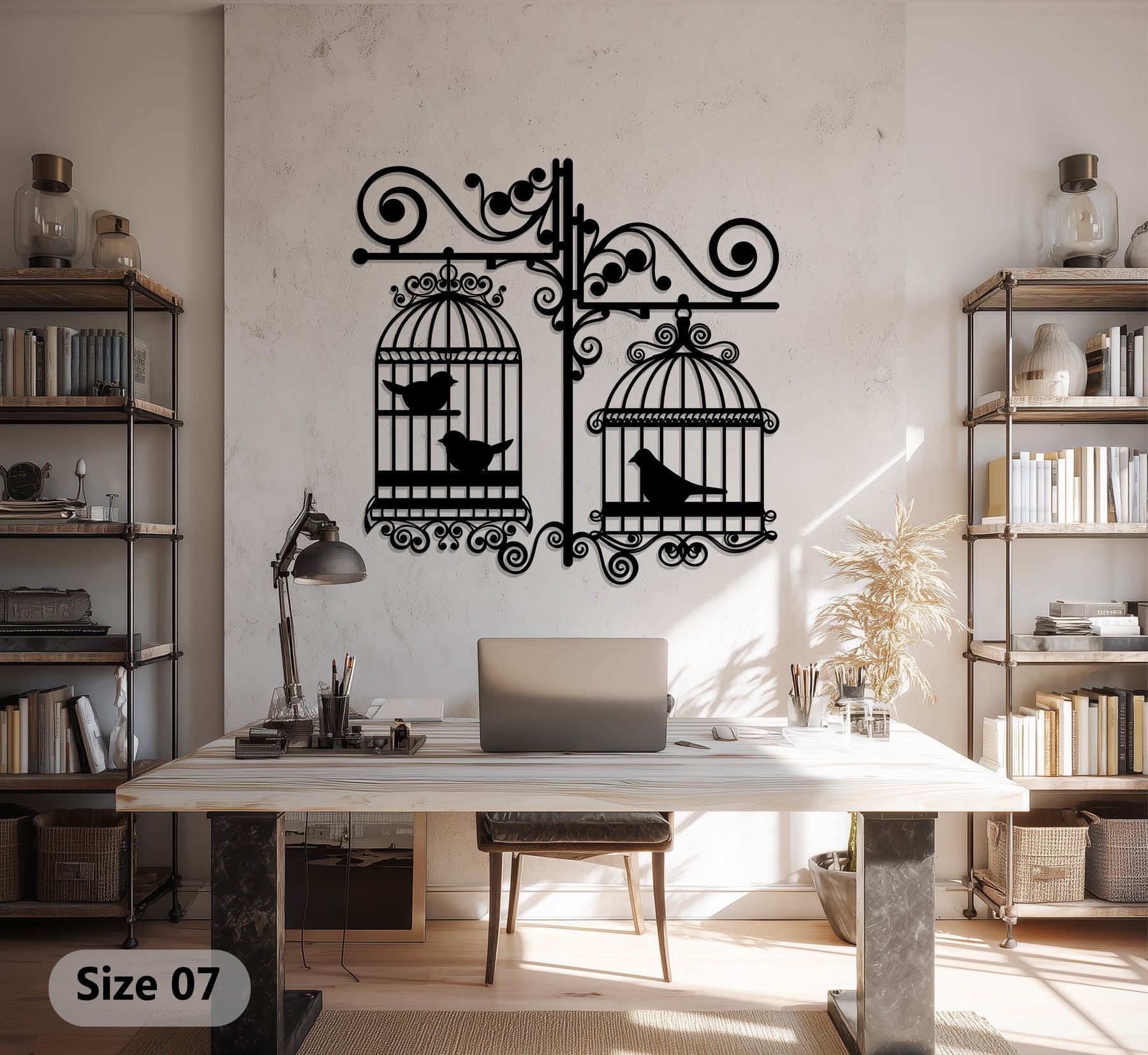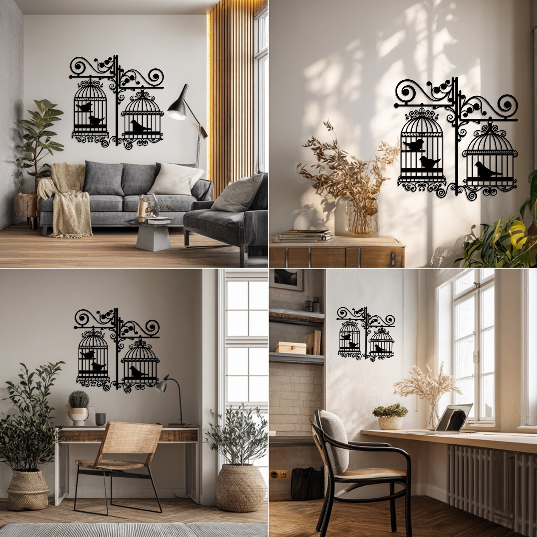 أضف لمسة من الأناقة الخالدة إلى منزلك مع طيور الأغاني الفيكتورية فن جداري معدنيتتميز هذه القطعة الفنية الرائعة بأقفاص طيور مُعلقة بتفاصيل دقيقة من زخارف لولبية بديعة، تجسد روعة التصميم الأوروبي الكلاسيكي. وتوحي الطيور الجاثمة بالسكينة والجمال، رمزاً للحب والحرية في عالم الفن.
