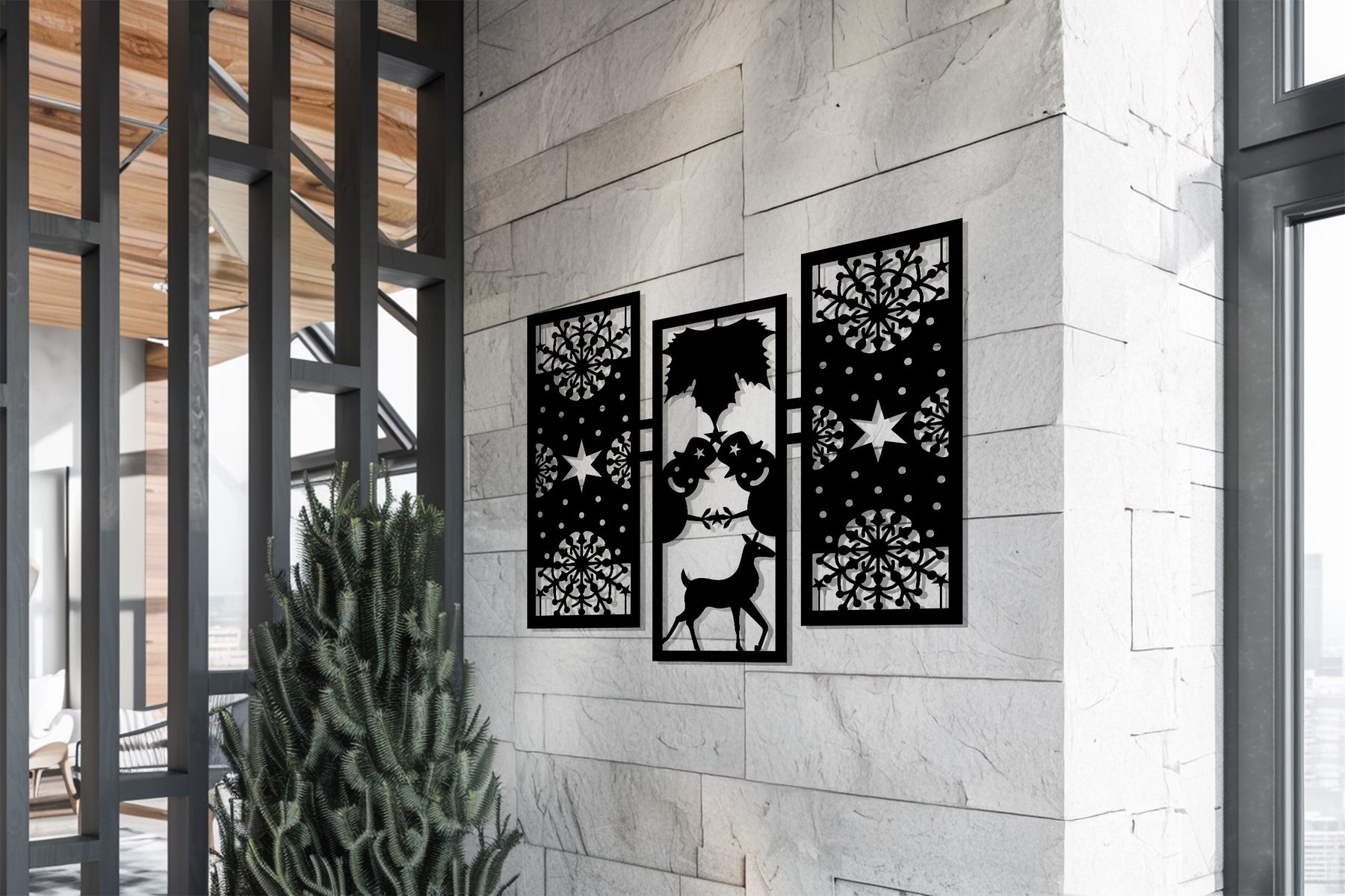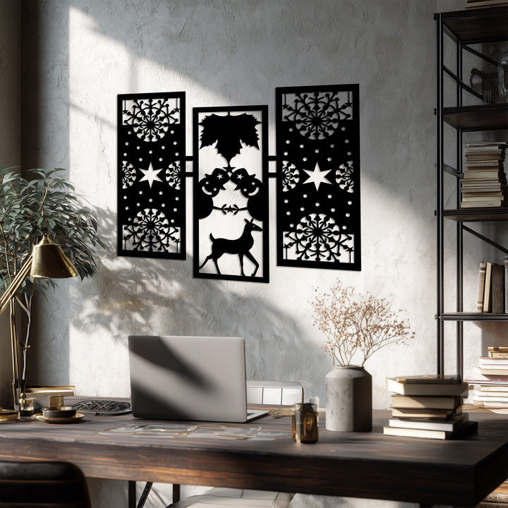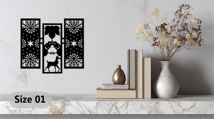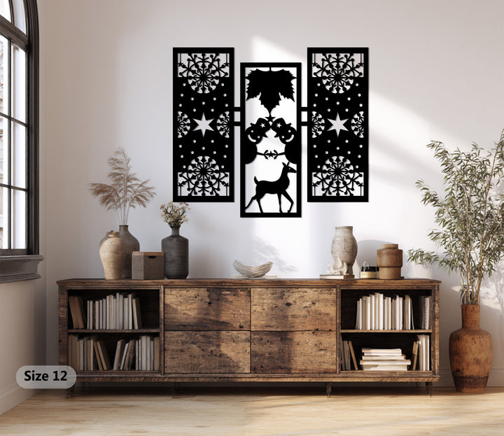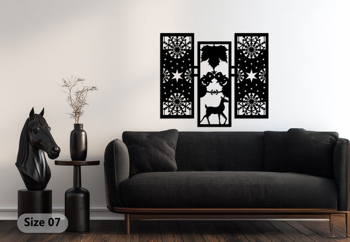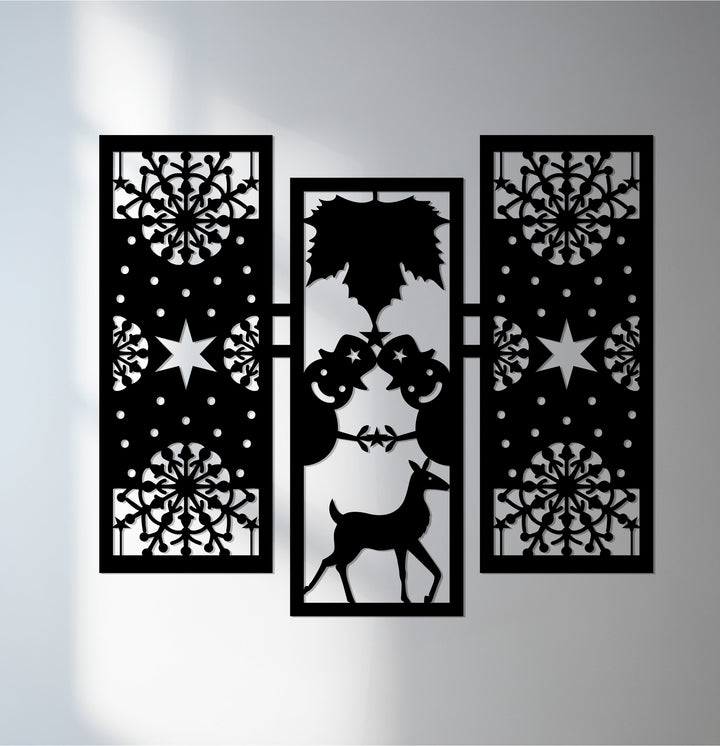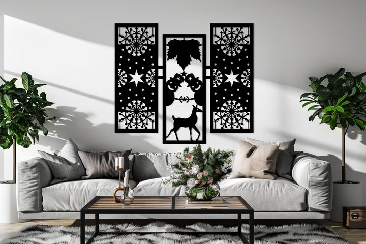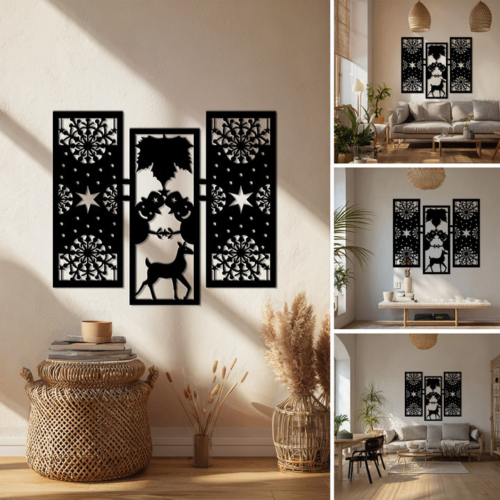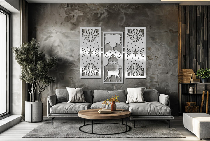 أضف الدفء والروعة إلى ديكورات عطلتك مع بهجة الشتاء – رجل الثلج وغزلان الرنة في عيد الميلاد فن جداري معدنيتتميز هذه القطعة الأنيقة المكونة من ثلاثة أجزاء برجال ثلج مرحين، ورنة رشيقة، وأنماط ندفات ثلج معقدة تجسد روح عيد الميلاد بتوازن هندسي مثالي.