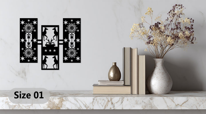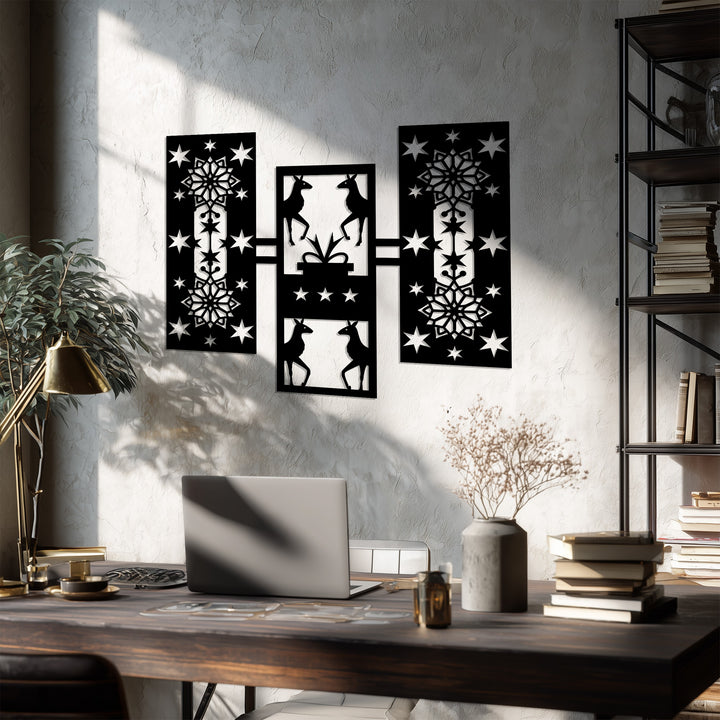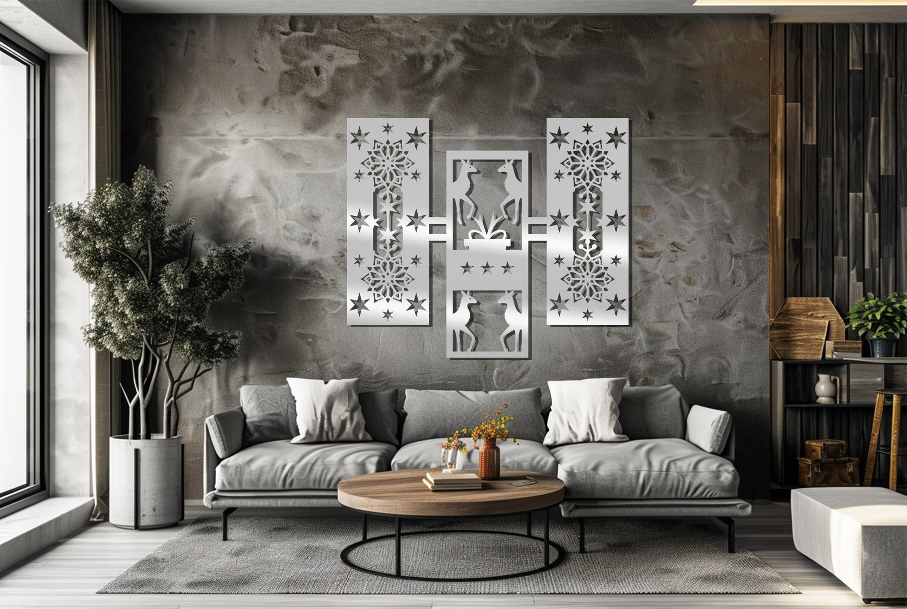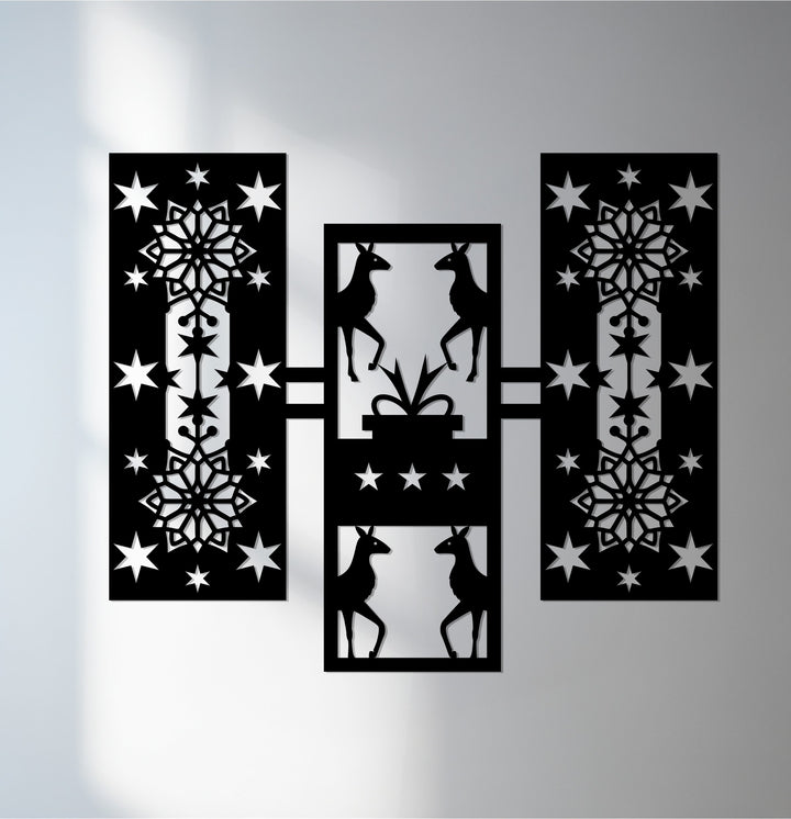 احتفل بسحر الموسم مع تناغم غزلان الشتاء – أشكال هندسية لعيد الميلاد فن جداري معدنييتميز هذا التصميم المعقد ذو الألواح الثلاثة بأنماط ندفات الثلج المتناظرة والنجوم الأنيقة وغزلان الرنة التوأم التي تواجه قطعة مركزية احتفالية للهدايا - مزيج مثالي من الدقة الهندسية وسحر عيد الميلاد.