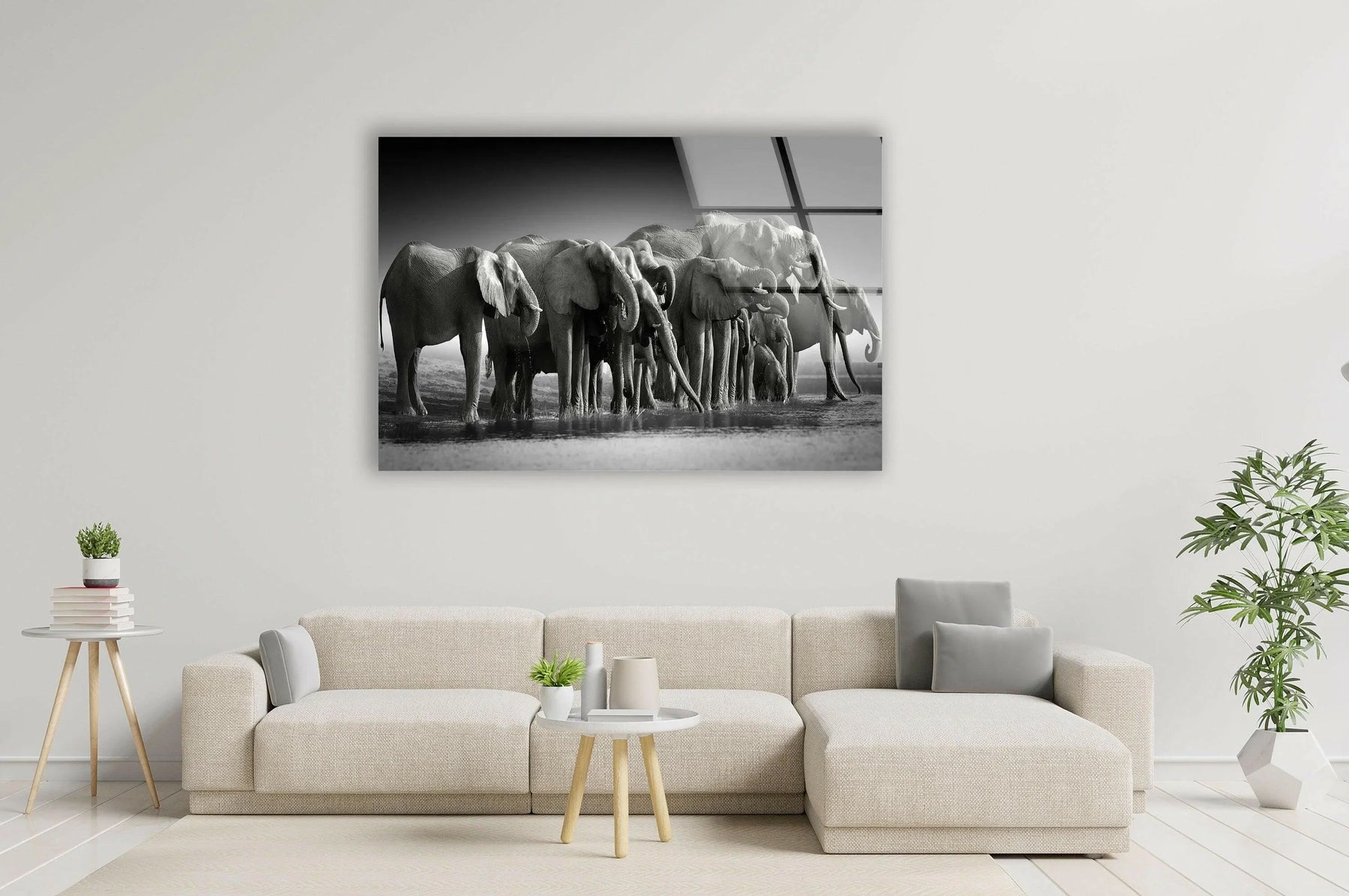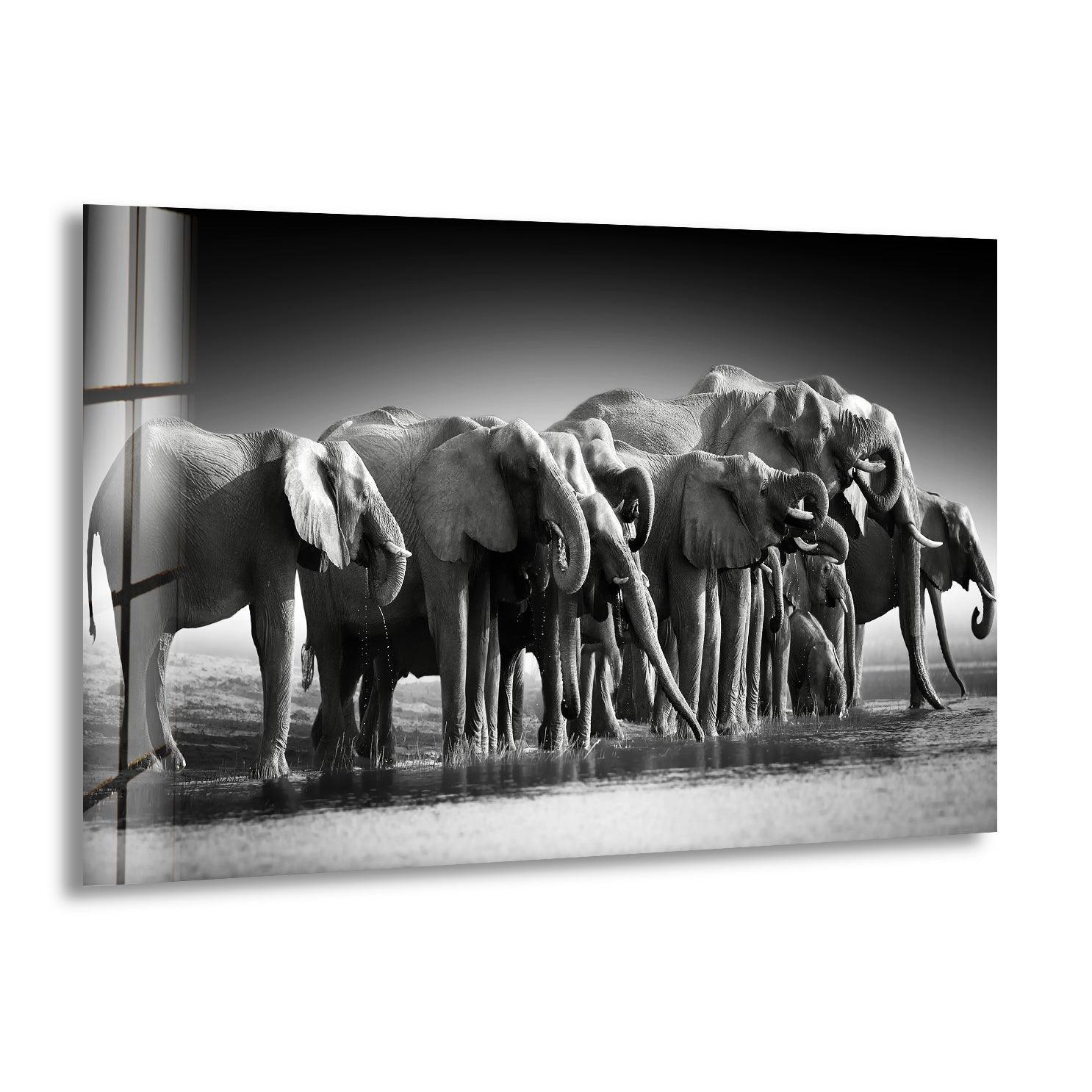 Black and white glass wall art featuring a herd of elephants gathered at a water’s edge.