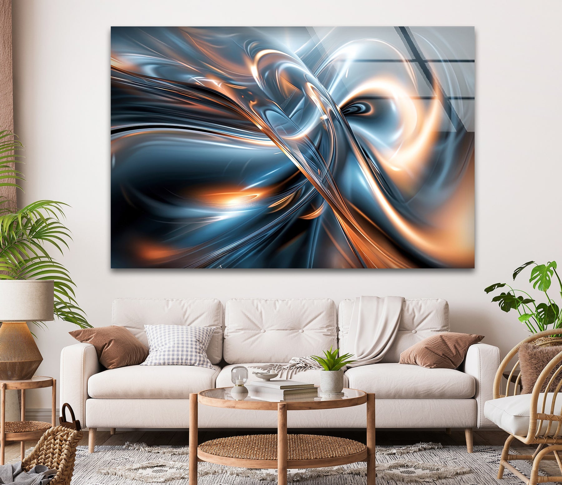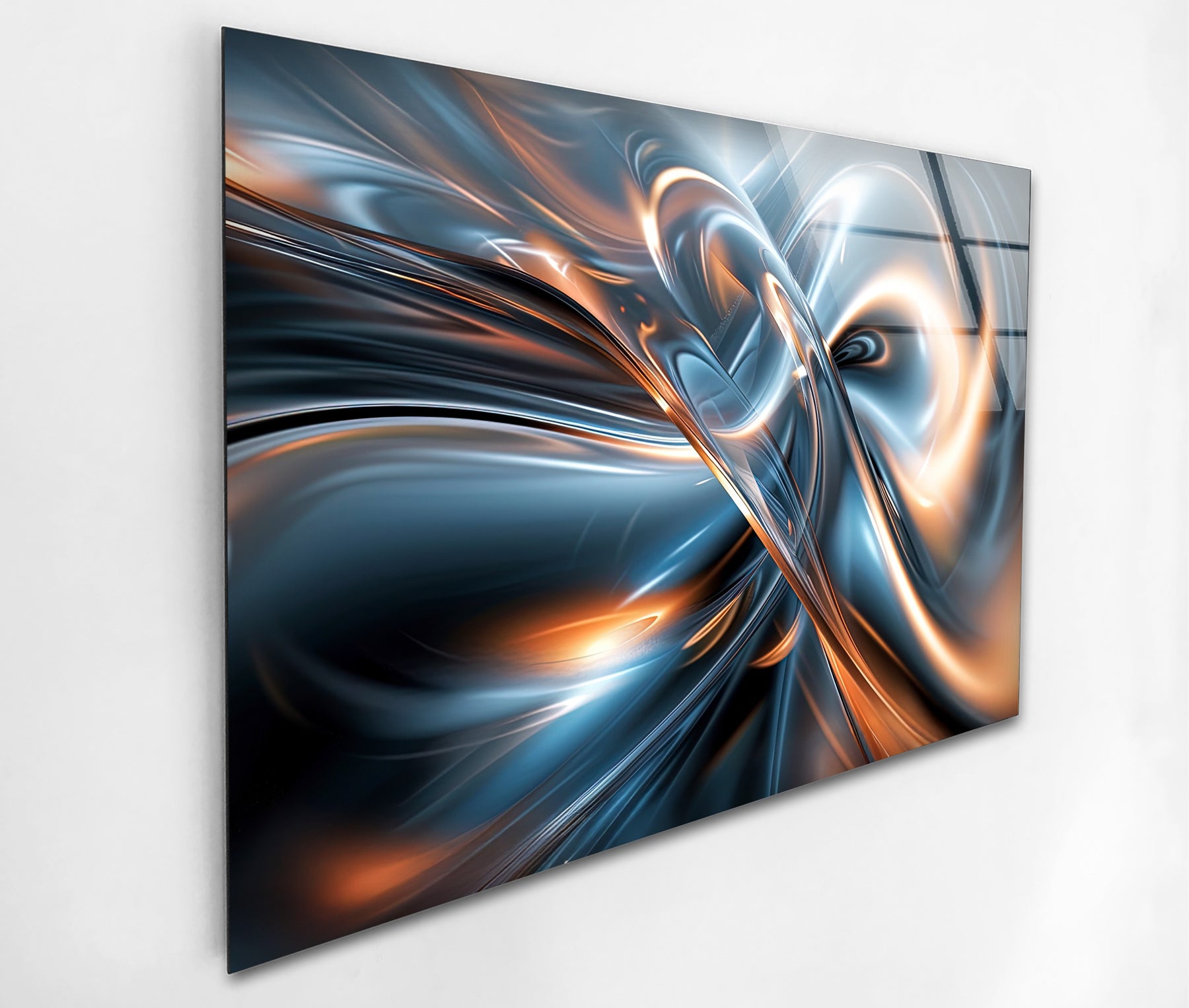 مطبوعة على زجاج فاخر فائق اللمعان، تُجسّد كل تفاصيلها المتلألئة، من المنحنيات العاكسة إلى التدرجات اللونية المتوهجة، بوضوح وعمق استثنائيين. تُعدّ هذه اللوحة الفنية مثالية لغرف المعيشة، ومواقع الألعاب والبث المباشر، والاستوديوهات الإبداعية، والمكاتب، أو المساحات التجارية الفاخرة، حيث تُضفي أجواءً من الحركة والابتكار والأناقة العصرية.
