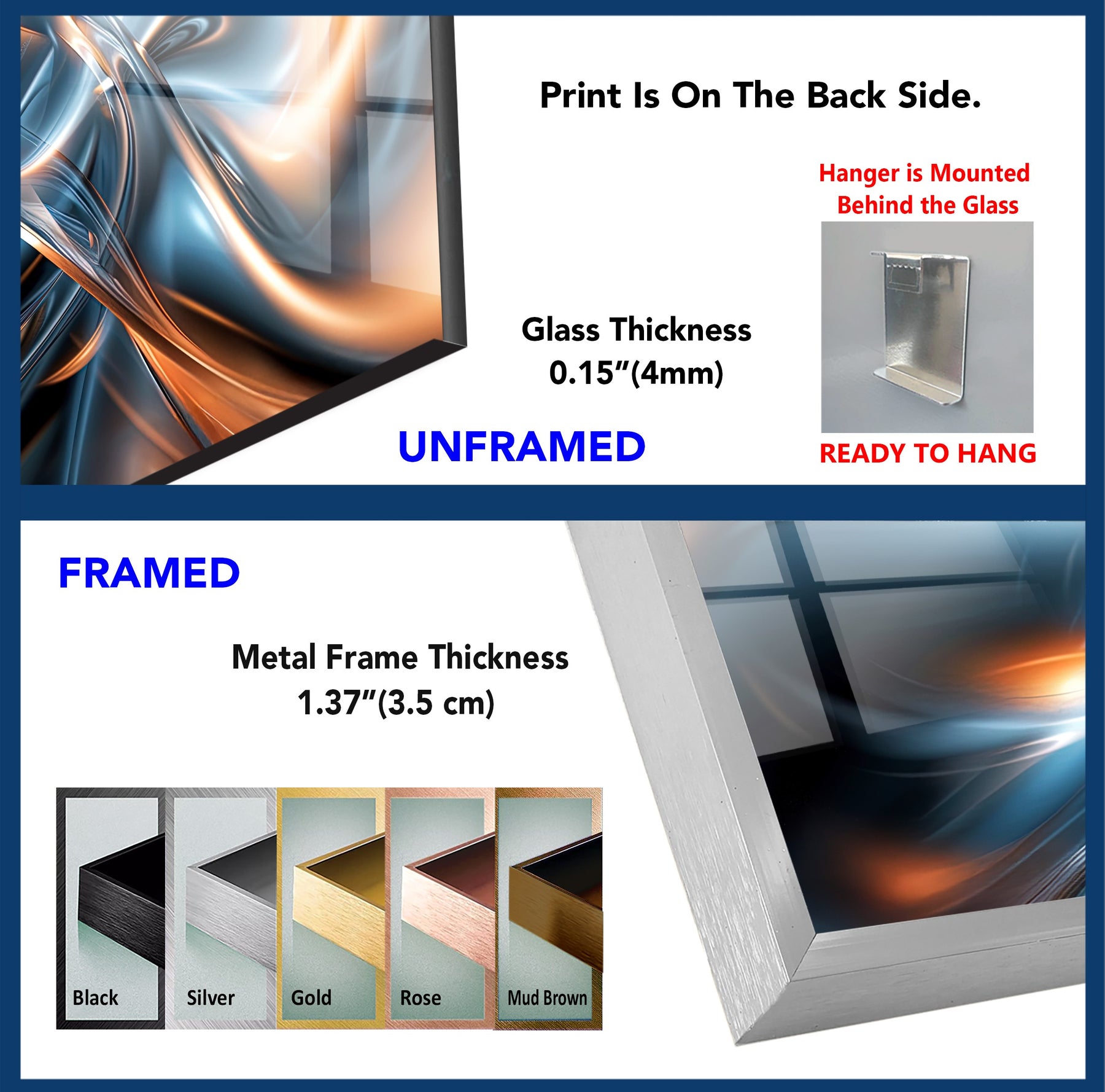 إطاراتنا المصنوعة من الألومنيوم بسمك 1.37 بوصة (3.5 سم)، والمتوفرة بخمسة ألوان مختلفة، تضيف لمسة عصرية إلى اللوحات الزجاجية الجداريةمتين وأنيق، يتضمن كل إطار نظام تعليق متكامل سهل الاستخدام، مصنوع بشكل مثالي في ورشة العمل الخاصة بنا.
