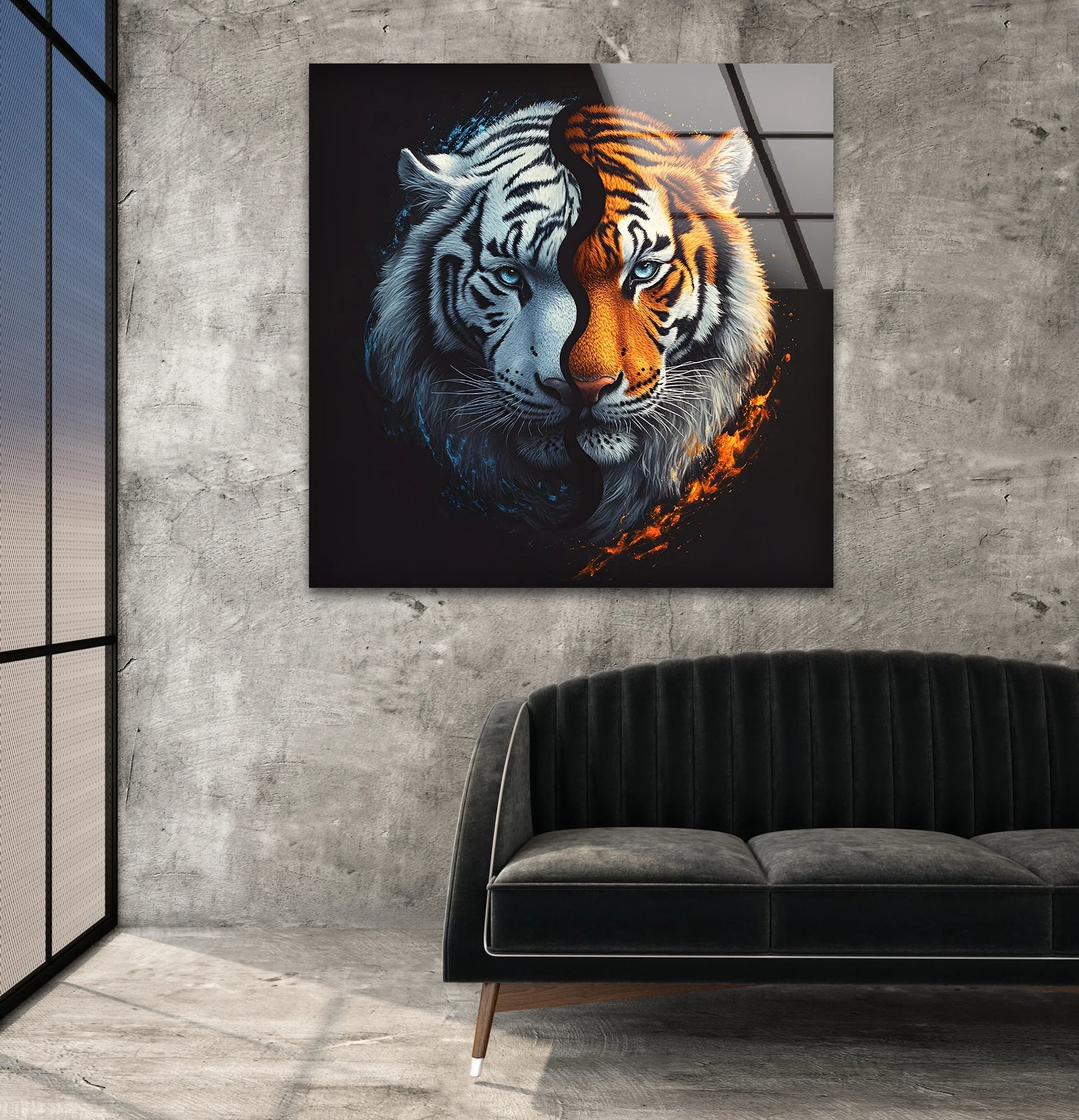 Glass wall art featuring a split tiger face with one half white and blue-toned and the other half orange and fiery.
