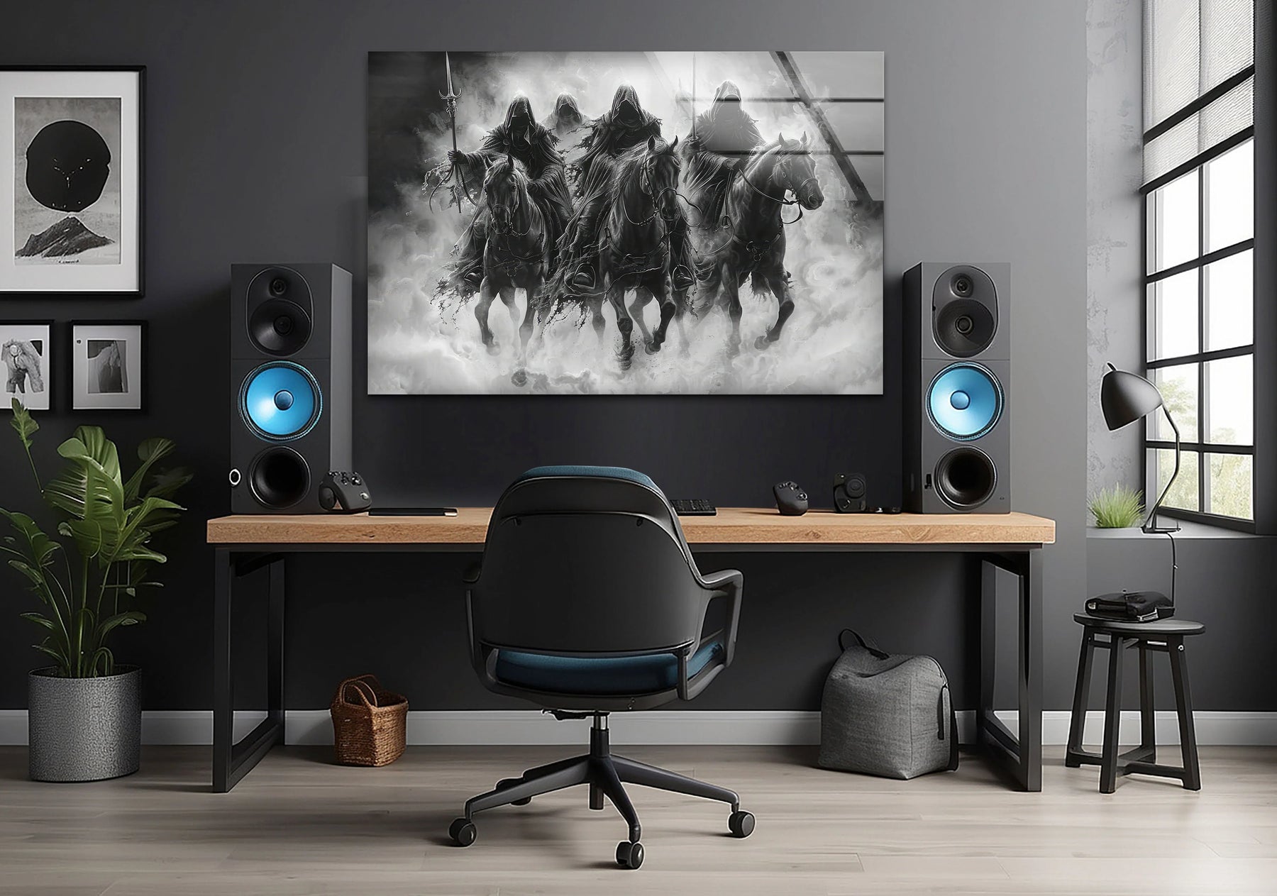 Black and white glass wall art featuring hooded riders on dark horses emerging through swirling mist.
