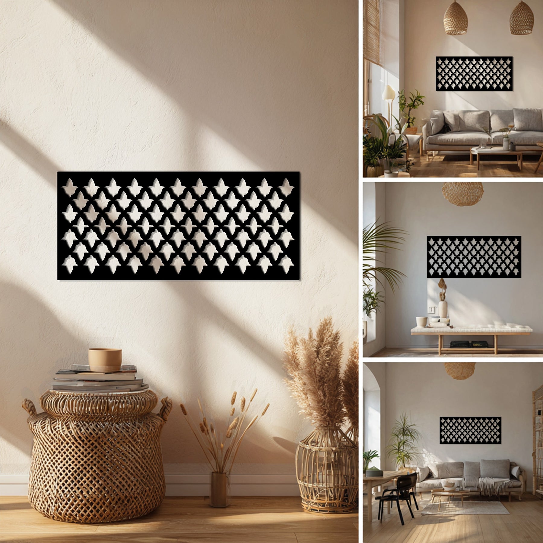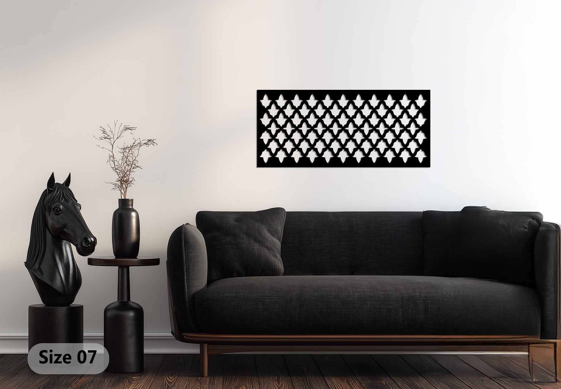 مصنوعة من معدن متين مقطوع بدقة بتقنية الليزر ومطلية باللون الأسود غير اللامع، تُعد هذه القطعة الفنية الجدارية مثالية للديكورات الداخلية العصرية التي تُقدّر الخطوط البسيطة والتصميم الخالد. سواء عُلّقت في غرف المعيشة أو المكاتب أو المداخل، فإنها تُضفي لمسة من الرقي والتناغم البصري على أي مكان.