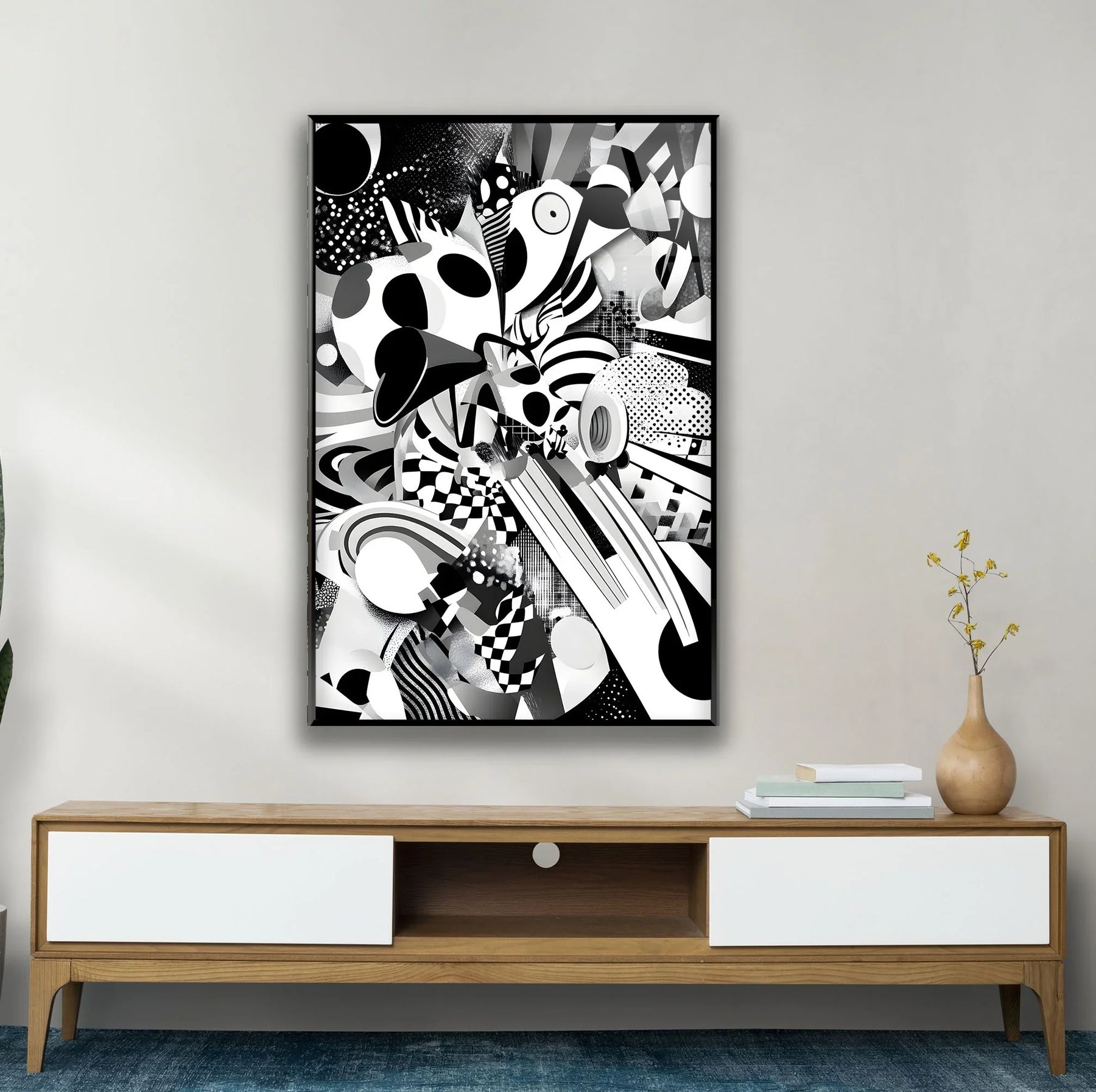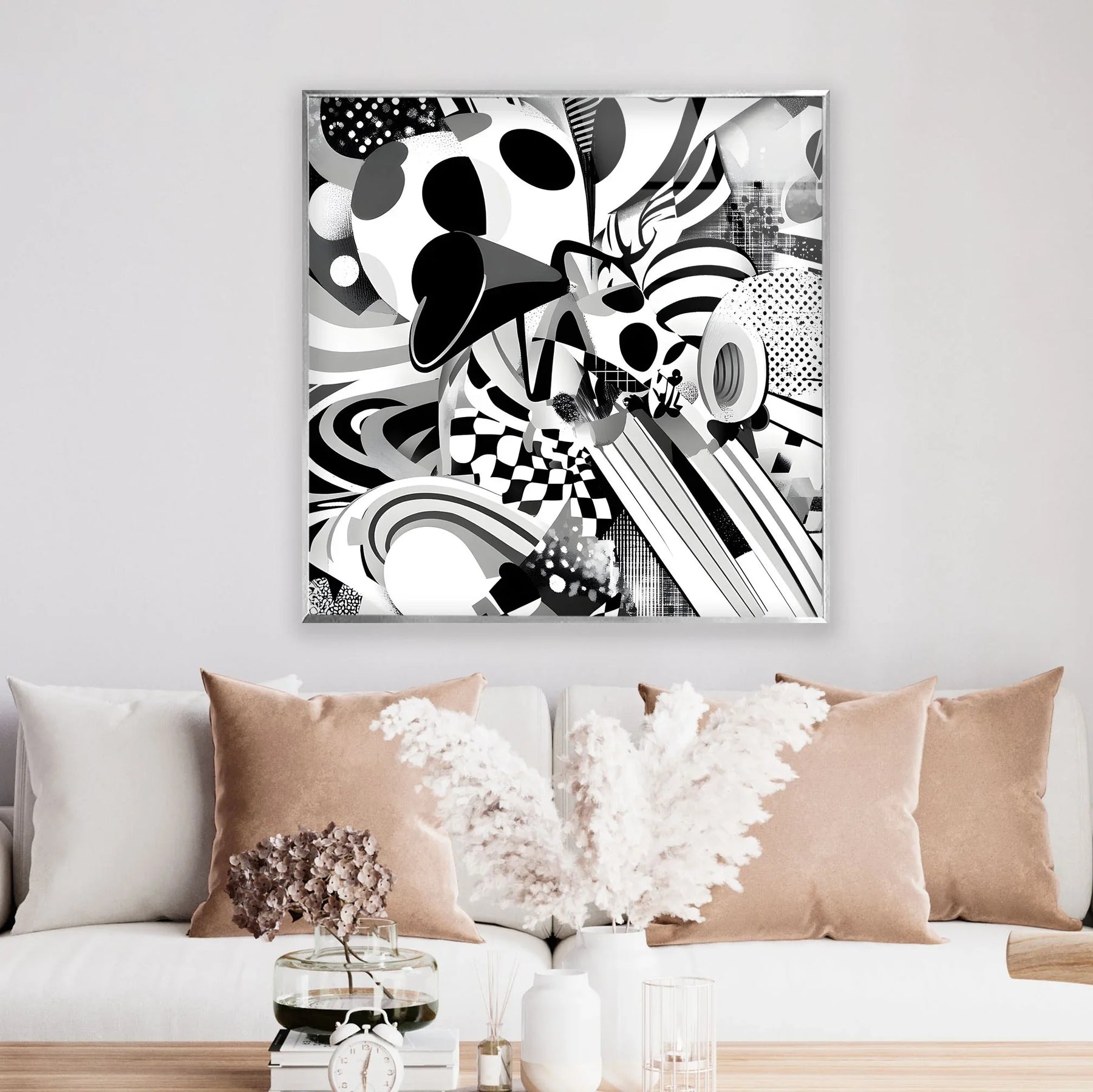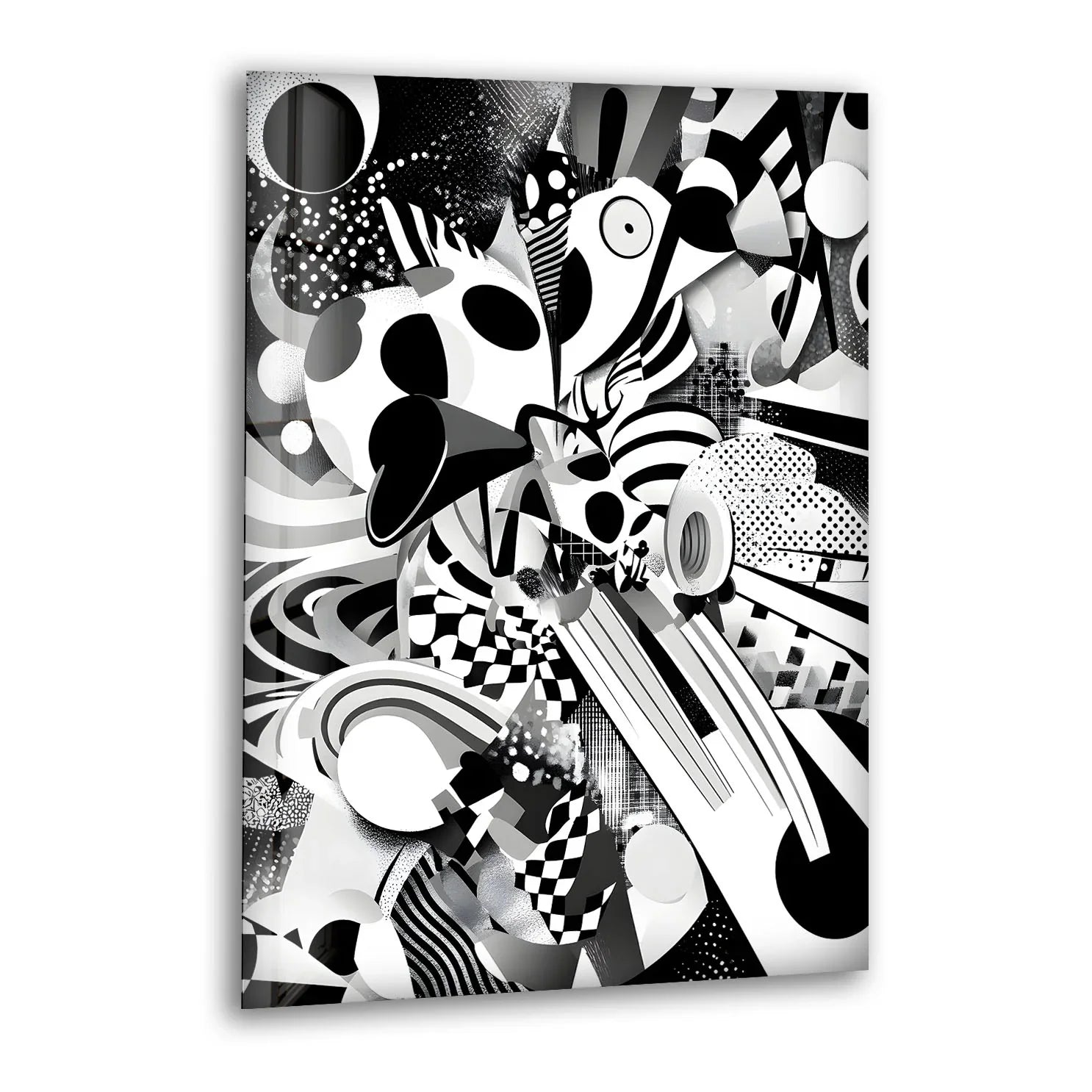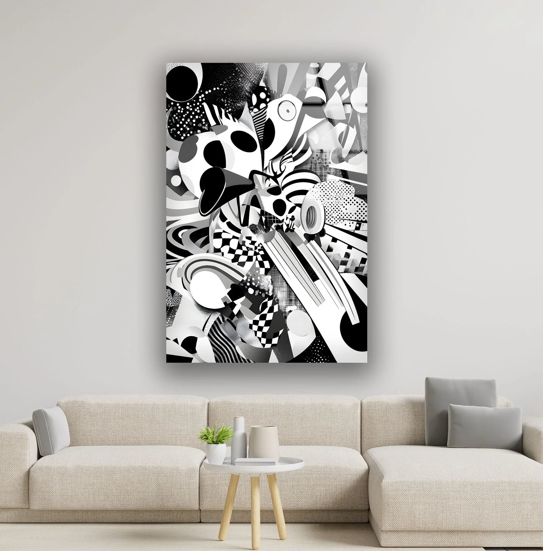 Black and white glass wall art featuring an abstract collage of geometric shapes, bold curves, and dynamic patterns.