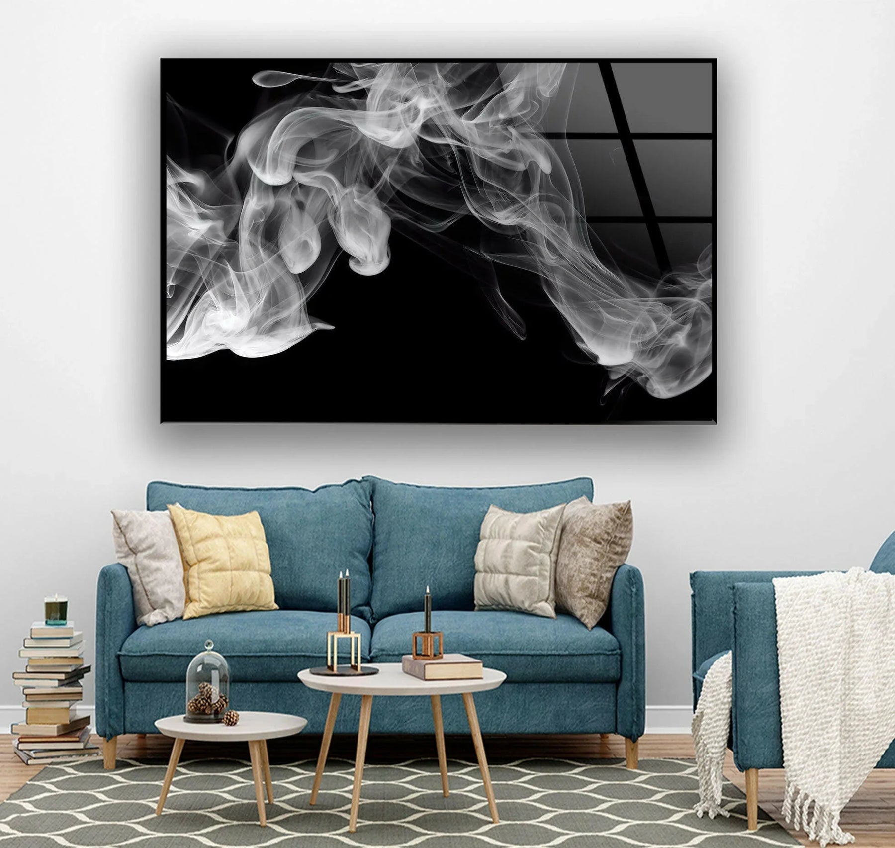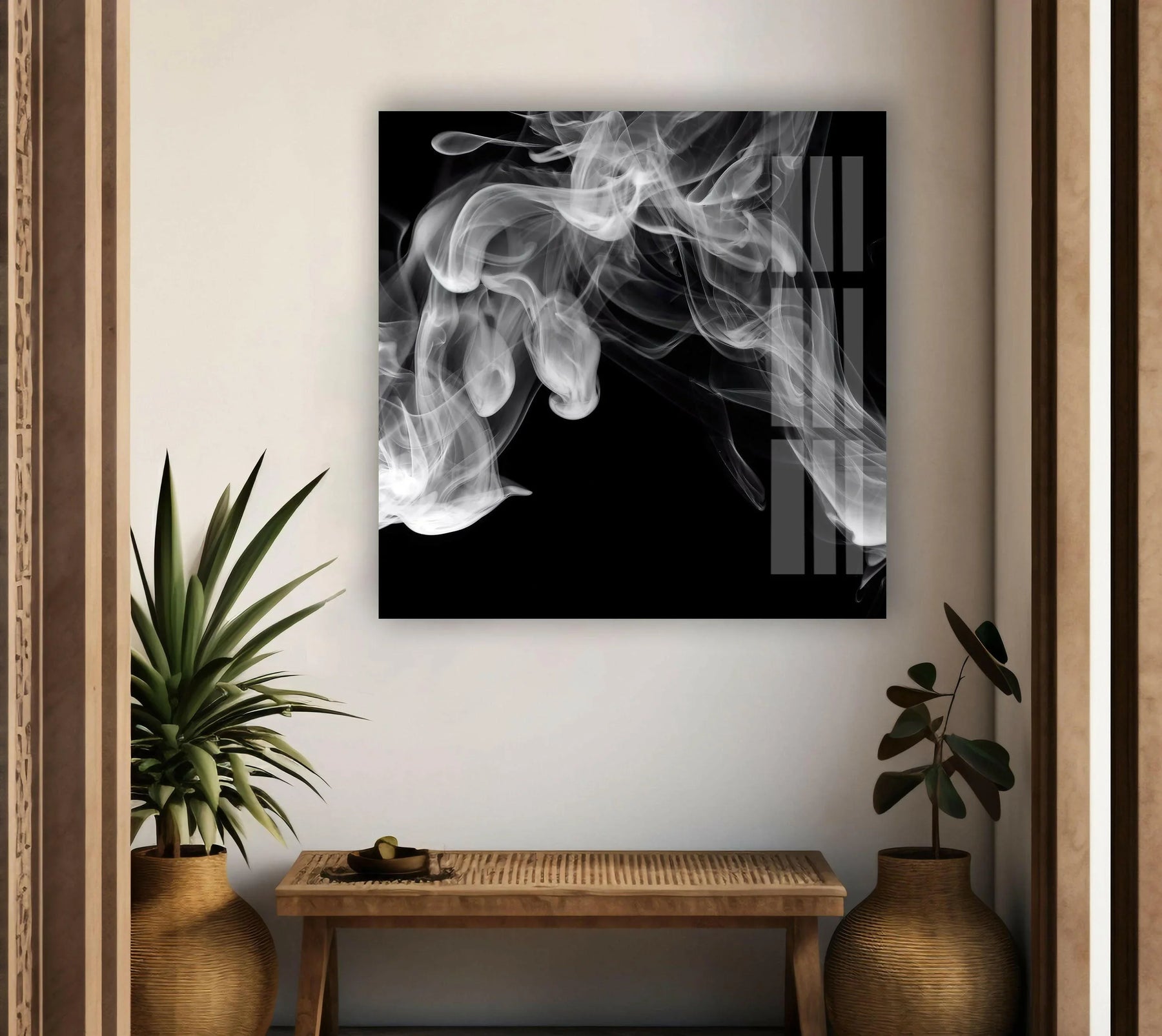 Black and white glass wall art featuring flowing white smoke swirling across a deep black background.