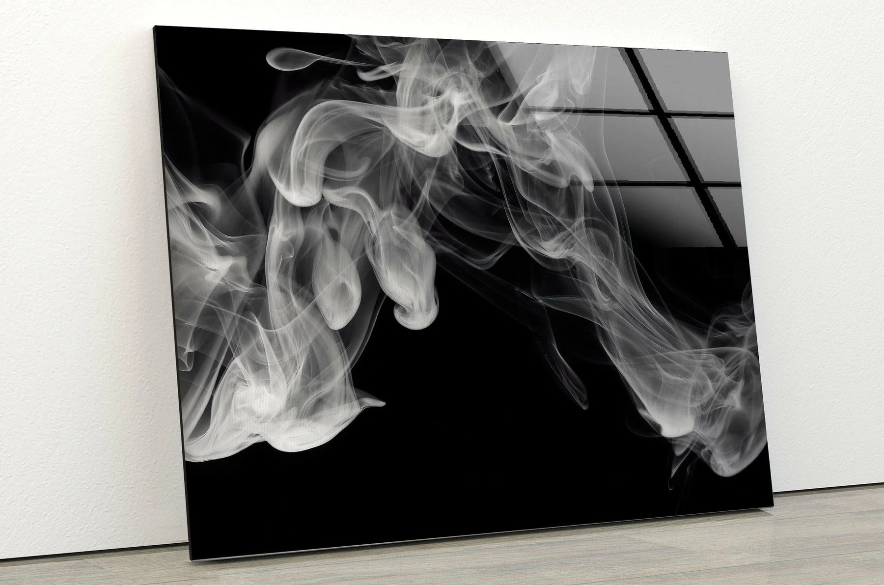 Soft white smoke forms on a black backdrop printed on tempered glass creating modern abstract decor.