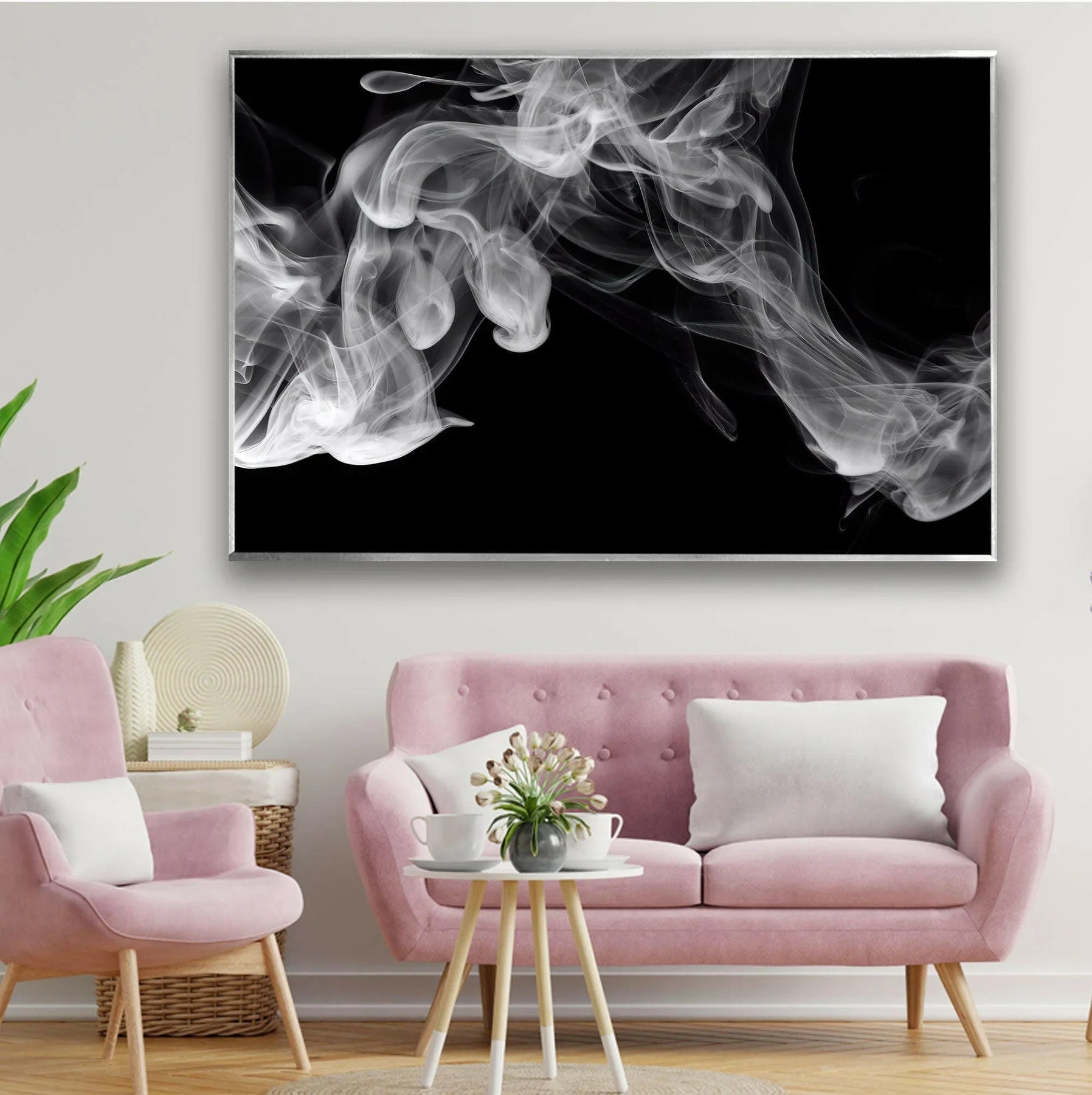 أضف عنصرًا من الإثارة إلى مساحتك مع هذا الدخان الأسود الجذاب فن جداري تجريديخيوط الدخان الأبيض الناعمة والمتموجة على خلفية سوداء داكنة تُضفي تأثيرًا ساحرًا وساحرًا. هذه القطعة مثالية للديكورات الداخلية العصرية، إذ تُضفي لمسة من الأناقة والغموض على ديكورك.