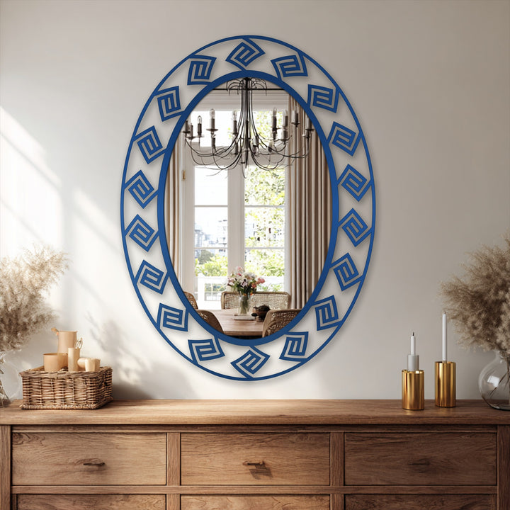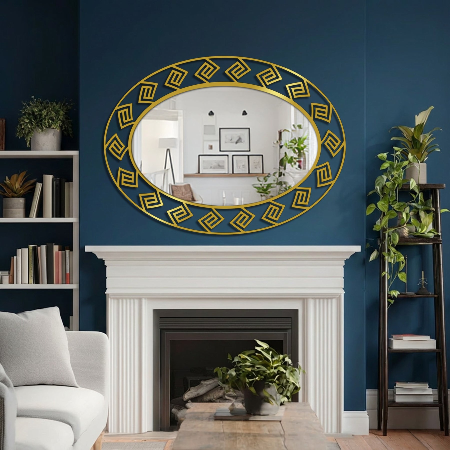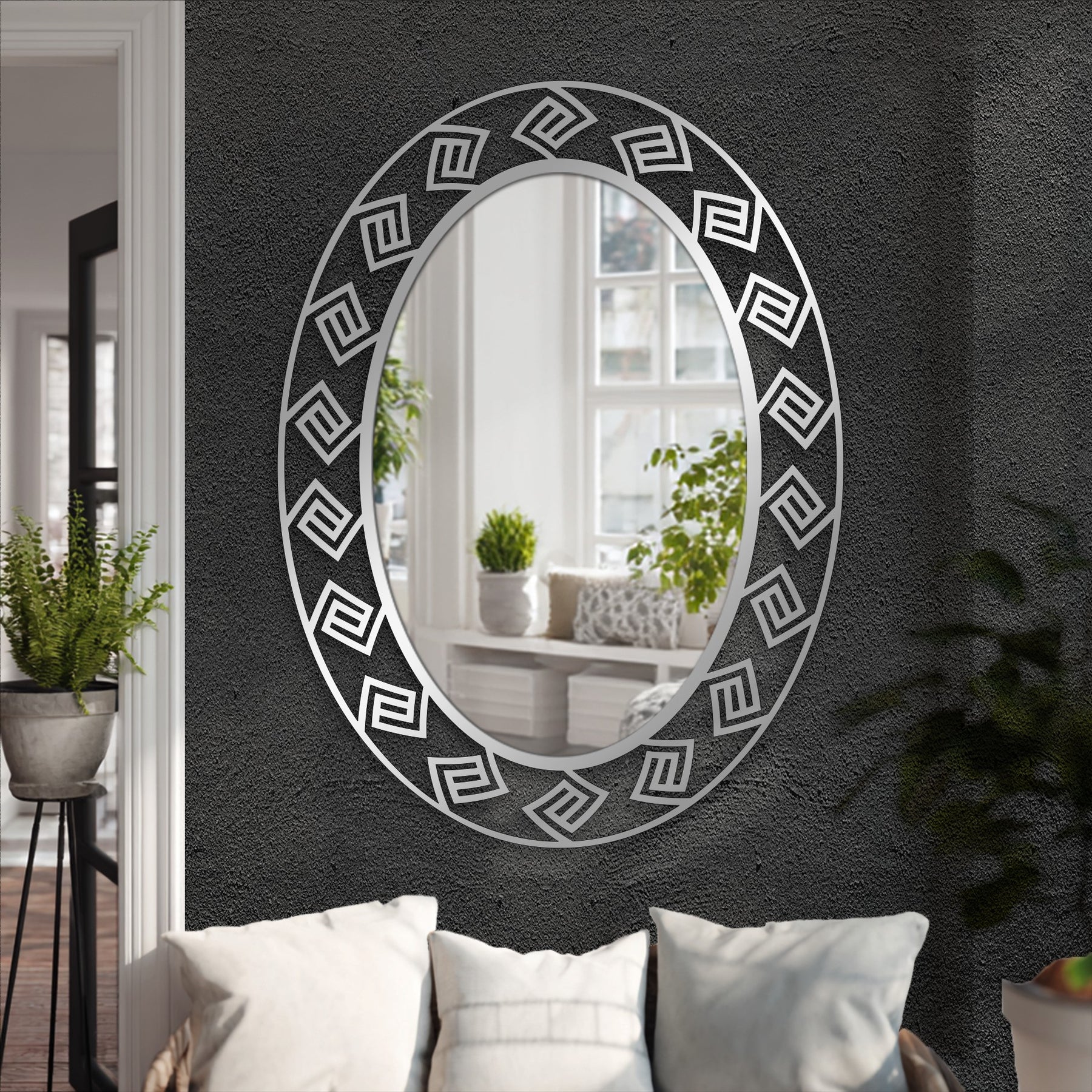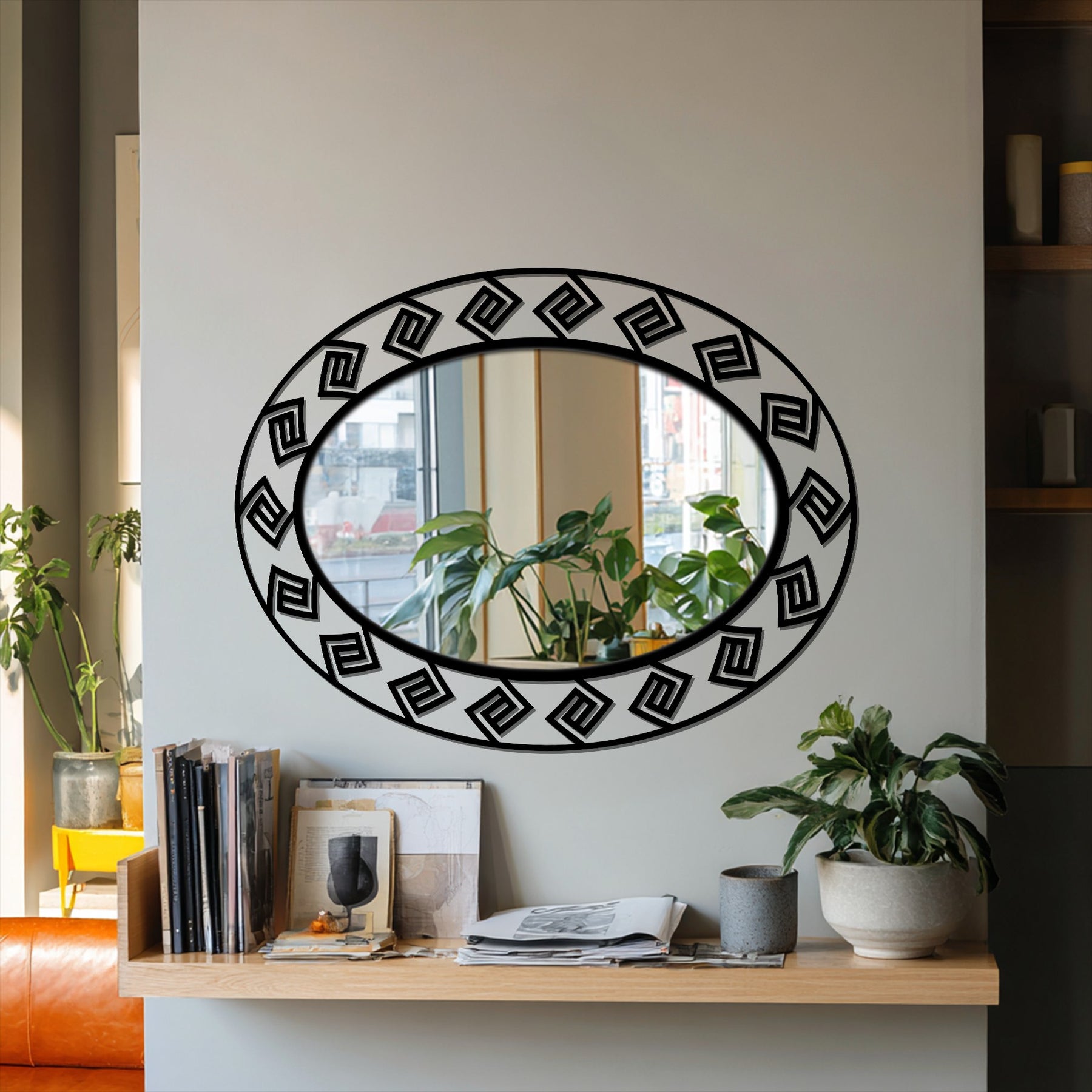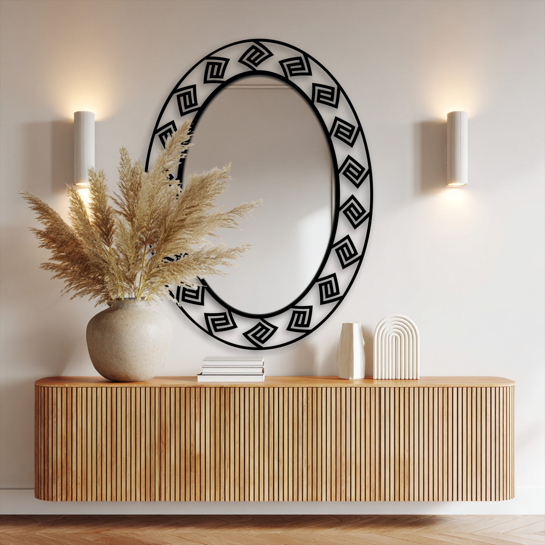 Elevate your space with this striking oval decorative wall mirror, defined by a bold geometric border that blends modern precision with timeless style. The repeating maze-inspired pattern creates movement and depth around the reflective surface, turning a functional piece into an artful statement.
