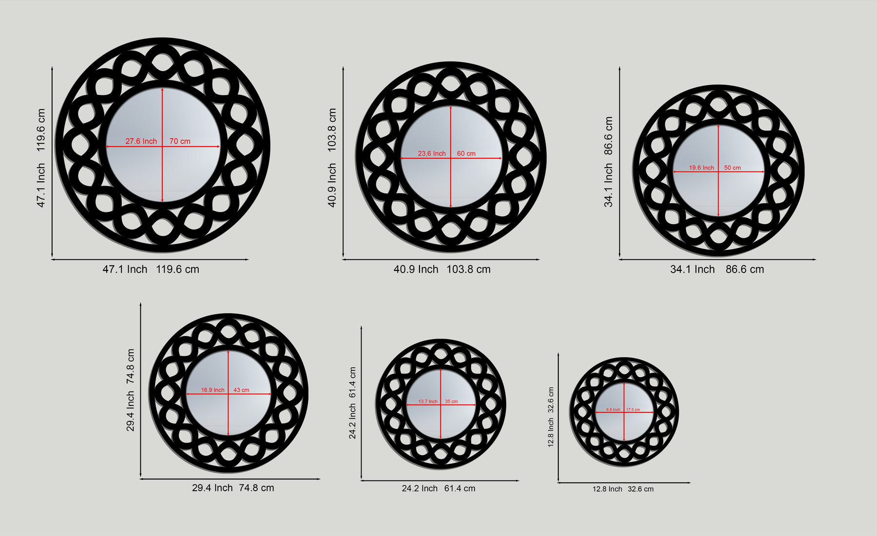 This elegant round wall mirror features a continuous looping frame inspired by the infinity motif—symbolizing flow, connection, and harmony. The repeating ribbon-like shapes form a rhythmic circular pattern that beautifully embraces the smooth mirror center, creating visual balance without overpowering the space.