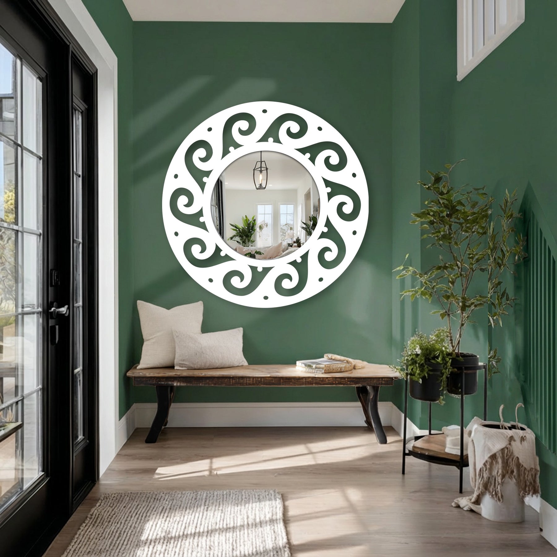 Displayed as standout mirror wall decor, this modern wall mirror transforms blank walls into intentional design highlights. The structured frame supports the scroll pattern cleanly, allowing the swirling shapes to stay airy, rhythmic, and inviting.