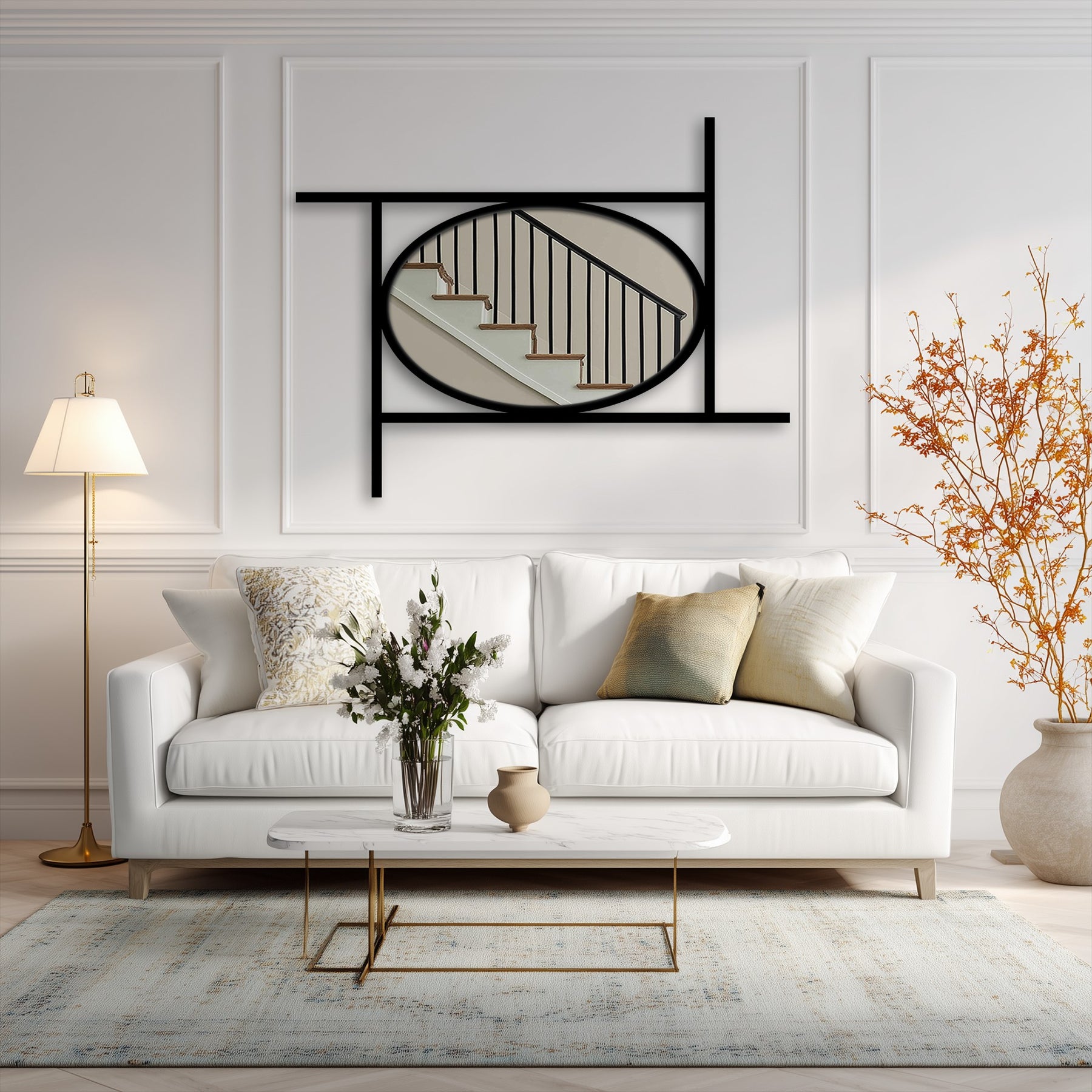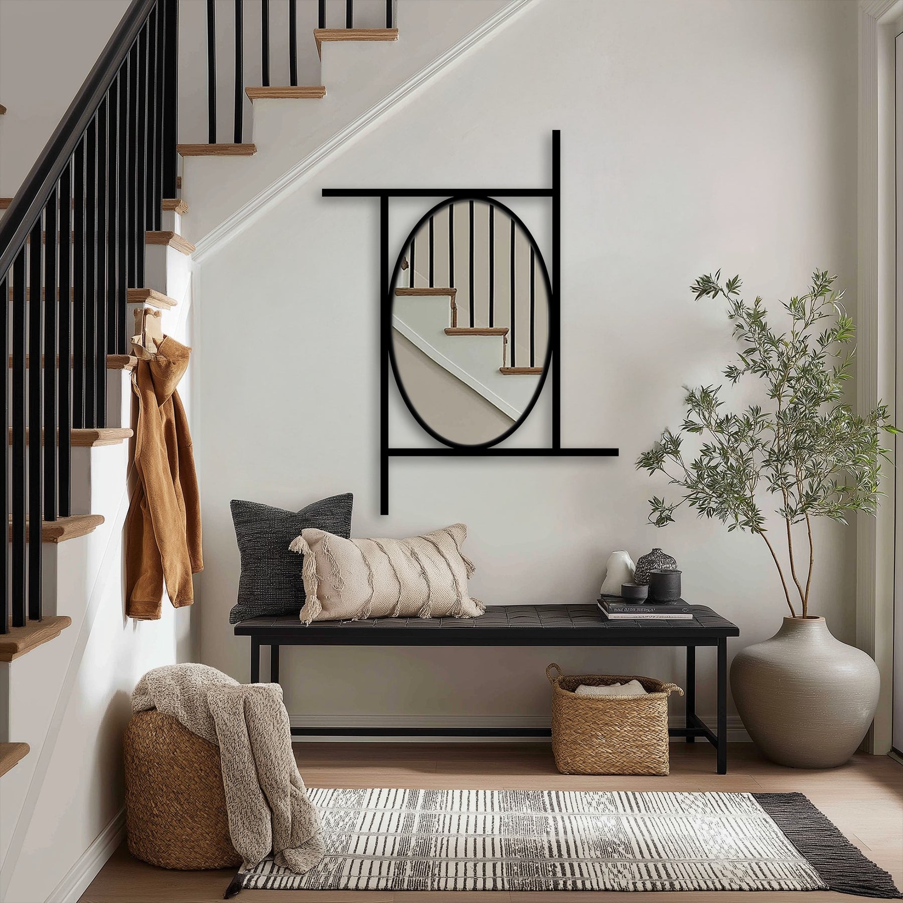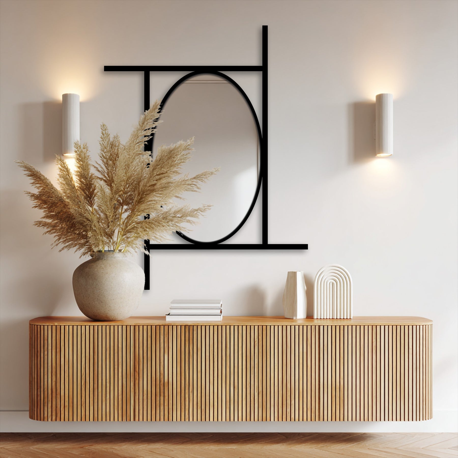 A bold oval mirror rests within a clean linear frame—perfectly balanced yet playfully asymmetric.