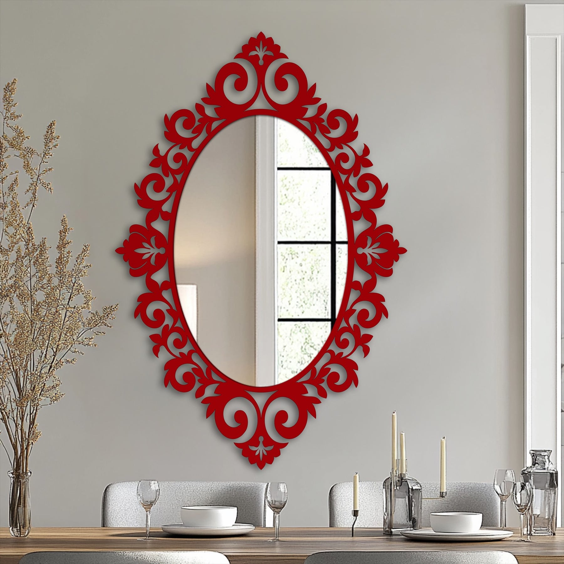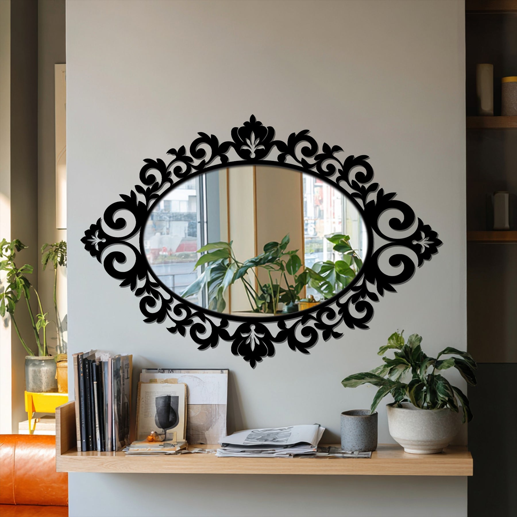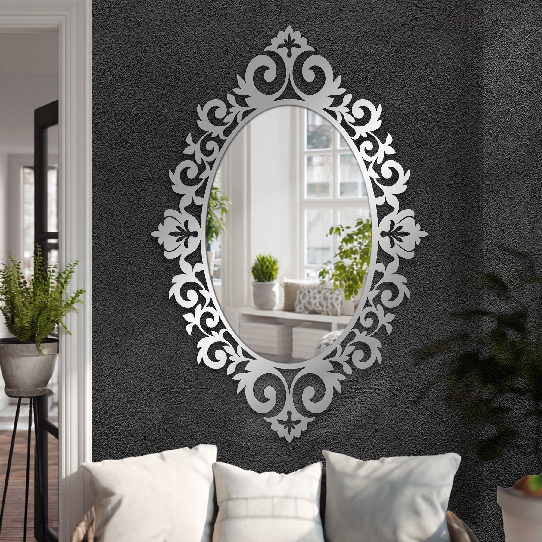 Displayed as standout mirror wall decor, this modern wall mirror transforms ordinary rooms into curated, sophisticated spaces. The ornate frame elevates interiors with depth and artistry while maintaining a refined, balanced aesthetic.