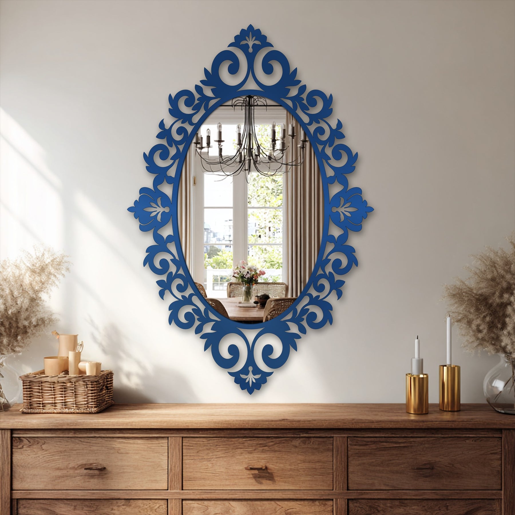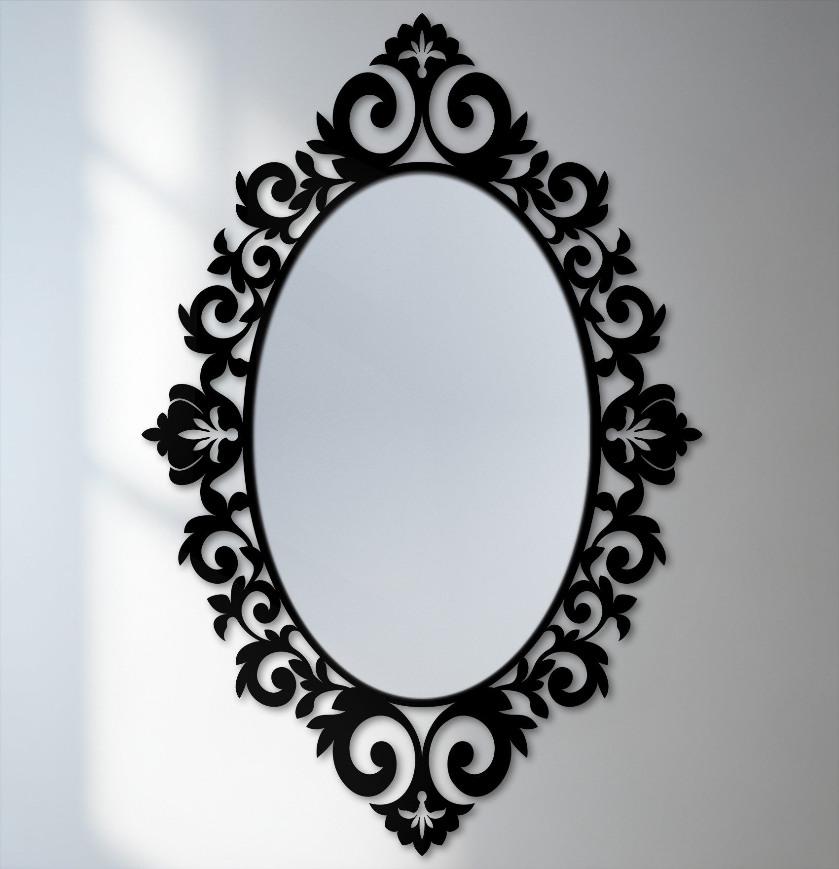 This dramatic oval wall mirror is framed with sculptural scrollwork and flourished botanical accents, creating a regal silhouette that commands attention. The pointed top and bottom crest add height and elegance, while the sweeping curves deliver movement, texture, and timeless charm.