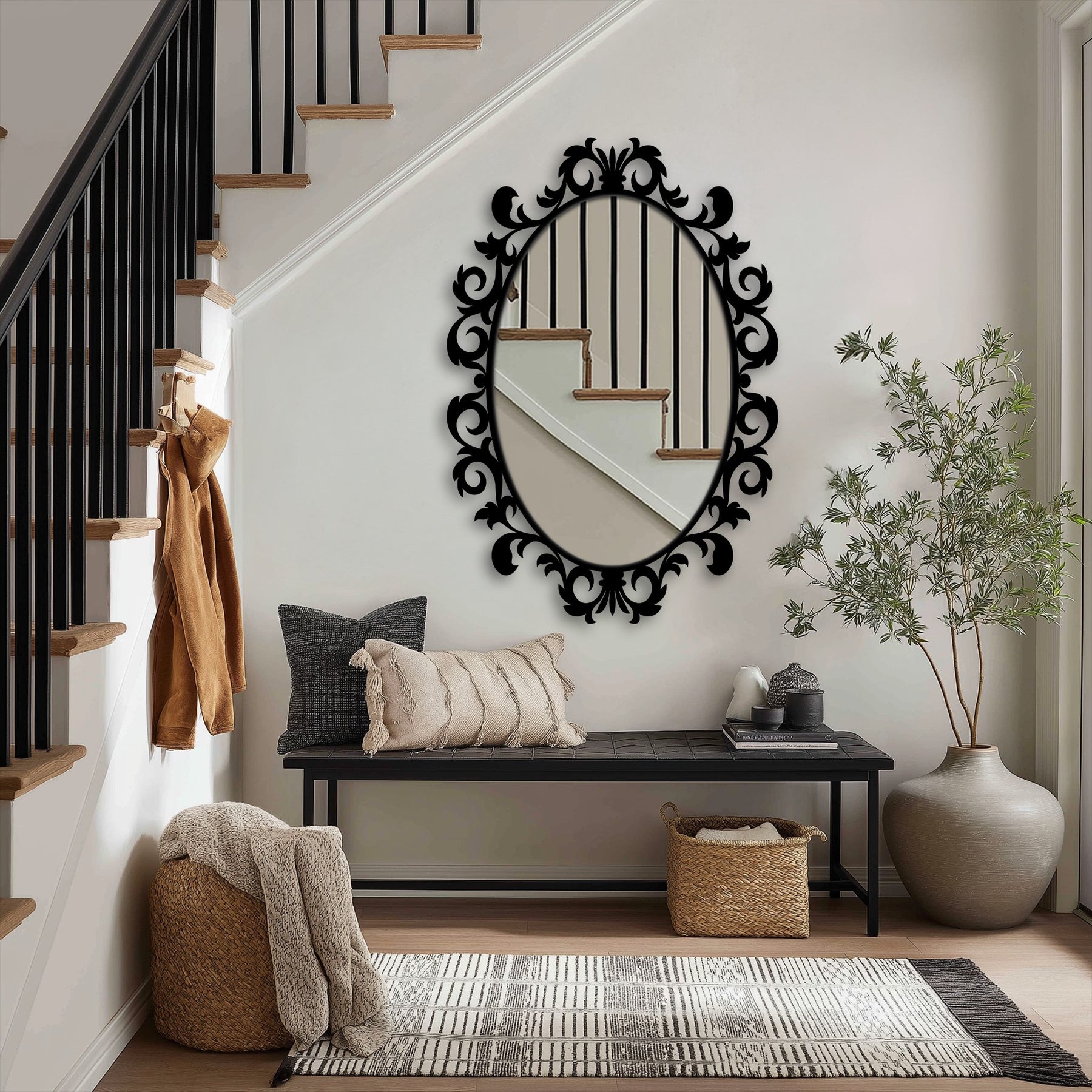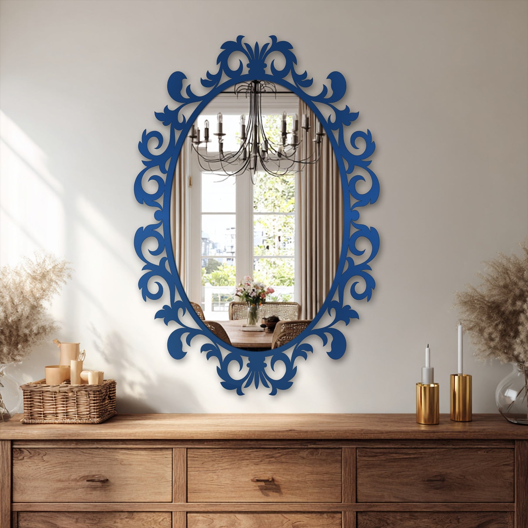 This elegant oval wall mirror features a refined scrollwork frame inspired by classic décor and timeless ornamental styling. Graceful curves wrap around the mirror surface, balanced by leaf-like flares at the top and bottom that create a regal, elongated silhouette.