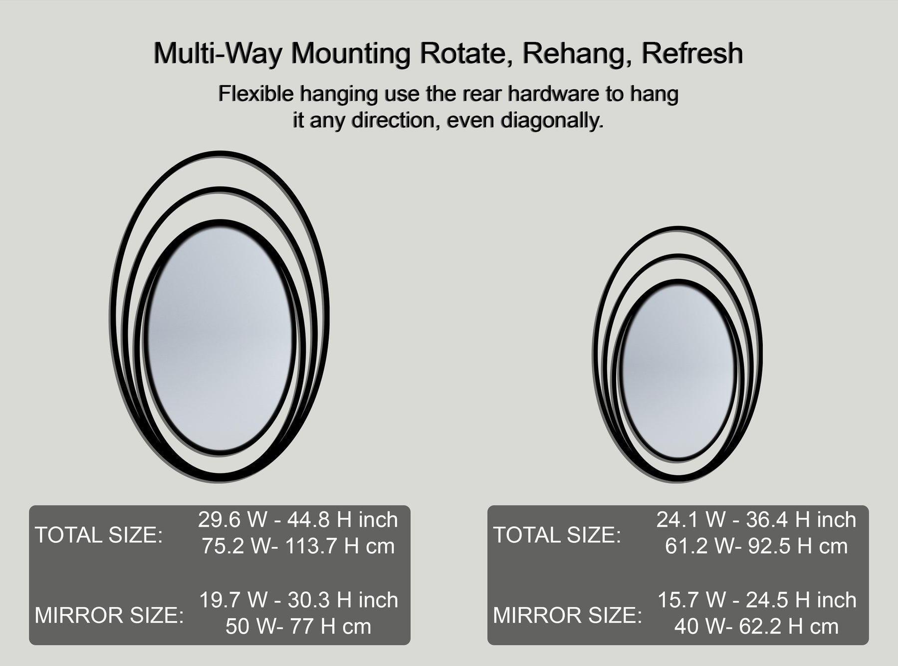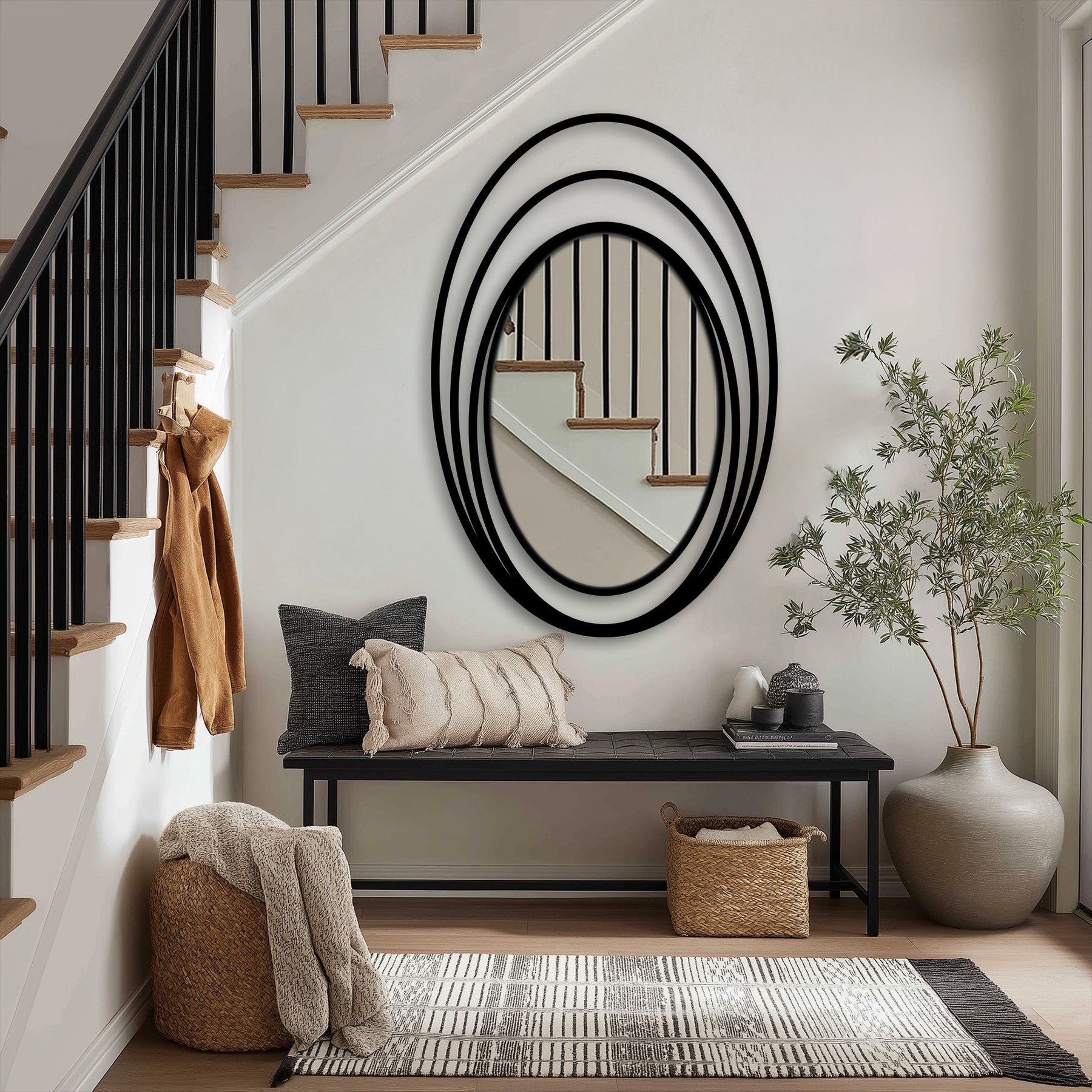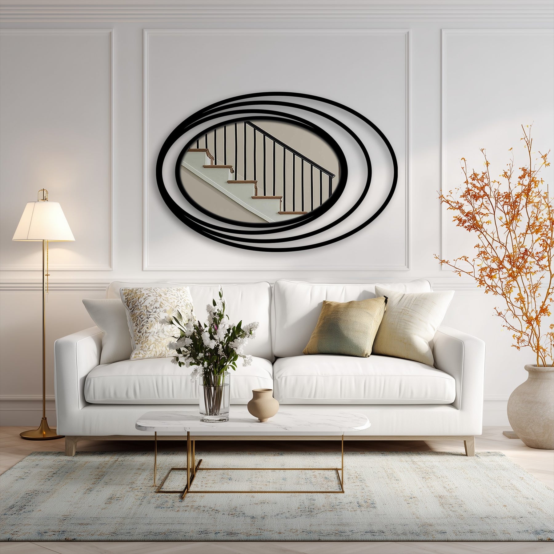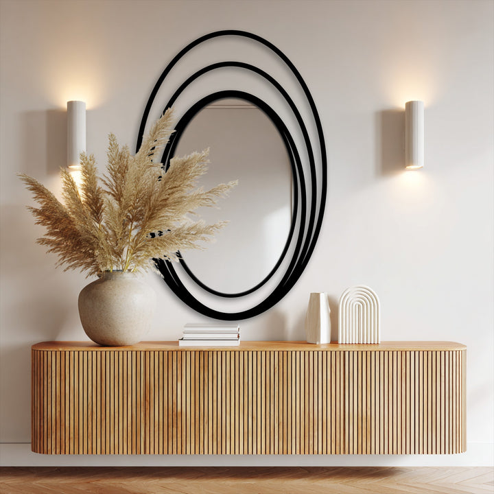 Encircled by three thin, floating oval bands forming a radiant “halo” effect, this mirror brings depth, motion, and elegance into any room—without overwhelming the space.