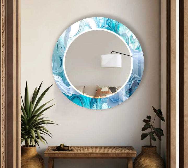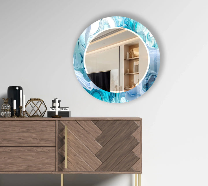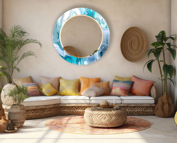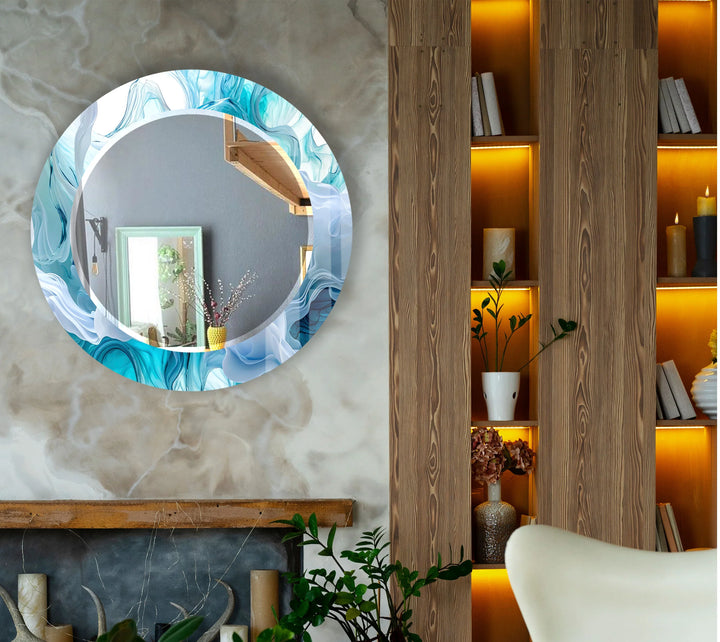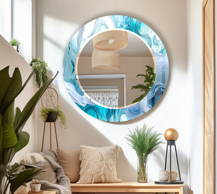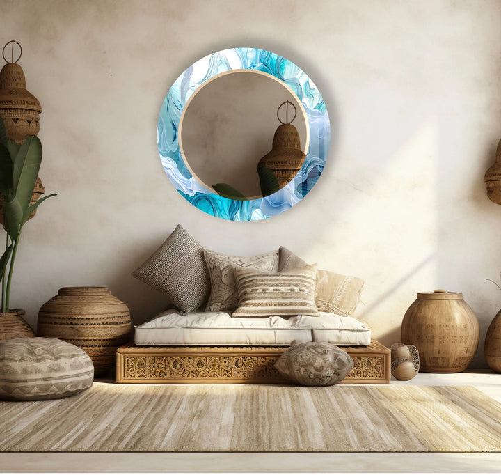 Aqua Blue Swirl Round Wall Mirror – Ocean-Inspired Glass Frame for Coastal Home Decor