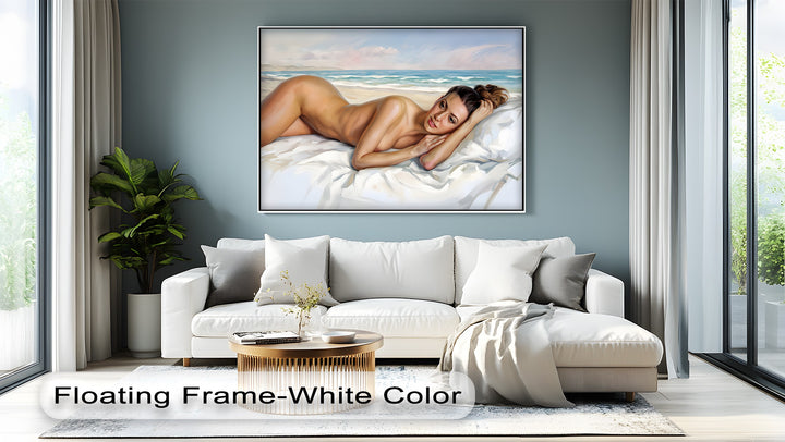 The vivid details, natural skin tones, and painterly softness create a luminous atmosphere—perfect for elevating a bedroom wall with refined intimacy. Ideal for those seeking framed canvas wall art that merges erotic elegance with coastal calm, this piece is available in large canvas and oversized wall art formats.