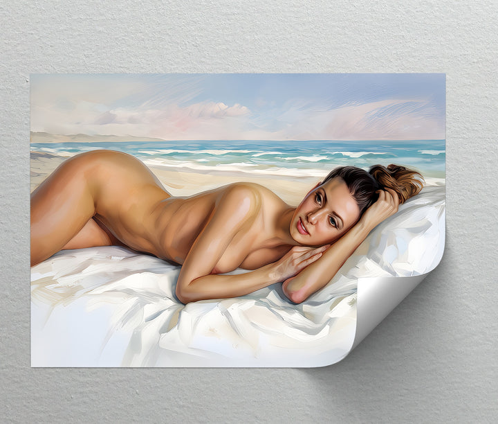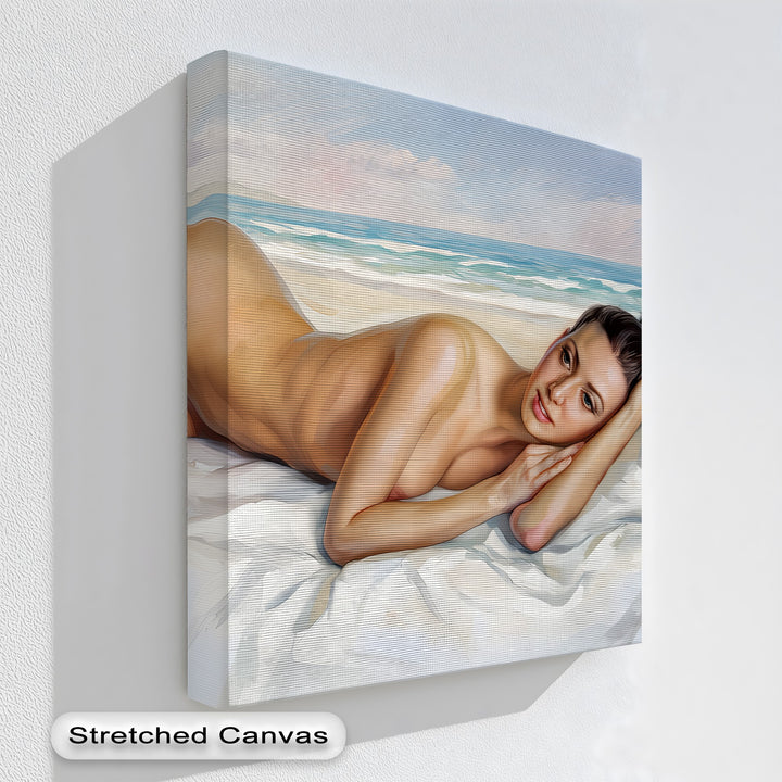 Serenity, seduction, and sea breeze—Bare Bliss by the Shore captures a tranquil moment where sensuality meets the soft rhythm of the ocean. This erotic canvas wall art portrays a reclining nude figure on white linens, framed by sunlit sands and glistening waves.