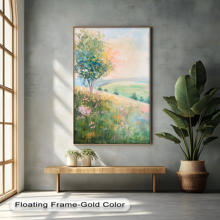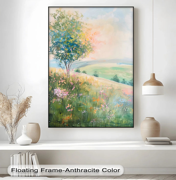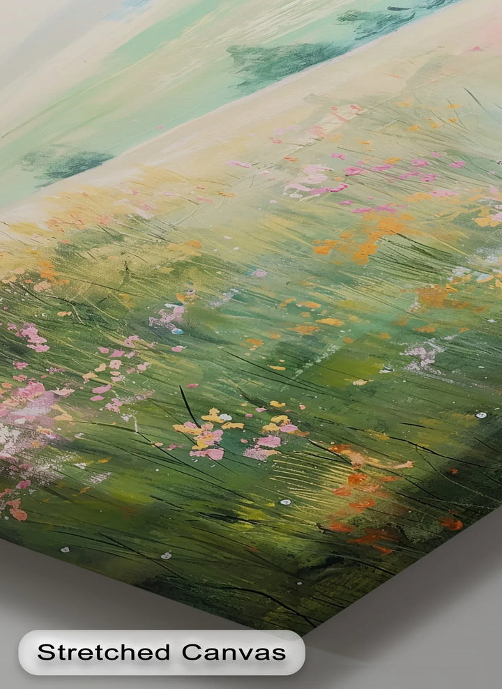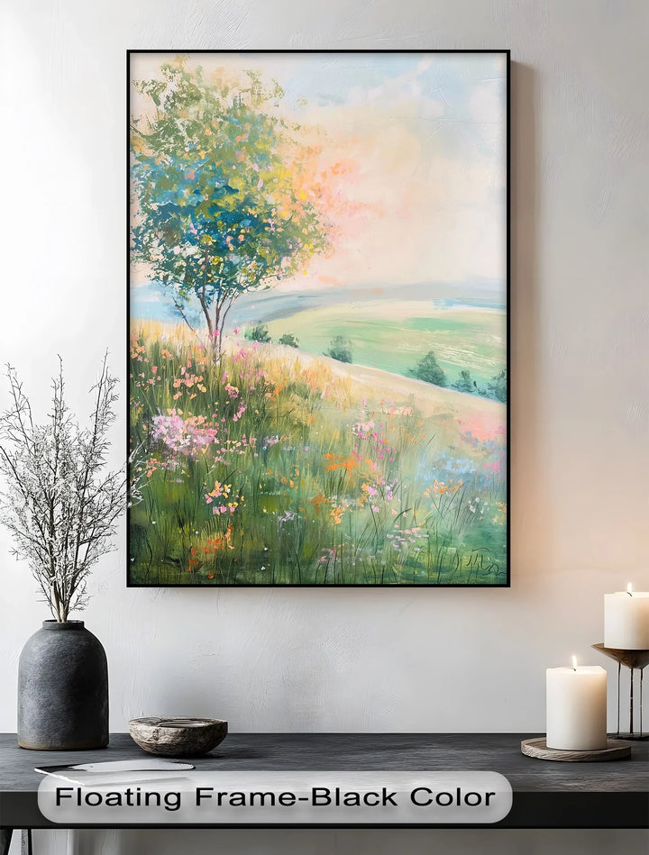 Step into a dreamy countryside where gentle hills roll beneath soft skies, and wildflowers bloom in vibrant harmony. This canvas print captures the essence of spring with a single leafy tree basking in a glowing pastel light, surrounded by fields of scattered wildflowers in pink, lavender, orange, and yellow hues. The soft brushstrokes and delicate composition evoke a feeling of calm, warmth, and natural beauty.