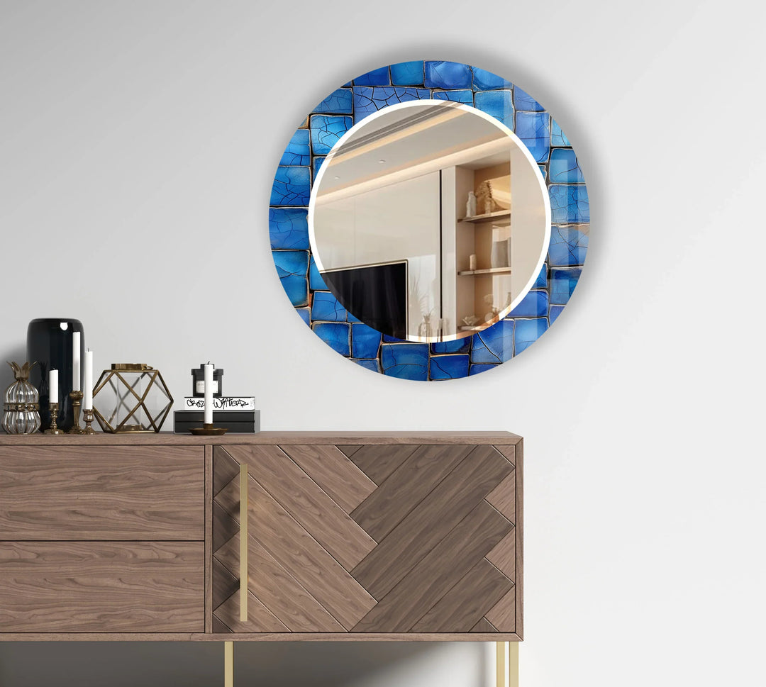 Blaues Mosaik rund Wandspiegel – Küstenglasrahmen für moderne Wohndekoration