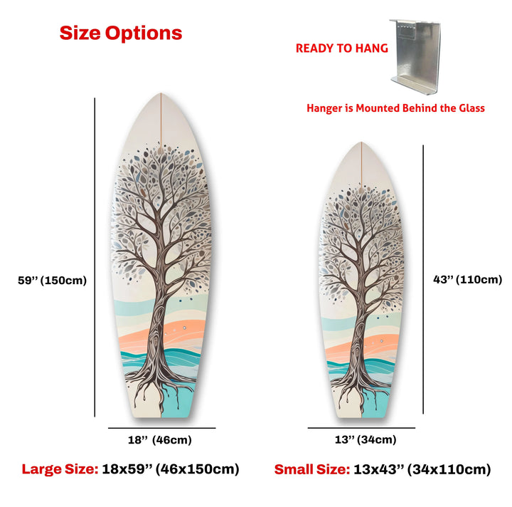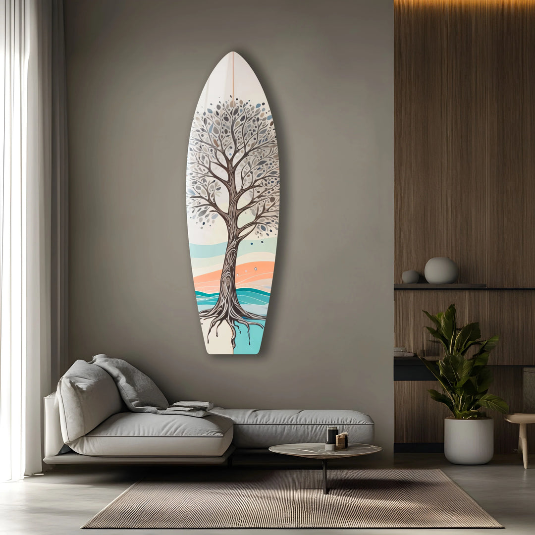 Holen Sie sich mit dem Brown Tree Surfboard die Natur in Ihr Zuhause coole Kunstwerke Und Glasbilder. Mit einem komplizierten Baumdesign in sanften Pastelltönen bietet dieses Wandkunstwerk in Surfbrettform eine harmonische Mischung aus organischer Schönheit und modernem Stil.