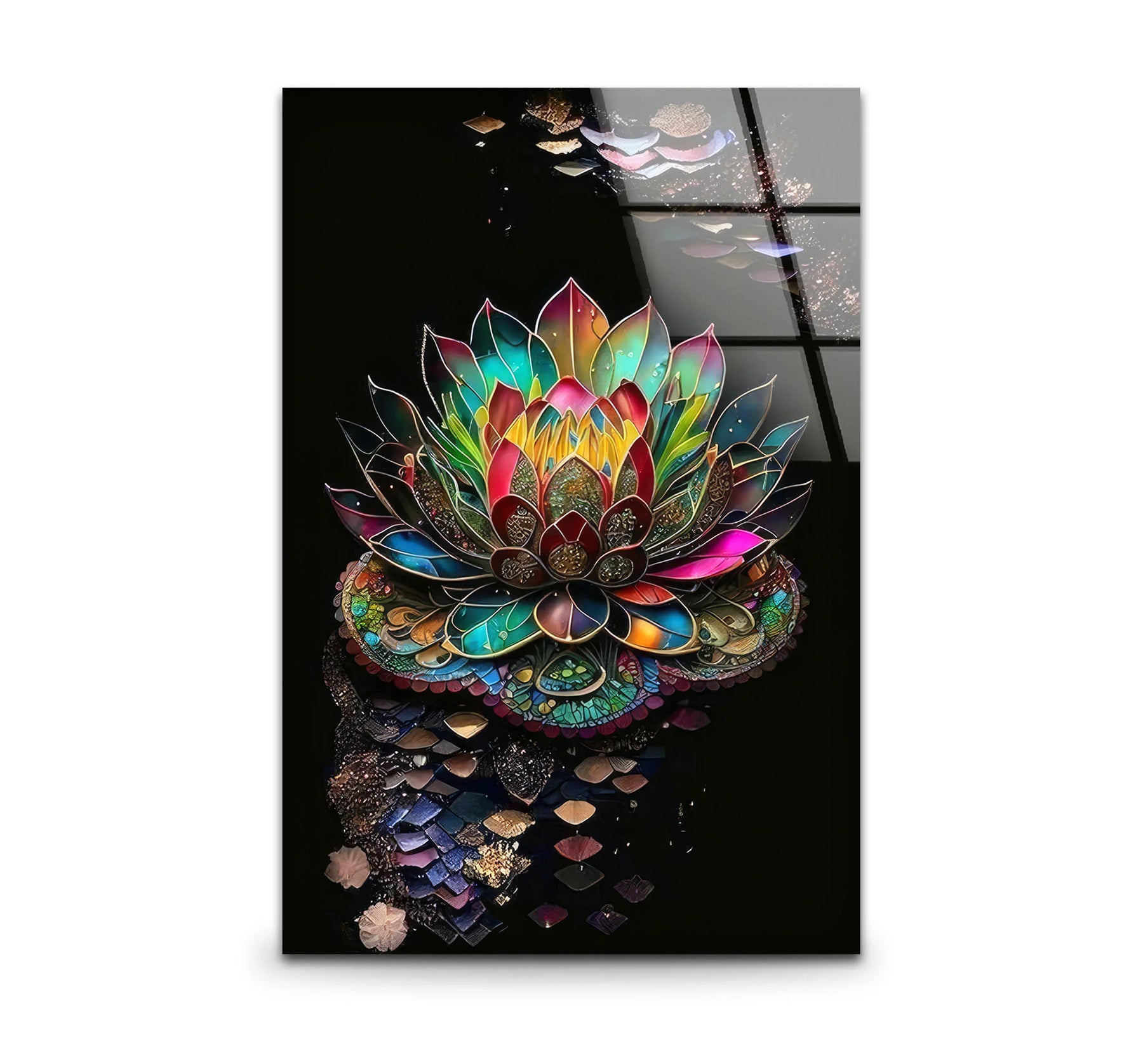 Awaken your space with vibrant serenity through this Radiant Lotus Flower Wall Art. Featuring a brilliantly colored lotus blossom with intricate mandala-inspired patterns, this artwork symbolizes enlightenment, purity, and spiritual growth. Set against a bold black background, the vivid petals glow in jewel tones of pink, turquoise, gold, and green. UV printed on premium tempered glass, it offers high-definition clarity and a luxurious glossy finish—ideal for yoga studios, boho spaces, or meditation corners.
