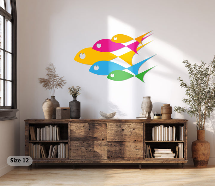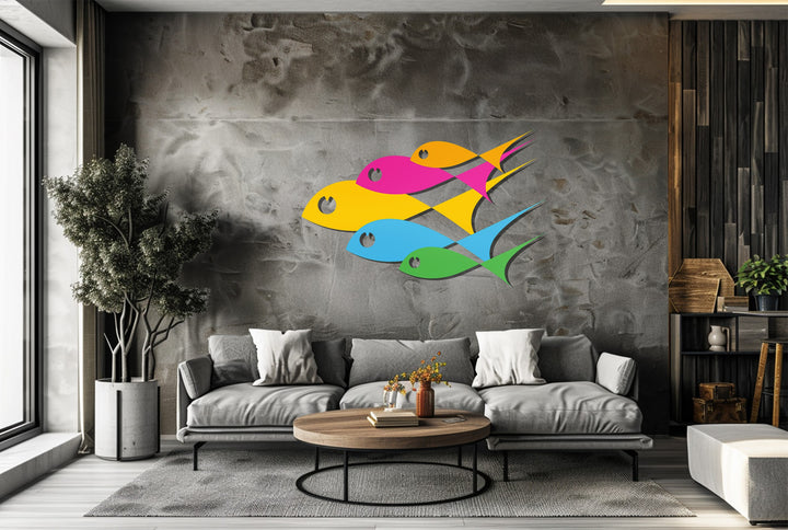 Dive into a sea of color and creativity with Color Splash Harmony Metal Wall Art, a modern abstract interpretation of swimming fish in vivid hues of yellow, pink, blue, and green. This playful yet elegant design captures the rhythm of underwater life through bold geometric forms and lively motion.
