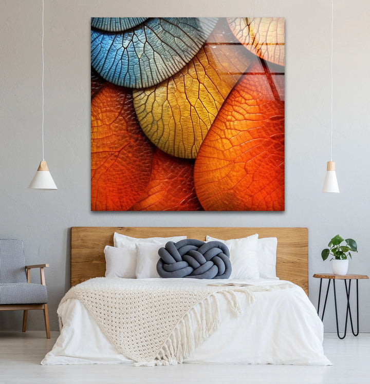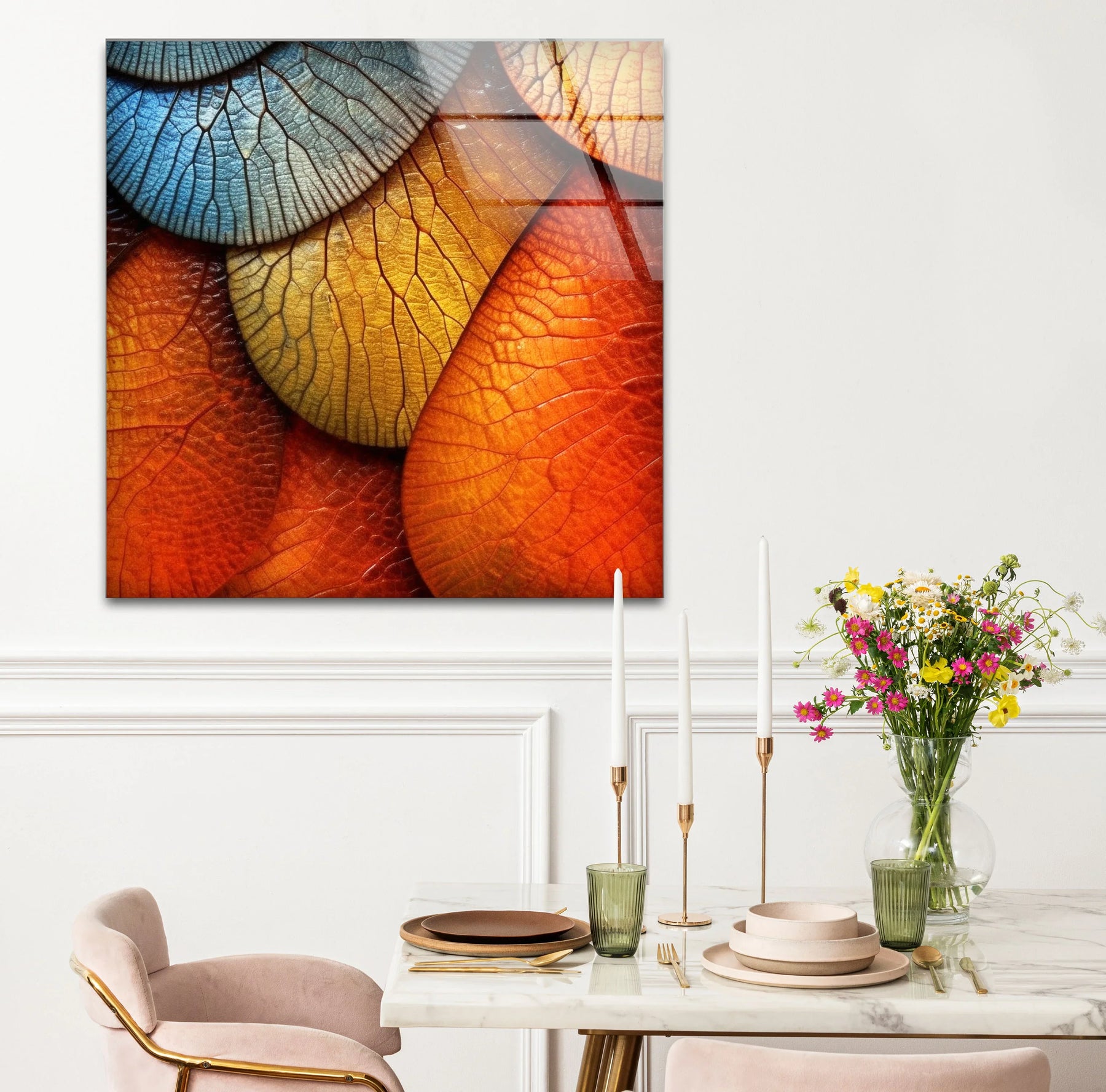 Farbenfrohe Wandbilder mit Blätterstruktur – Abstrakter Naturglasdruck für moderne Interieurs