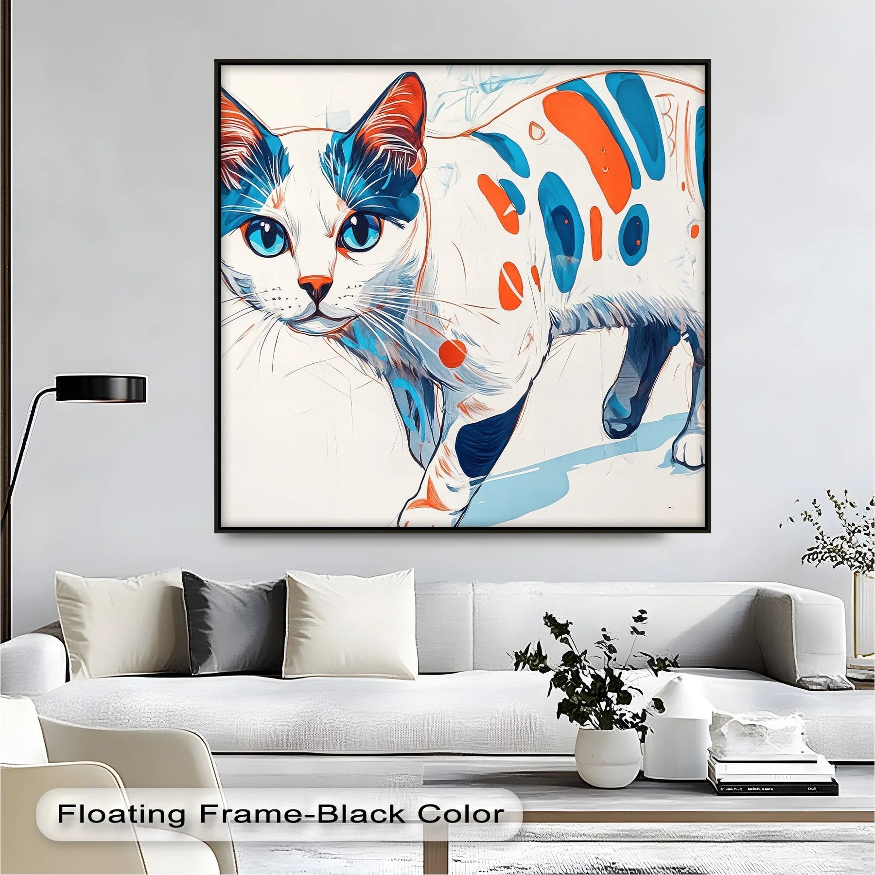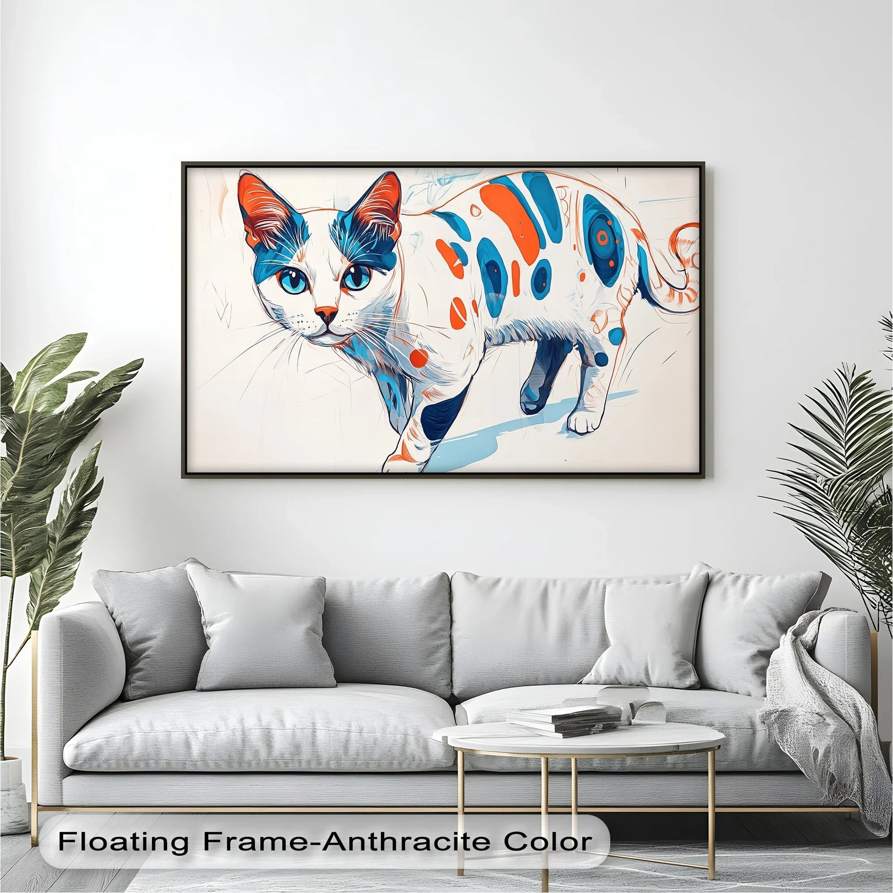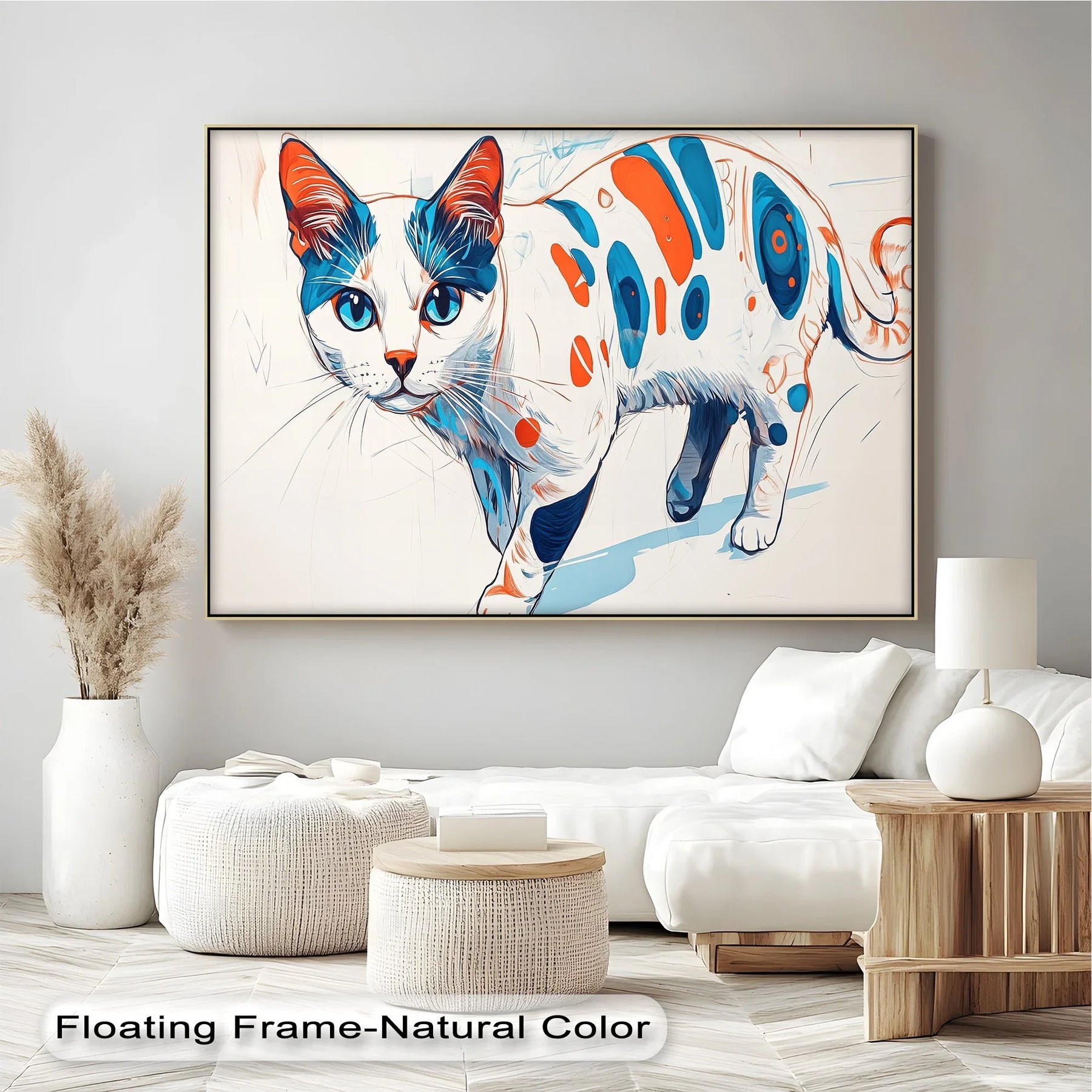 A burst of modern expression, this vibrant cat canvas fuses abstract art with the charisma of a curious feline. Bold red and blue patterns dance across a crisp white background, bringing this stylish kitty to life with electric energy. Whether you're a cat lover or simply drawn to edgy, colorful wall art, this piece instantly transforms any room into a statement.