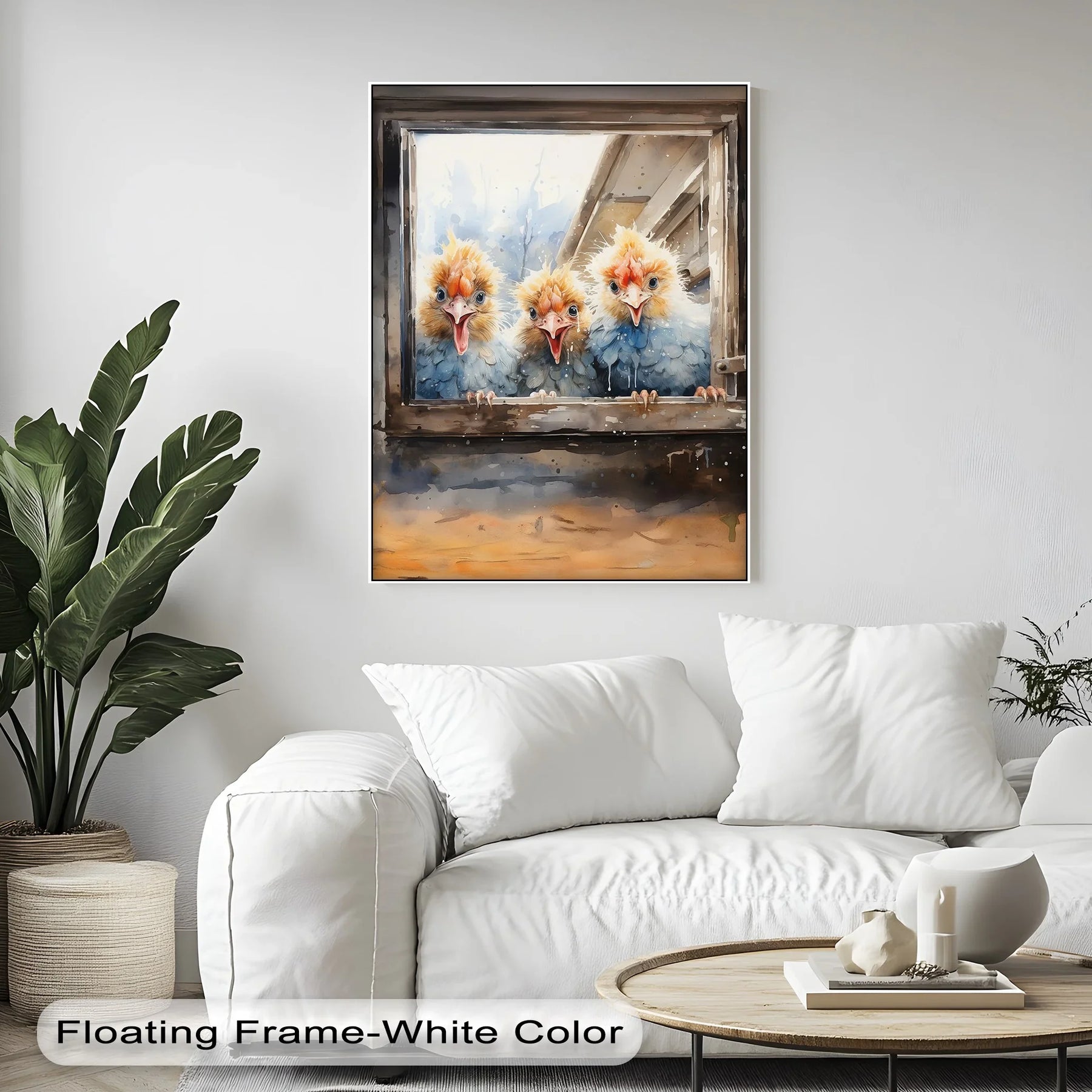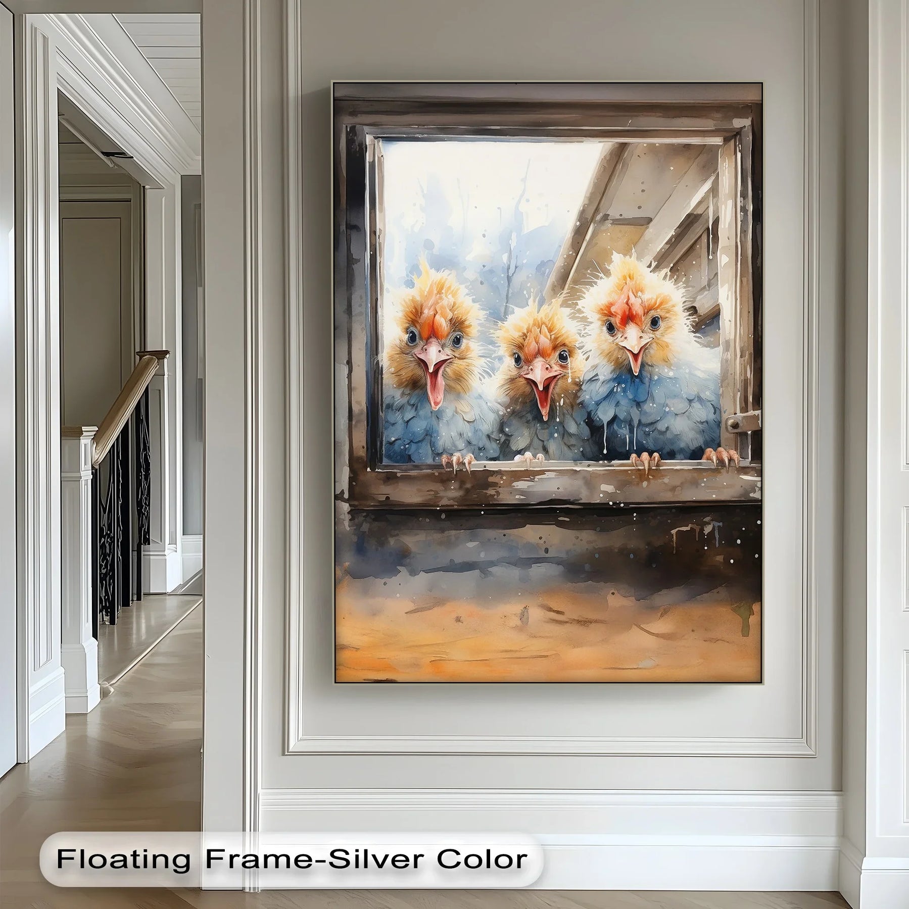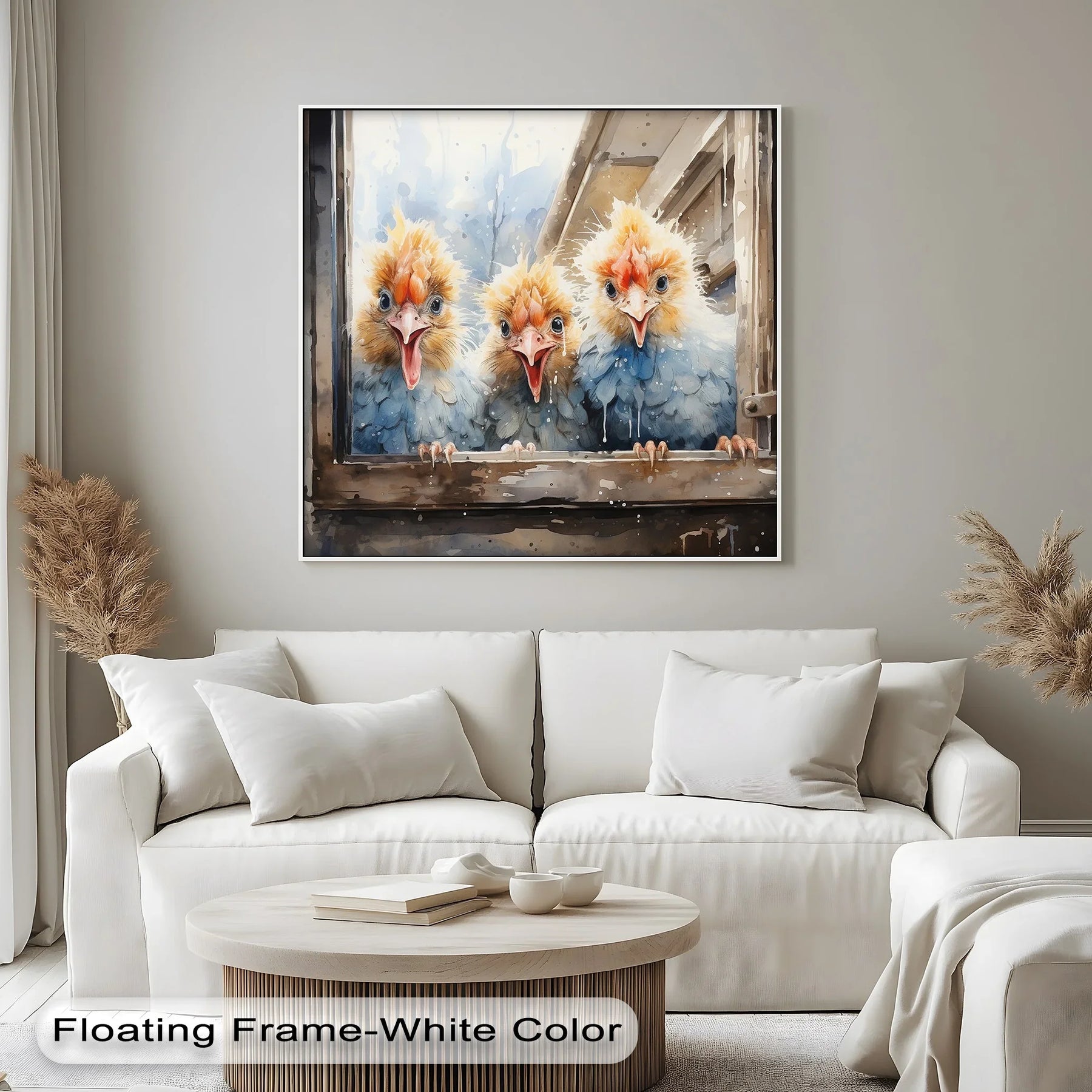 Add a touch of humor and rustic charm to your space with this playful canvas print of three wide-eyed chicks peering through a wooden window frame. Their comically expressive faces and soft, fluffy feathers bring instant joy and curiosity to any room. Perfect for farm-style kitchens, kids' rooms, or anyone who loves quirky animal art.
