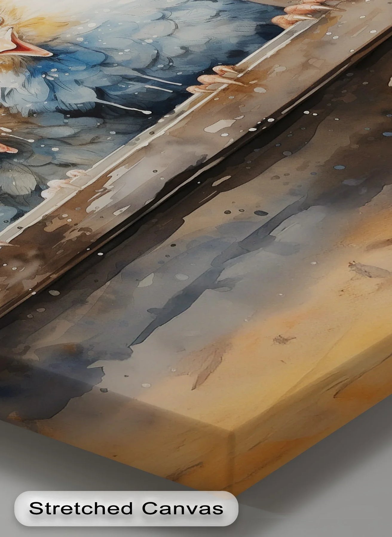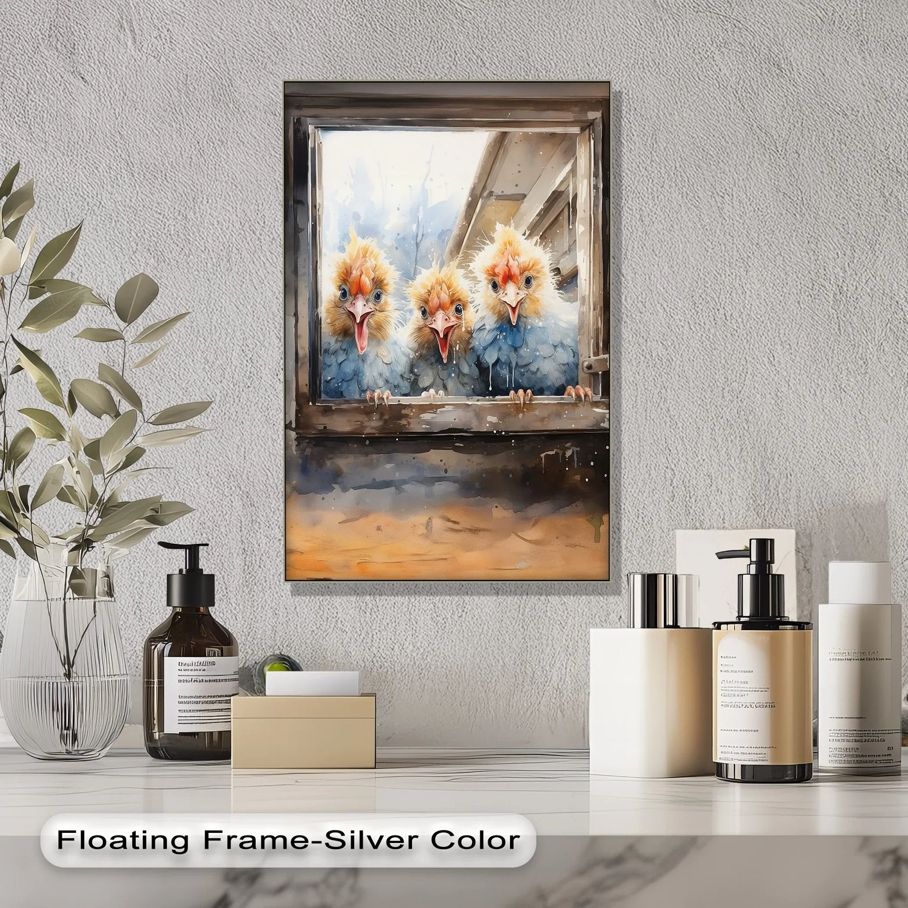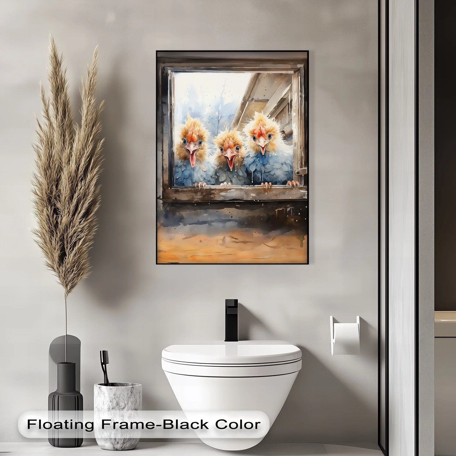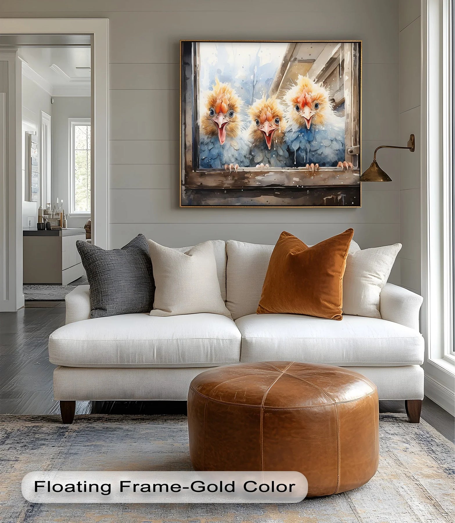 Add a touch of humor and rustic charm to your space with this playful canvas print of three wide-eyed chicks peering through a wooden window frame. Their comically expressive faces and soft, fluffy feathers bring instant joy and curiosity to any room. Perfect for farm-style kitchens, kids' rooms, or anyone who loves quirky animal art.