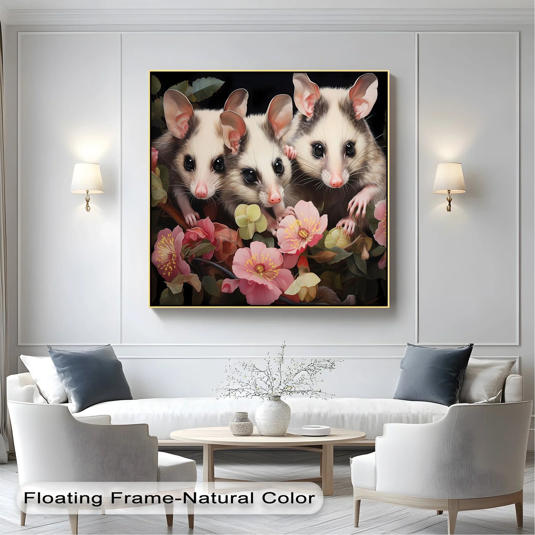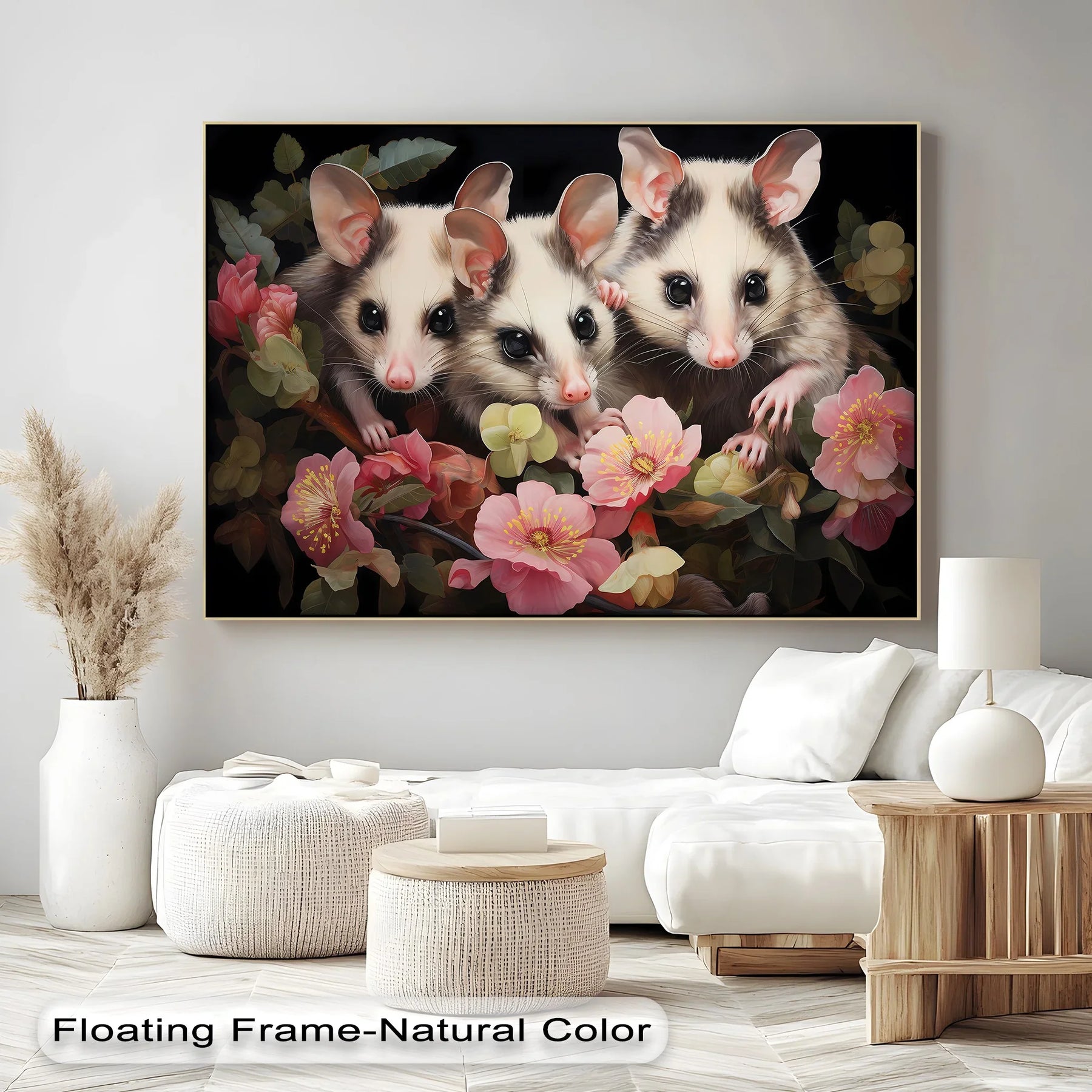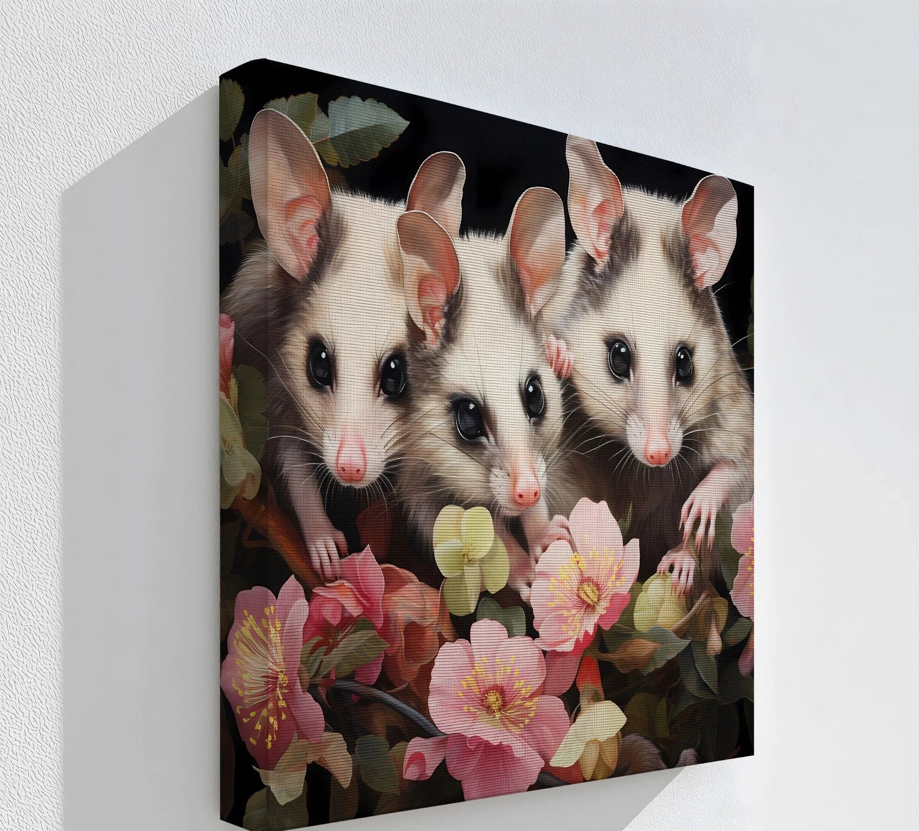 This enchanting animal canvas print captures the gentle gaze of three wide-eyed possums nestled among a cascade of pastel blossoms and deep green foliage. With their soft fur, delicate pink noses, and inquisitive expressions, these woodland creatures bring a magical charm to any interior. The dark background enhances the vivid florals and soft animal features, making it an ideal centerpiece for cozy nooks, nature-themed nurseries, or animal lovers’ art walls.